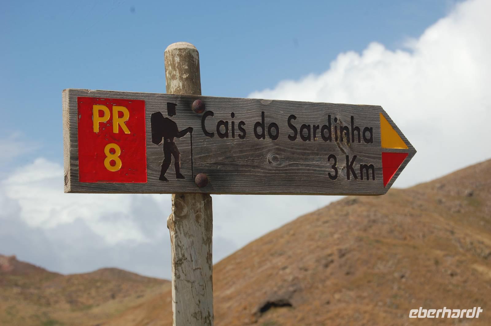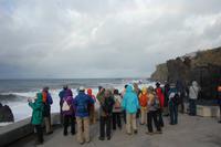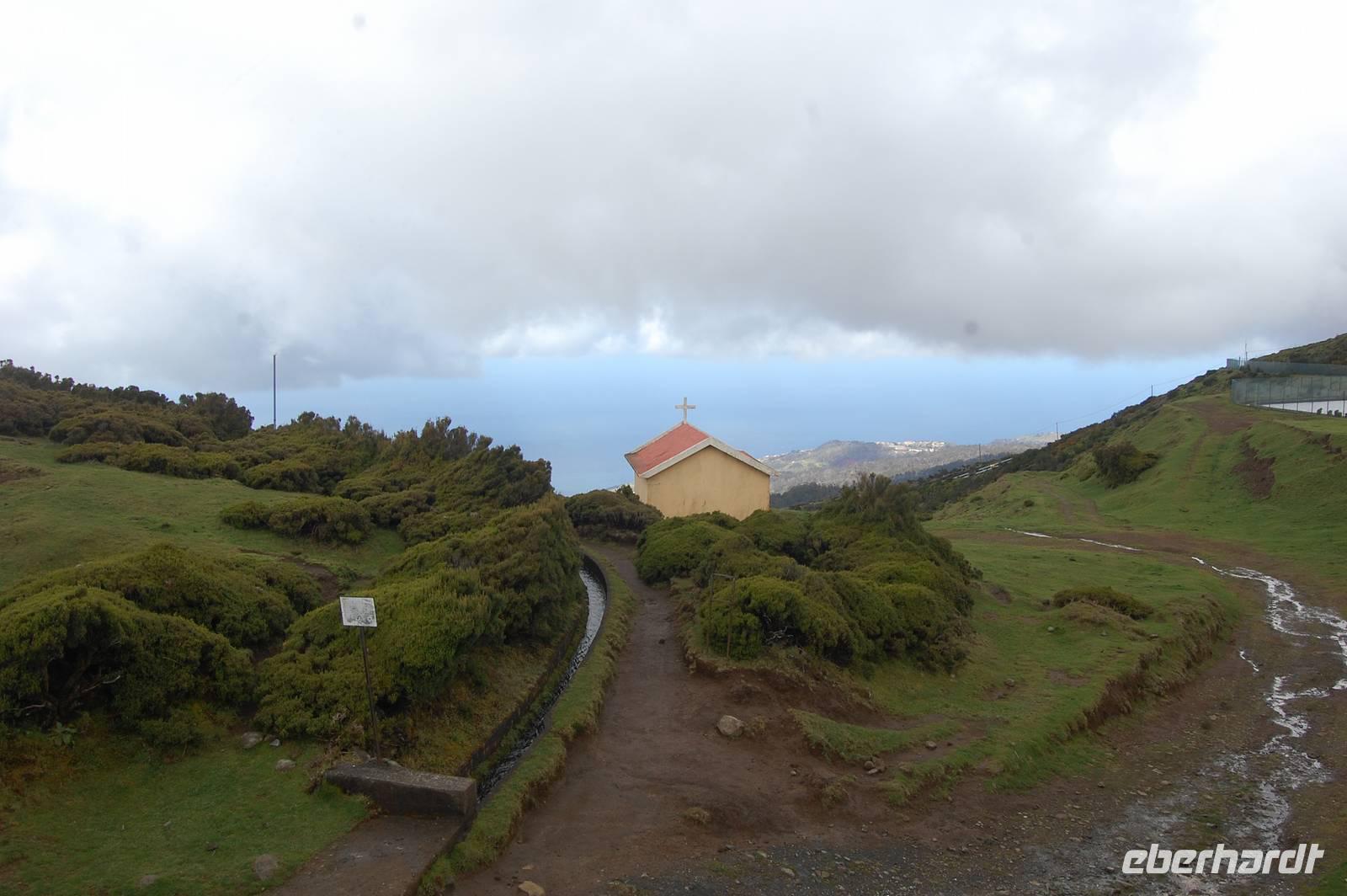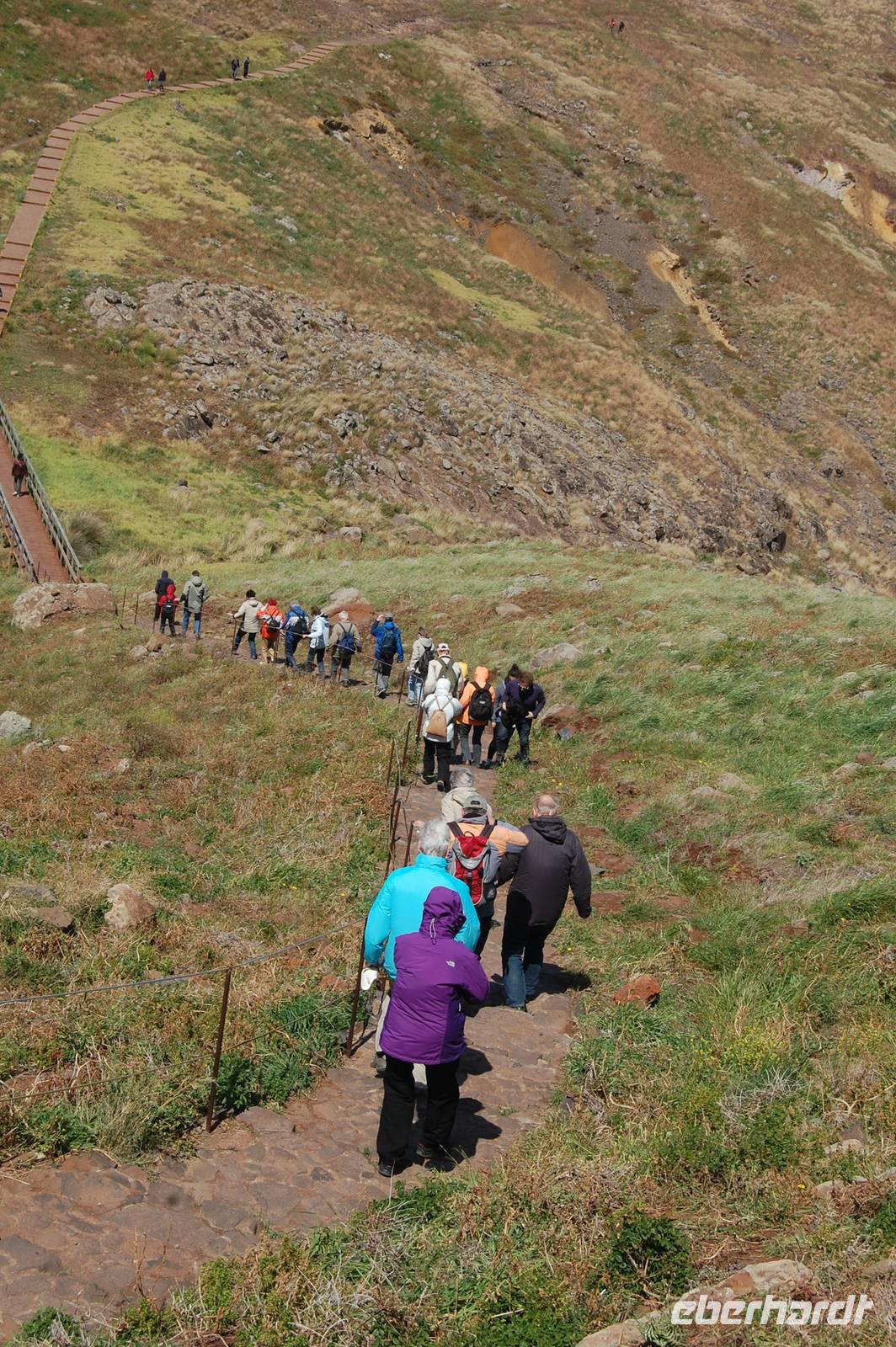 Schließlich um 11.00 Uhr starten wir von da zu unserer Levada-Wanderung. Unterwegs stoppen wir an einem Aussichtspunkt und erblicken wieder einen bunten Regenbogen, der sich über den kalten Fluss spannt. Nach insgesamt einer Stunde entlang des ebenen Wasserlaufes, gehen wir bergab zur Straße und steigen wieder in unseren Bus. Wir fahren weiter nach Santana, wo wir die für den Ort typischen, strohgedeckten Häuser anschauen. Nach einer kleinen individuellen Mittagspause im Ort starten wir 13.45 Uhr. Leider ist wegen des nächtlichen Schneefalls die Passstraße zum Pico do Ruivo gesperrt. Fatima schlägt eine alternative Wanderung zur östlichsten Spitze der Insel, „Ponta de Sao Lourenco", vor. Wir gehen bei prächtigem Sonnenschein los und durchqueren ein kleines Tal. Wenig später blicken wir auf die tosende See und können gleichzeitig die Nord- und Süd-Küste sehen. Ein mächtiger Nordwind treibt dicke Regenwolken heran, die sich plötzlich in einem waagerechten Regenguss entleeren. Wir sind binnen Minuten nass und haben Mühe, bei dem Sturm stehen zu bleiben. So entschließen wir uns zur Umkehr.