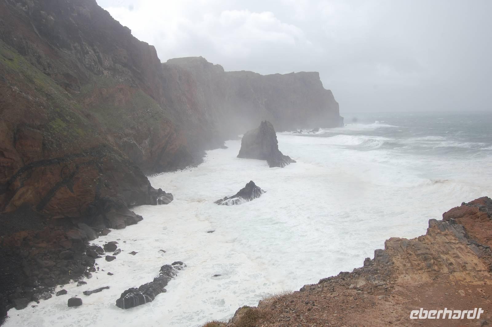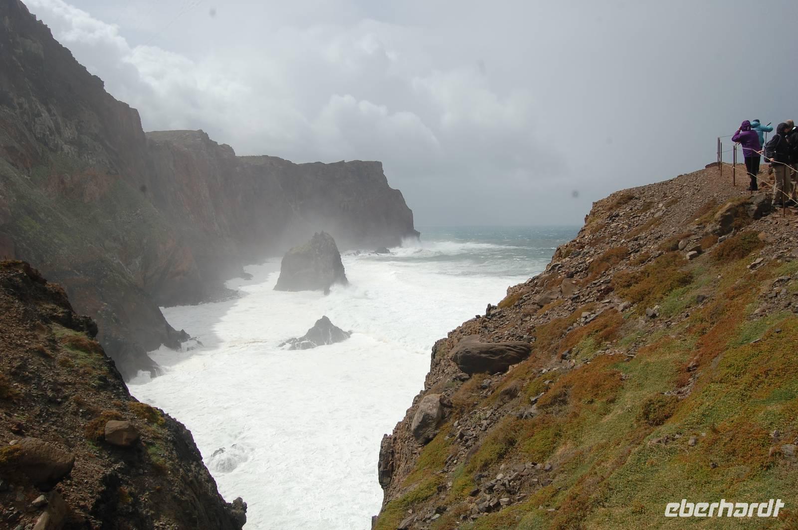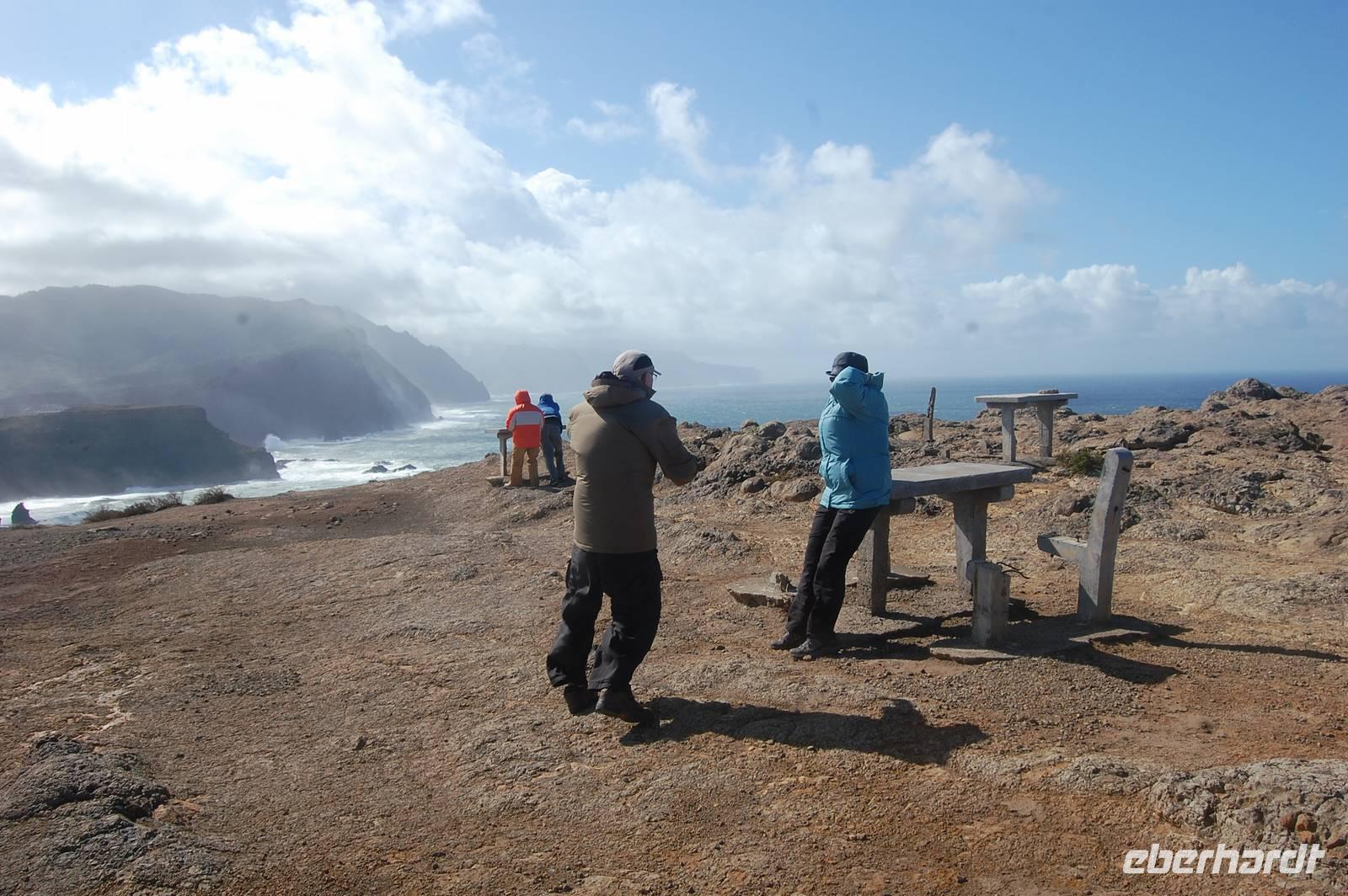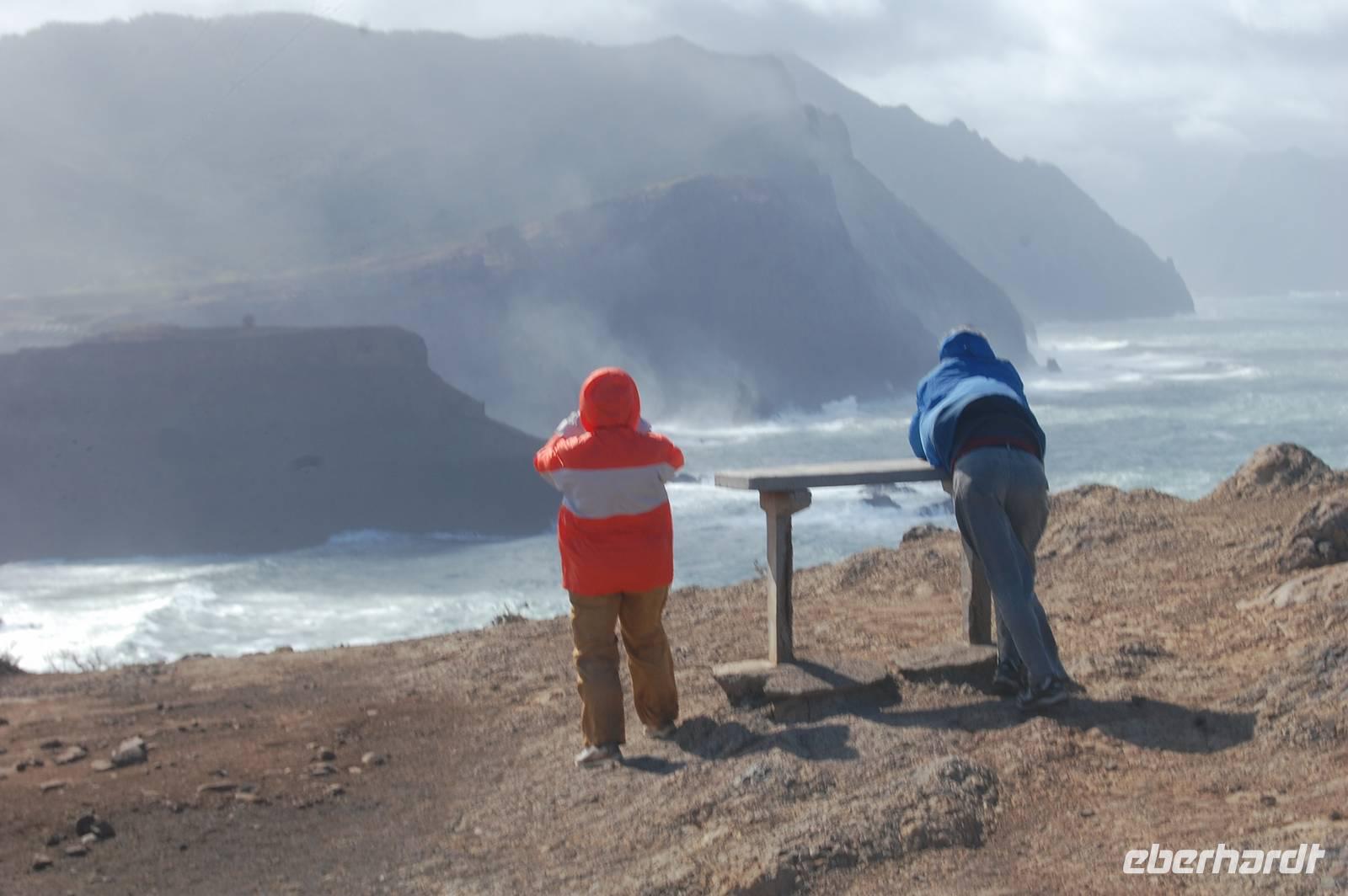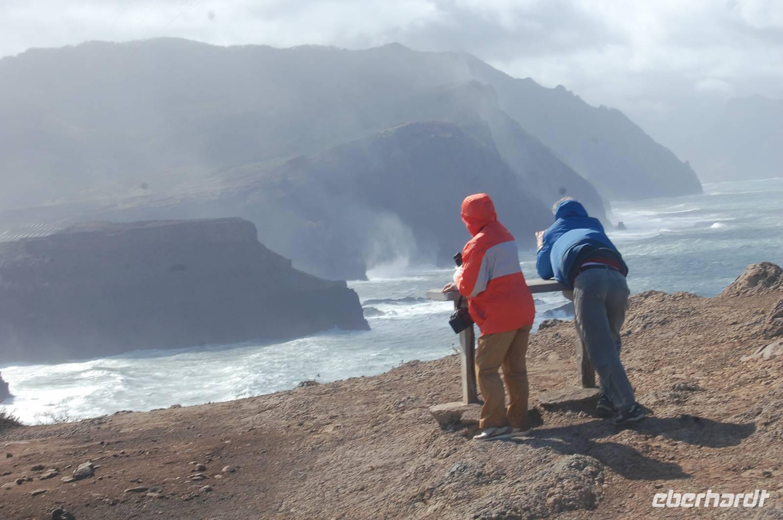Weiter geht die Fahrt zu einem Aussichtspunkt an der Nordküste „Ponta de Rosto". Dort trotzen wir ein letztes Mal dem tobenden Sturm. In der Ferne sehen wir, dass die wütende See das Wasser so an die Klippen peitscht, dass es dort von unten nach oben regnet.