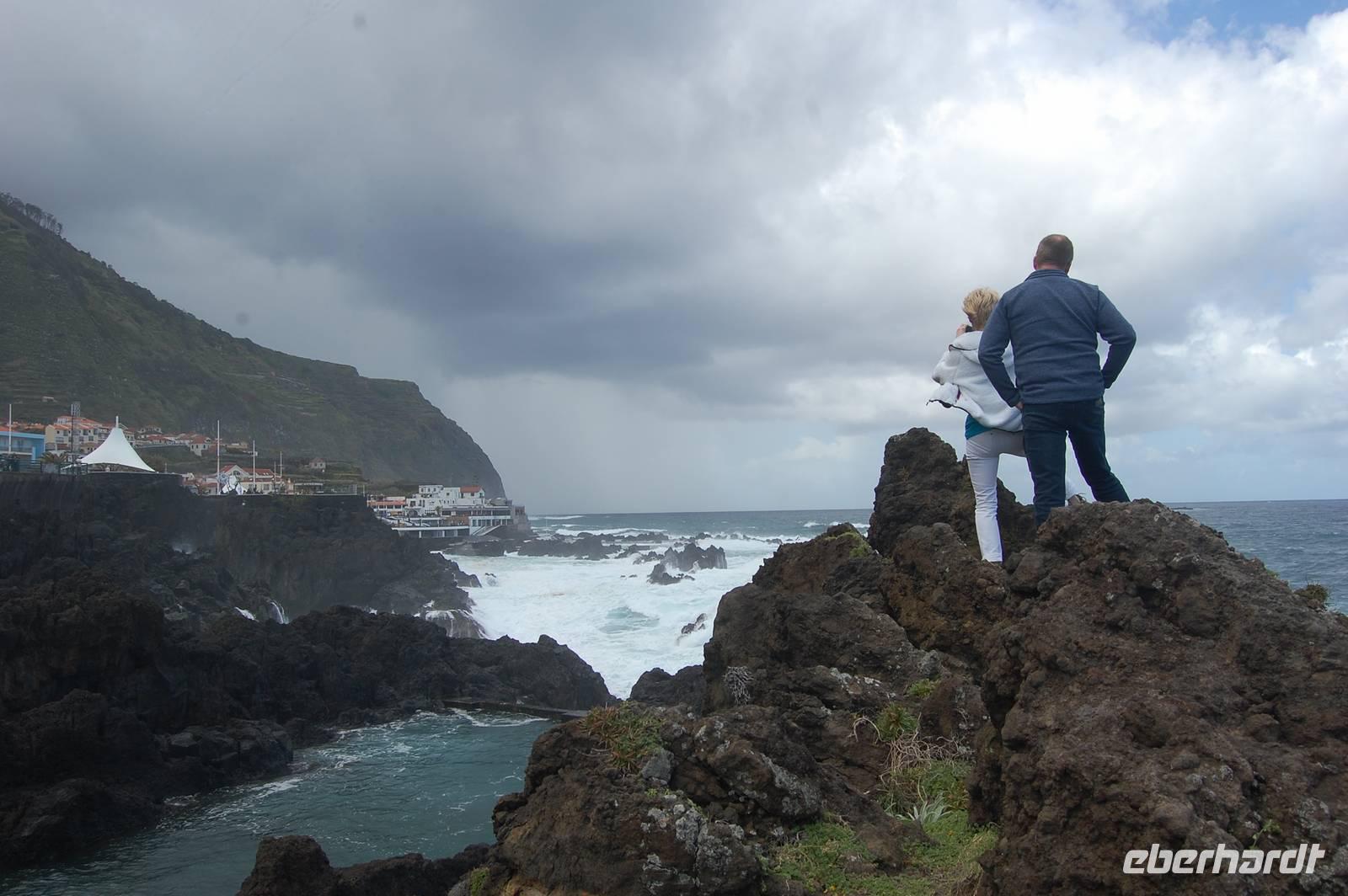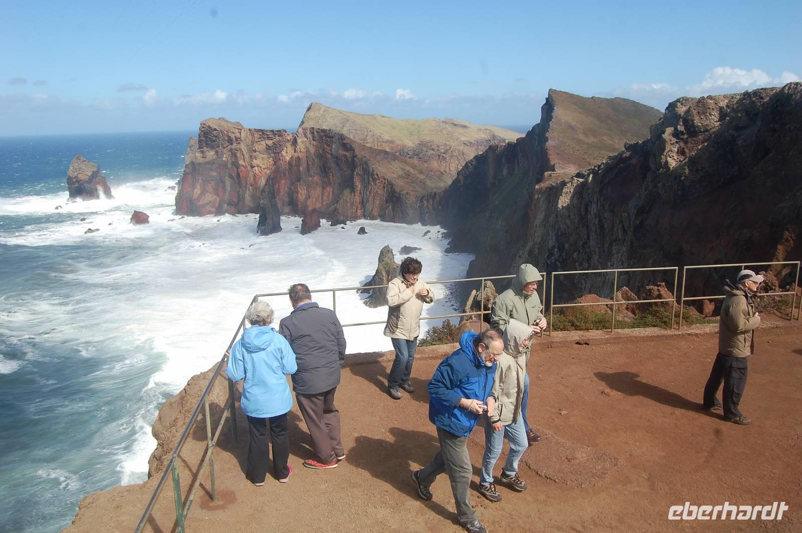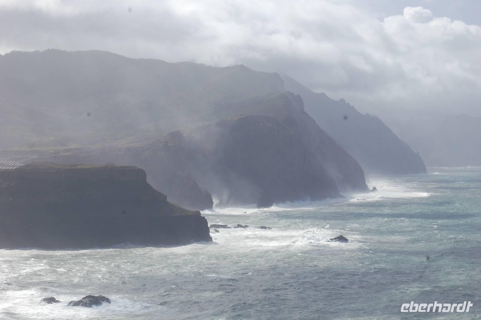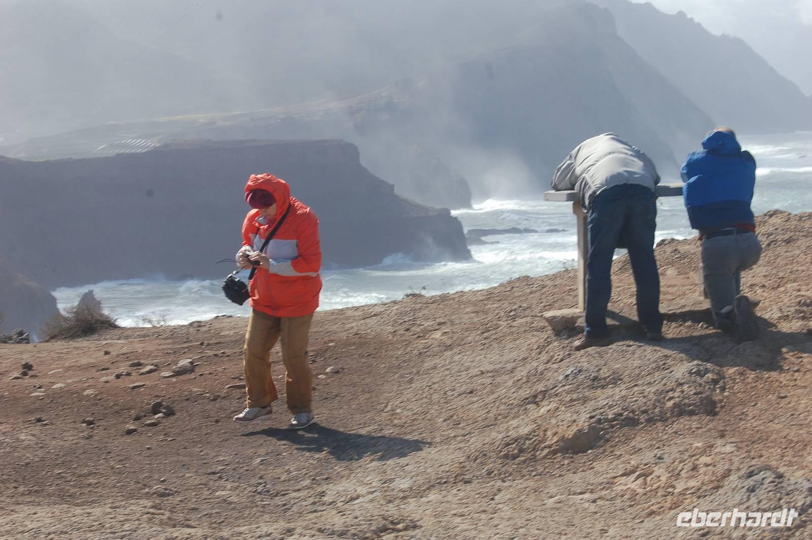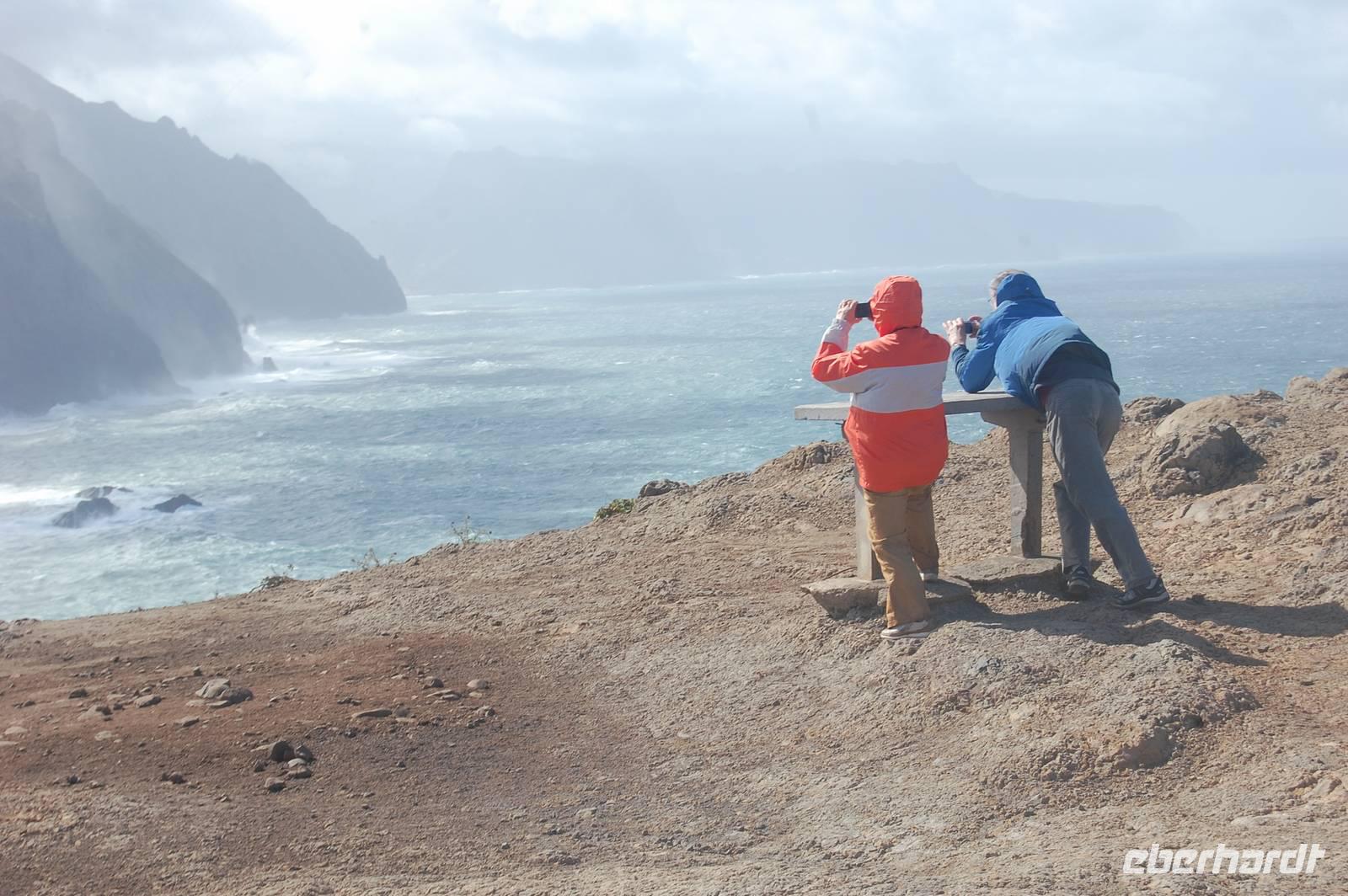 Weiter geht die Fahrt zu einem Aussichtspunkt an der Nordküste „Ponta de Rosto". Dort trotzen wir ein letztes Mal dem tobenden Sturm. In der Ferne sehen wir, dass die wütende See das Wasser so an die Klippen peitscht, dass es dort von unten nach oben regnet.