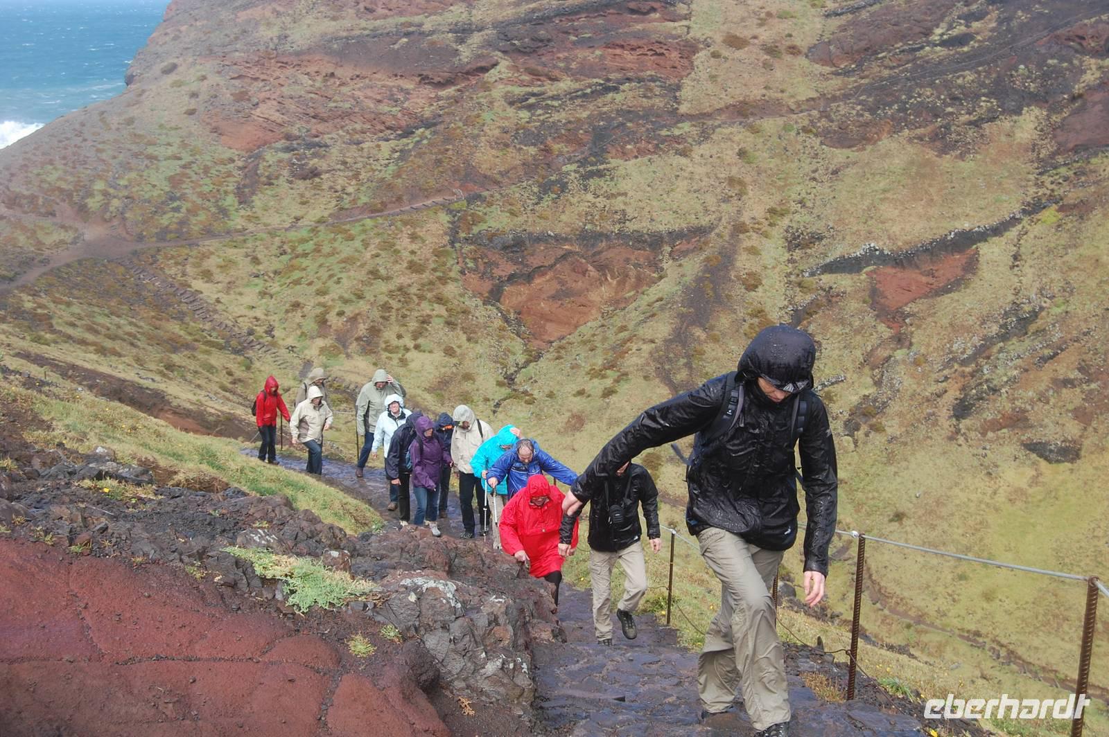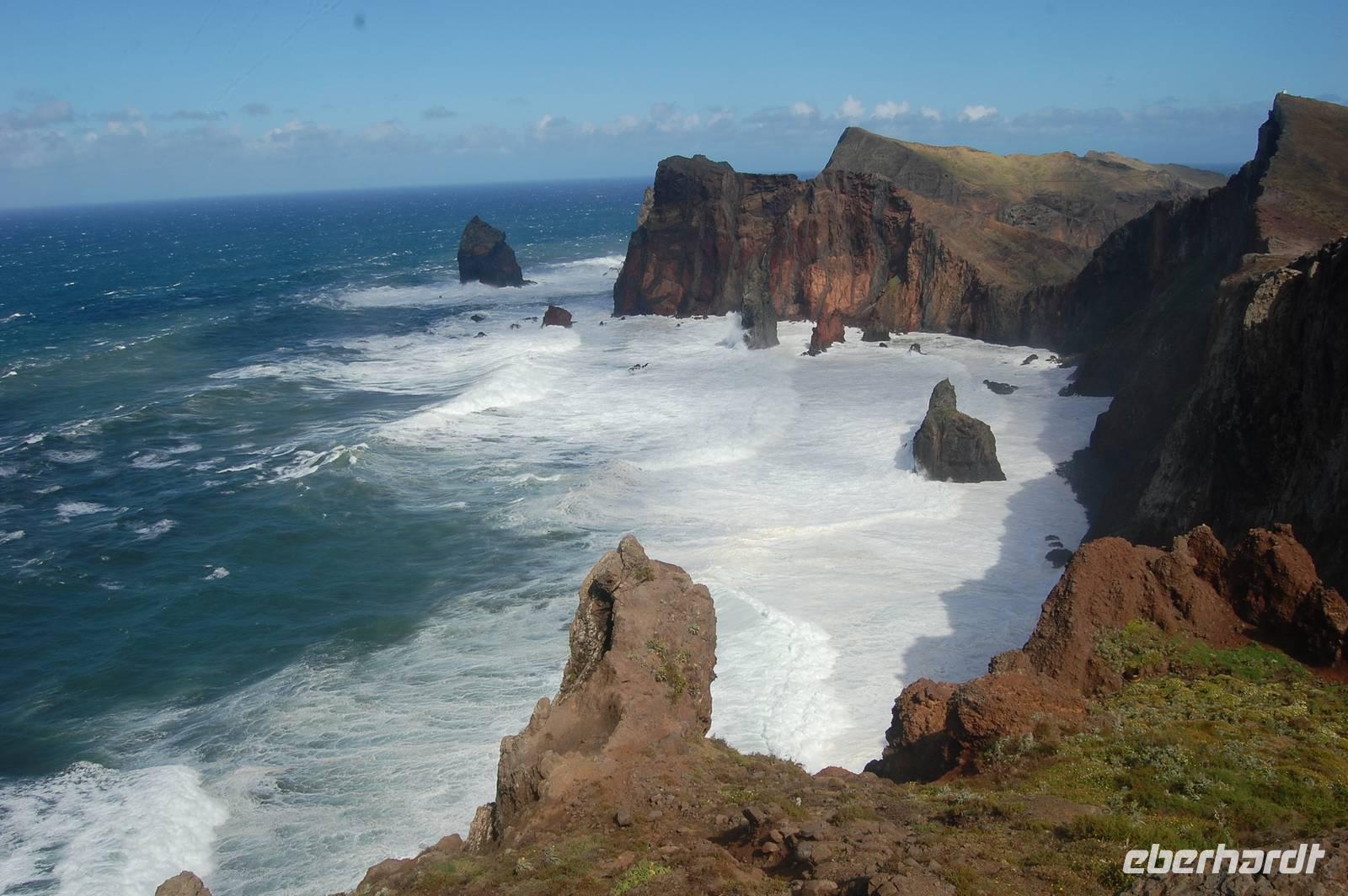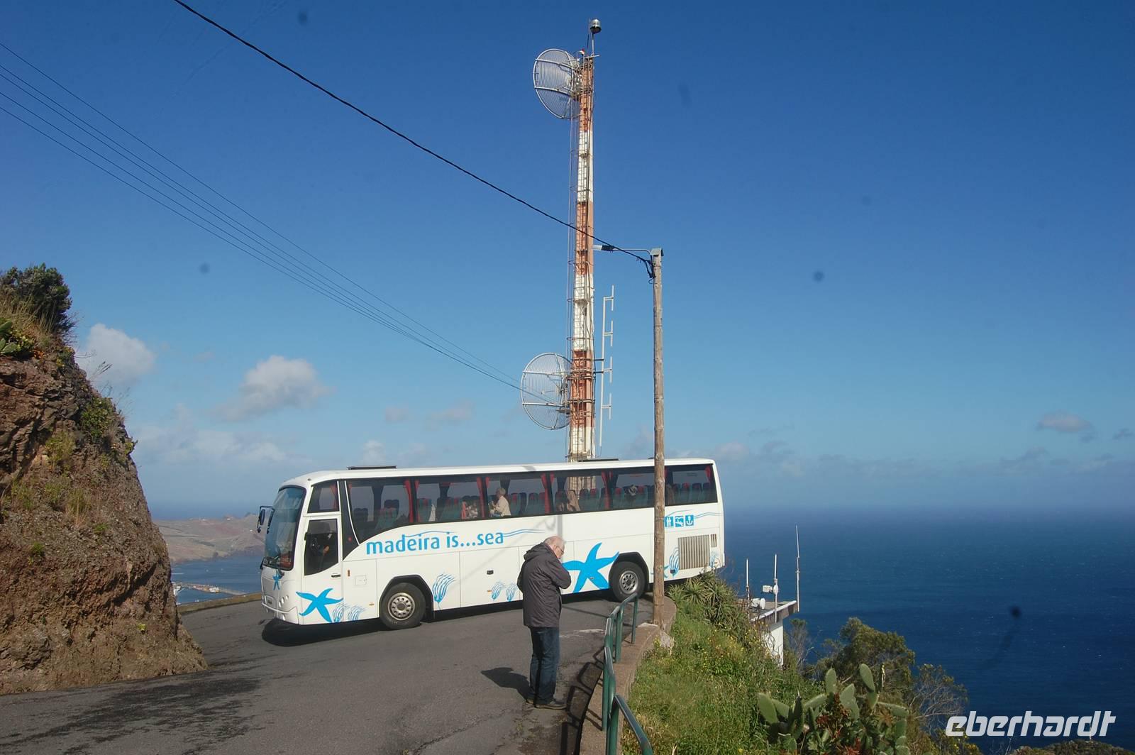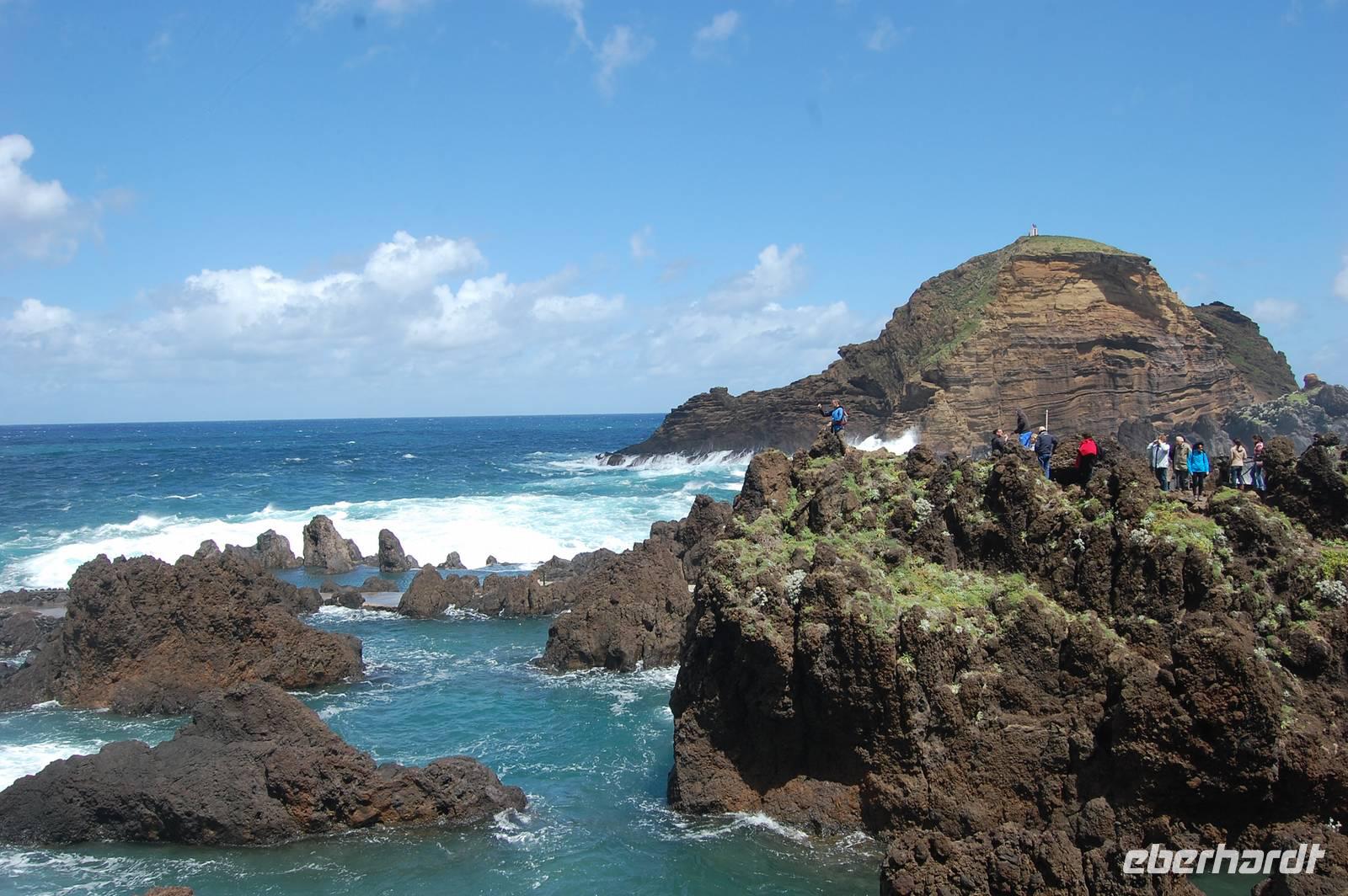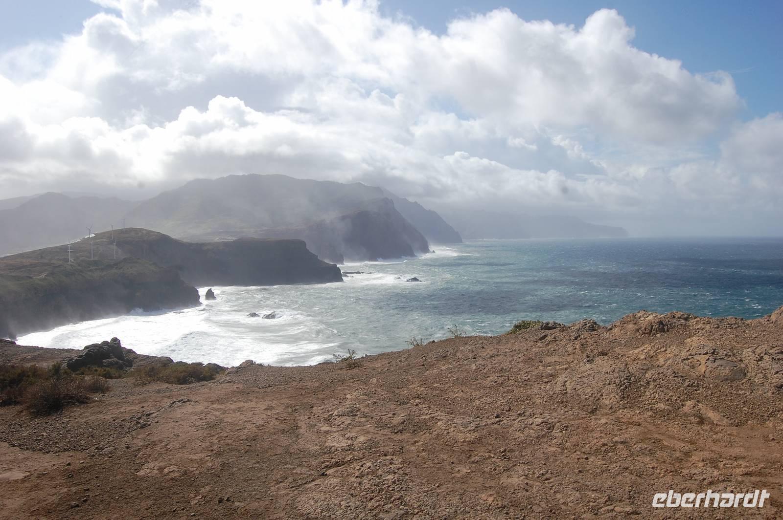 Weiter geht die Fahrt zu einem Aussichtspunkt an der Nordküste „Ponta de Rosto". Dort trotzen wir ein letztes Mal dem tobenden Sturm. In der Ferne sehen wir, dass die wütende See das Wasser so an die Klippen peitscht, dass es dort von unten nach oben regnet.