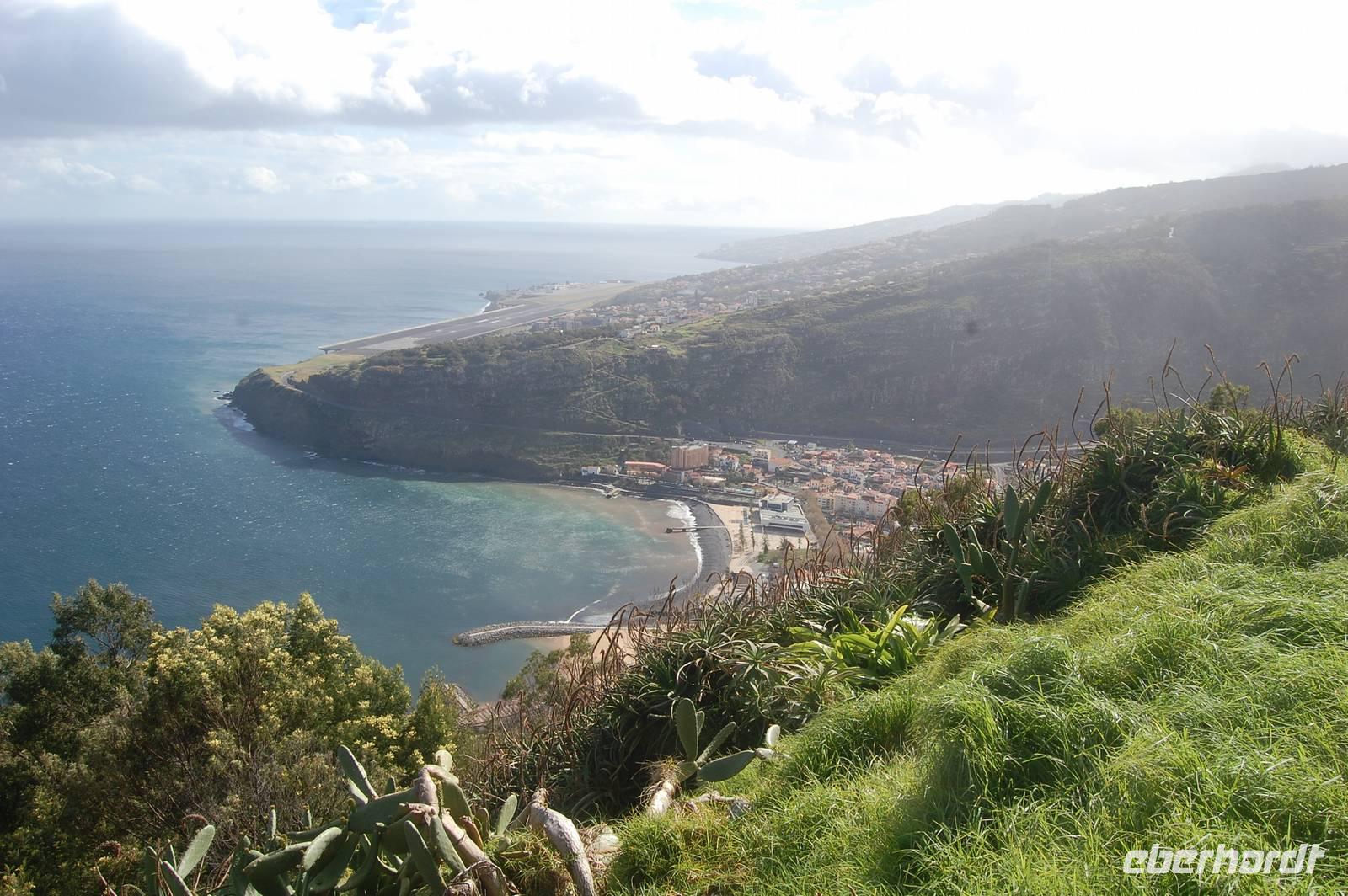 Anschließend bringt uns der Bus über sehr schale Straßen zu einem weiteren Aussichtspunkt mit einem fantastischen Blick auf die Ortschaft Machico und auf die Landebahn des Flughafens. Tatsächlich landet gerade eine Maschine auf der 2.700 m kurzen Piste.