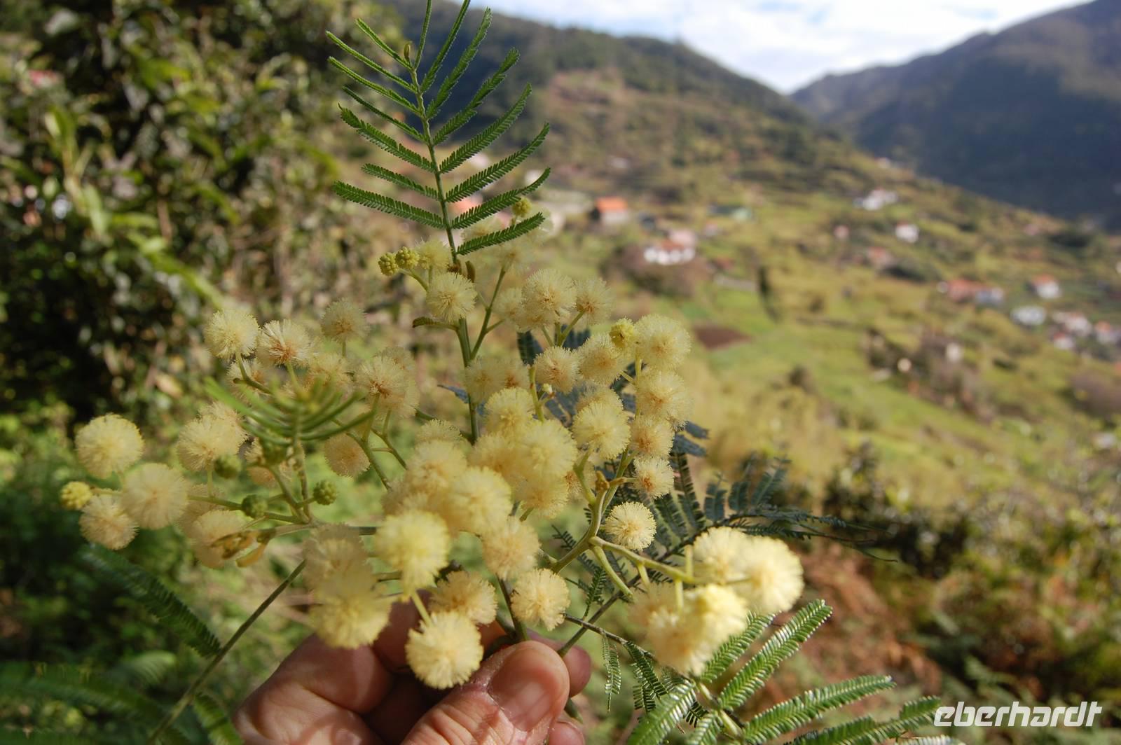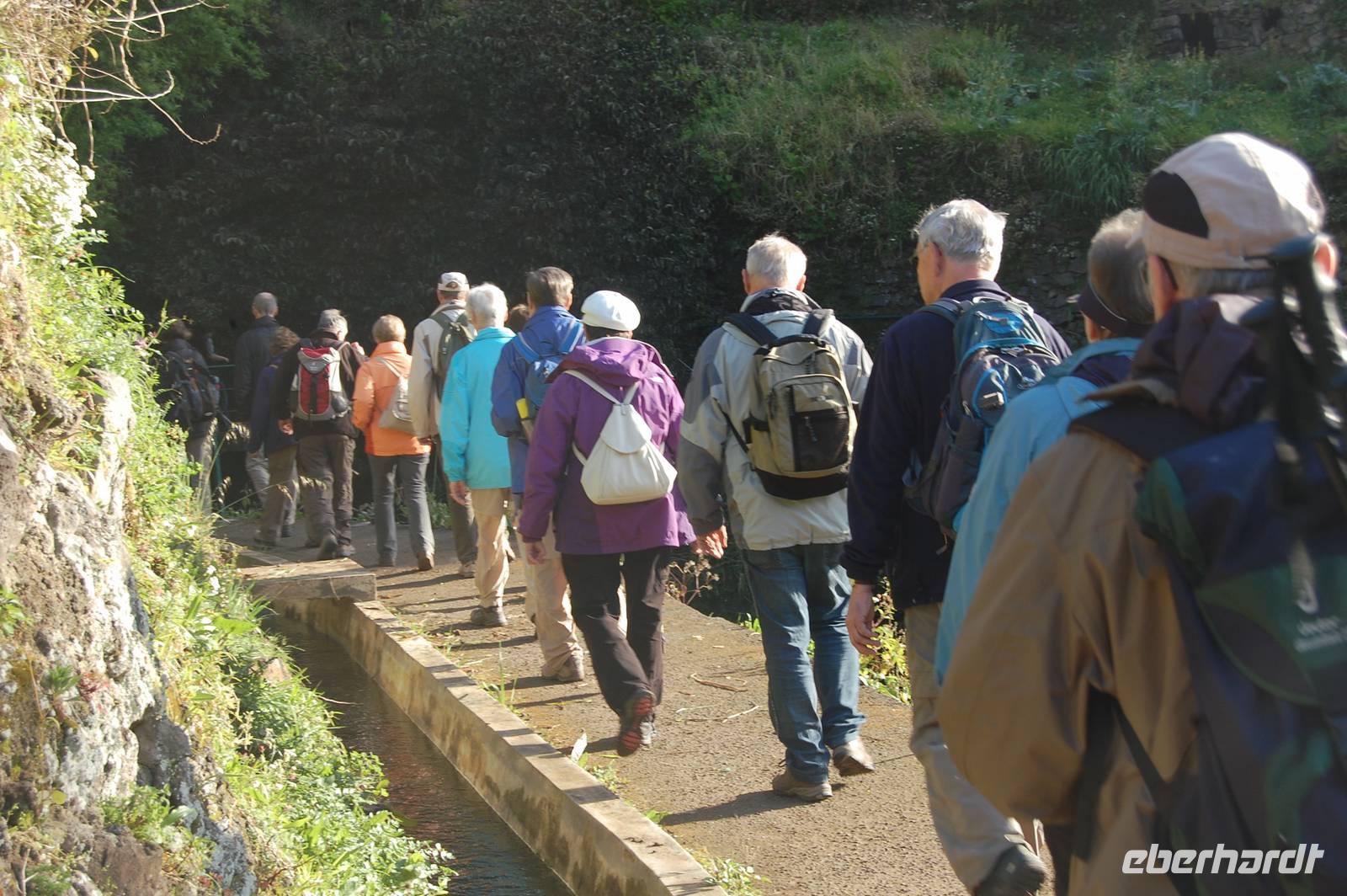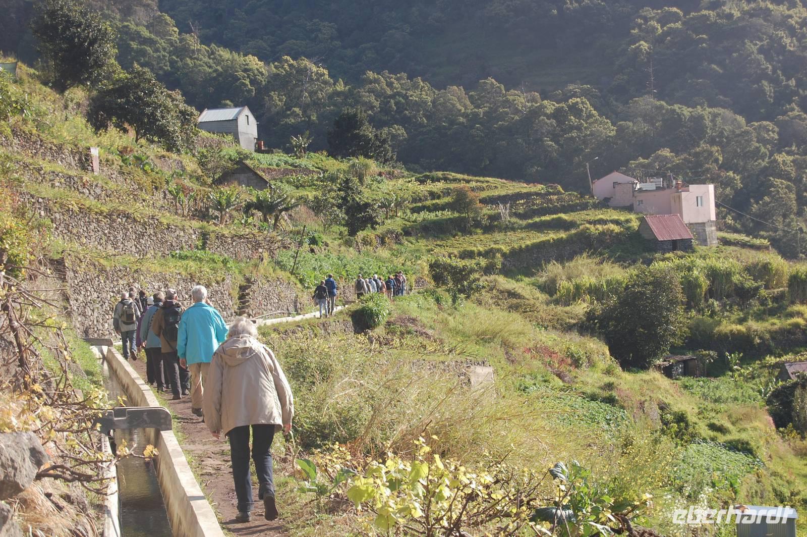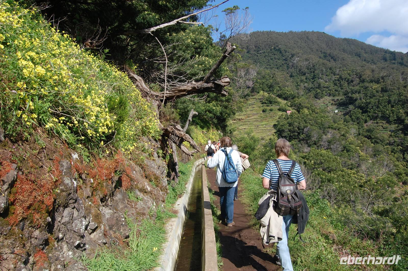 Wieder treffen wir uns alle nach dem Frühstück um 09.00 Uhr zur Abfahrt Richtung Osten, um in einem Tal bei Marocos an einem künstlichen Wasserlauf (Levada) zu starten. Um 09:30 Uhr geht es ohne Steigung immer entlang des kleinen Bewässerungskanals durch kleine Ortschaften. Im Gänsemarsch und in halber Höhe am Hang spazieren wir bei tollem Sonnenschein zwei Stunden. Fatima erläutert immer wieder die Pflanzenwelt. Die Luft wird erfüllt vom Duft der Blüten der unzähligen Mimosenbäume. Wir erhalten Einblicke in das schwierige Leben der Bergbevölkerung der Insel. Am Ende der heutigen Etappe genießen wir die Sonne und einen Kaffee im Außenbereich einer kleinen Bar. Um 12.30 Uhr steigen wir hinab ins Tal, wo der Bus im Ort bereits auf uns wartet. Nach einer kurzen Fahrt durch Machico, der ehemaligen Inselhauptstadt Madeiras, sind wir um 13.00 Uhr wieder im Hotel und genießen die Sonne am Pool oder im herrlichen Garten der Hotelanlage.