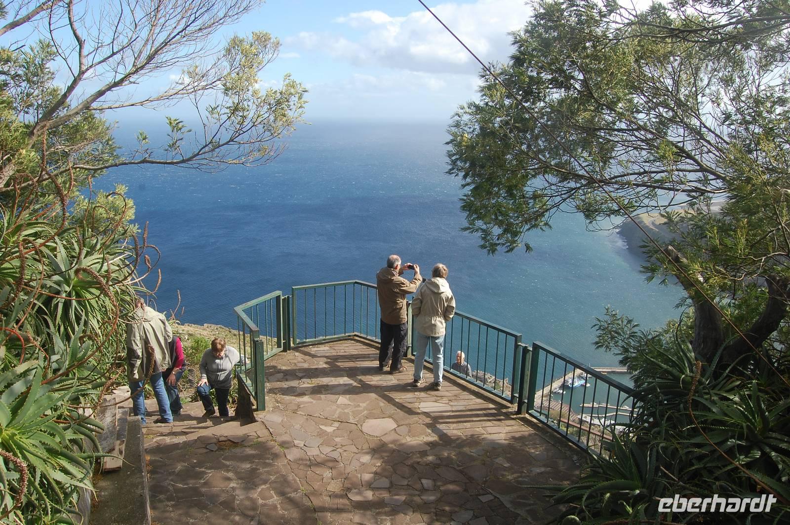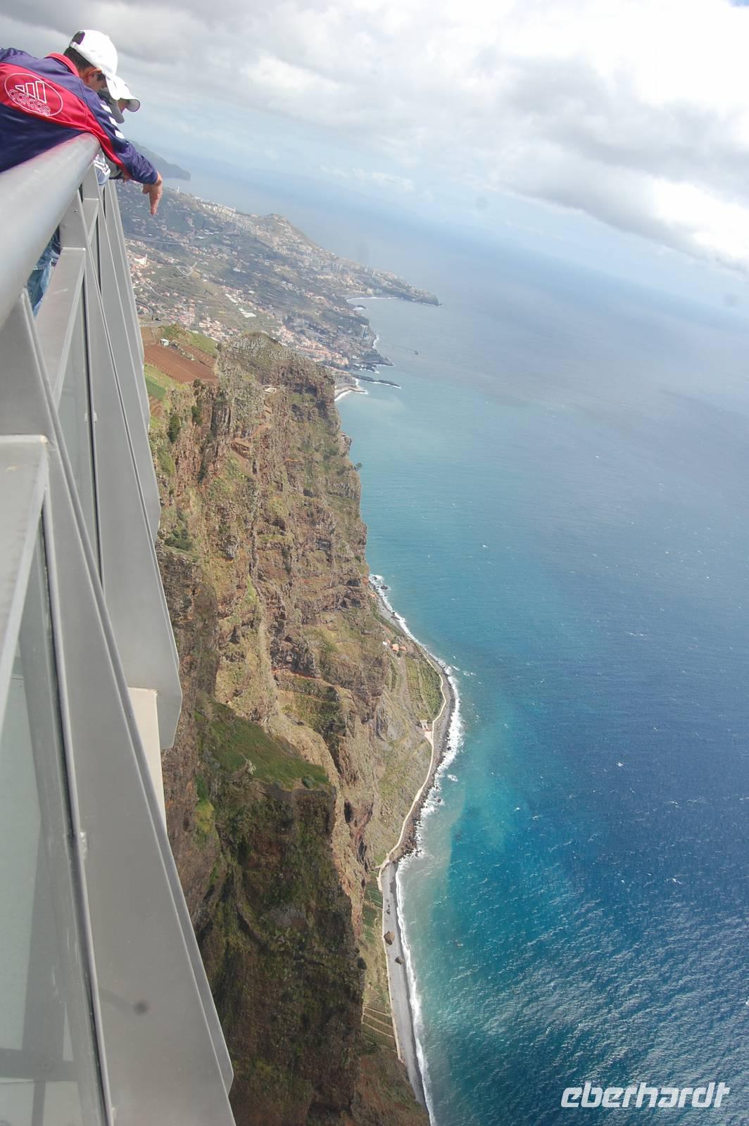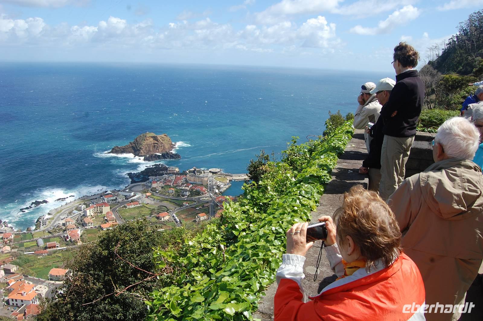 Um 13.00 Uhr verlassen wir die verträumte Ortschaft, um uns nun mit dem Bus endlose Serpentinen hinauf zu quälen. Wir blicken auf die steile Terrassenlandschaft, die mit unzähligen Bananenpflanzen und Zuckerrohr bebaut ist, hinab zum Meer und kommen schließlich zum modernen Aussichtspunkt auf der höchsten Steilklippe Europas, „Cabo Girao". Auf einer Glasplattform kann man 580 m in die Tiefe schauen. Nach diesem herrlichen Ausblick über die Küste bis hin nach Funchal, nehmen wir ein kleines Frucht-Picknick ein und stoßen mit einem Passionsfrucht-Likör an.
