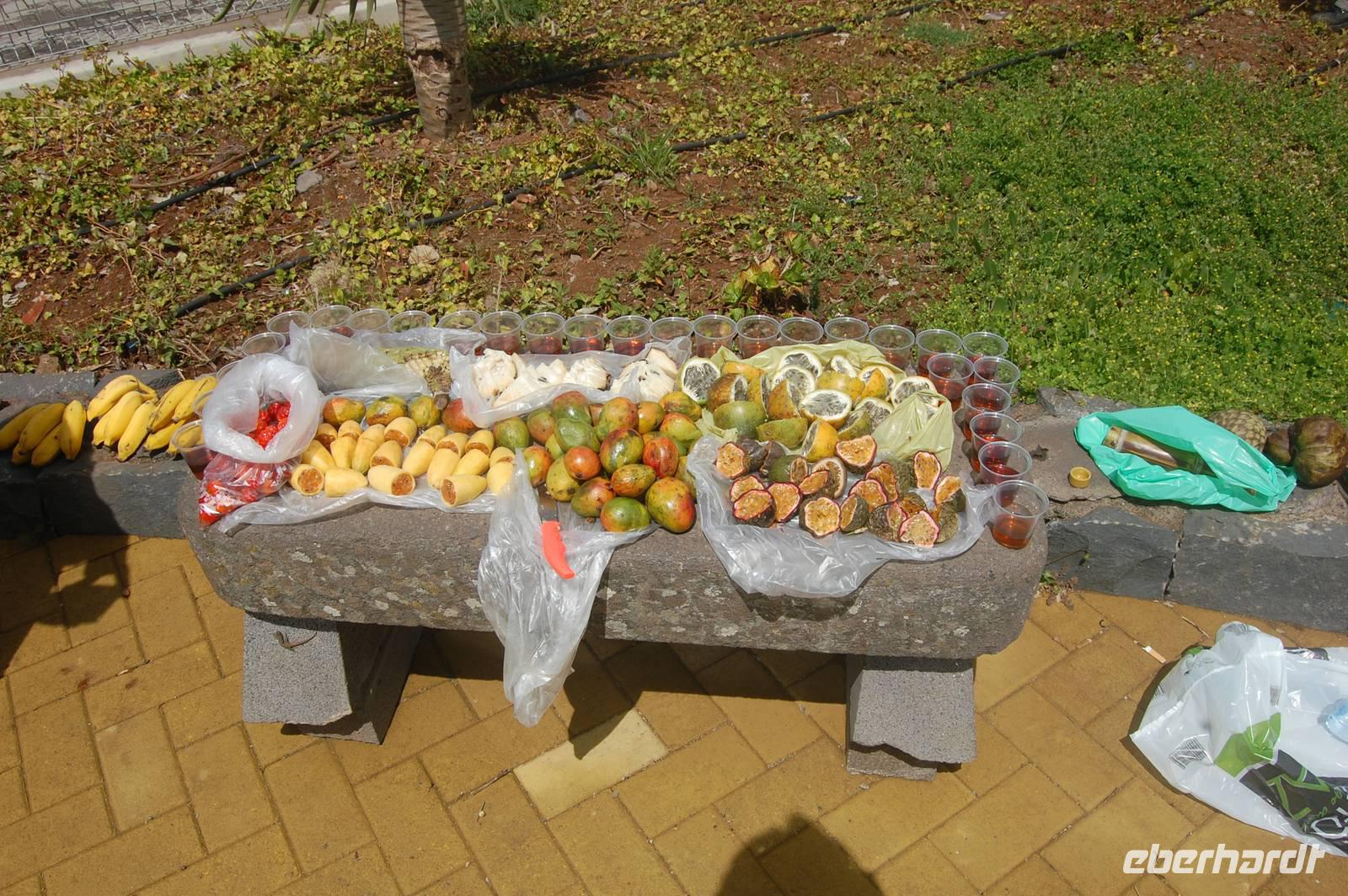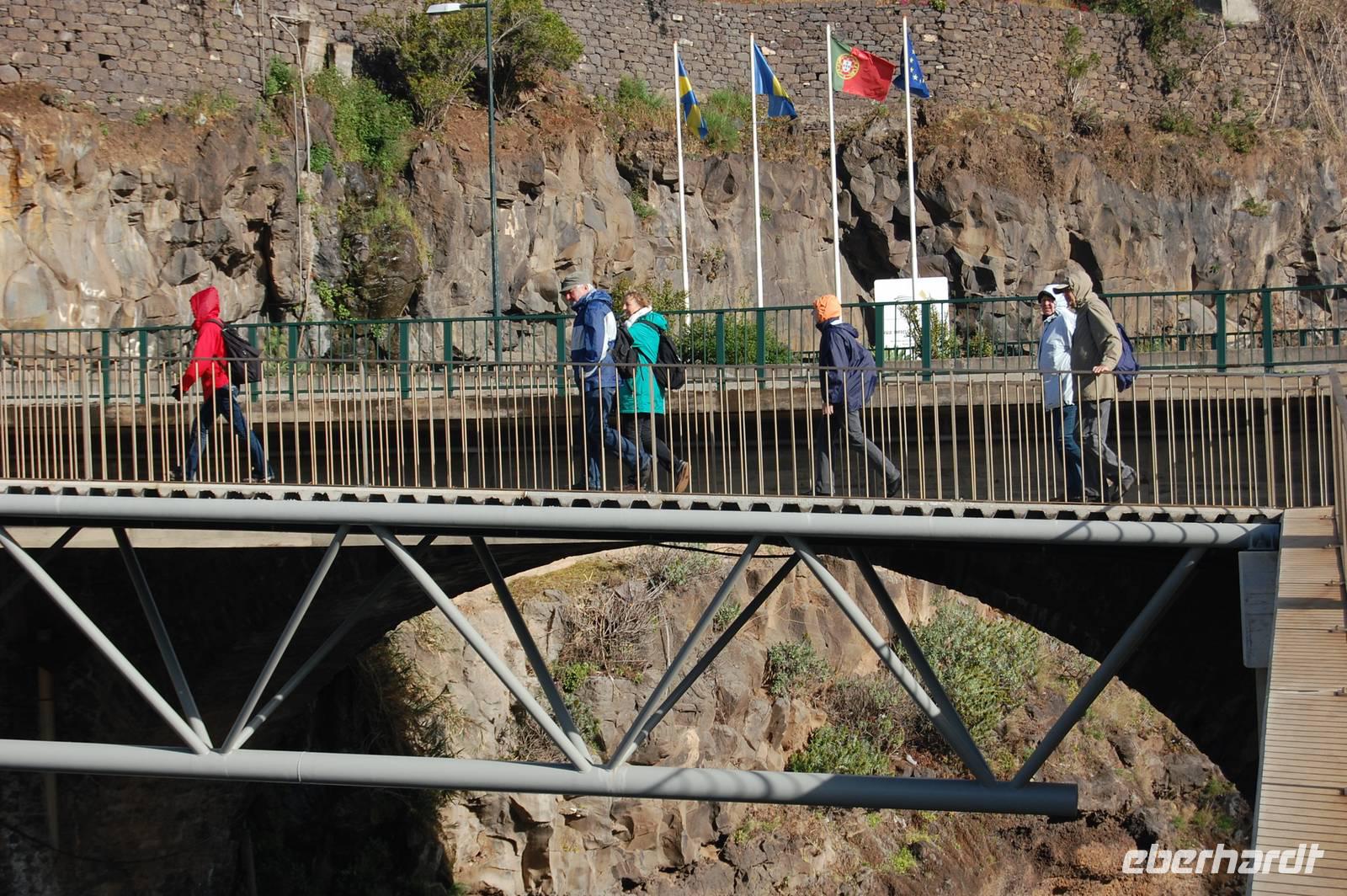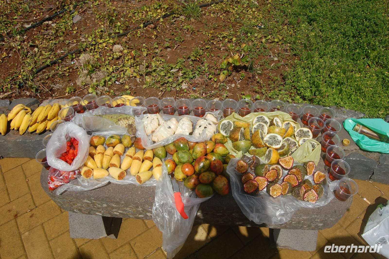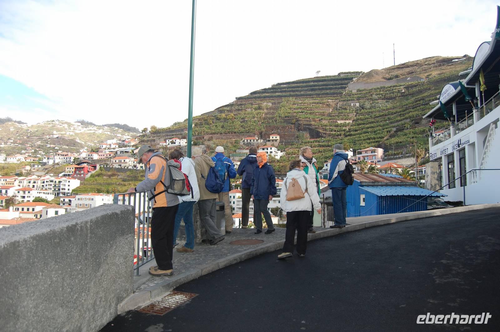 Um 13.00 Uhr verlassen wir die verträumte Ortschaft, um uns nun mit dem Bus endlose Serpentinen hinauf zu quälen. Wir blicken auf die steile Terrassenlandschaft, die mit unzähligen Bananenpflanzen und Zuckerrohr bebaut ist, hinab zum Meer und kommen schließlich zum modernen Aussichtspunkt auf der höchsten Steilklippe Europas, „Cabo Girao". Auf einer Glasplattform kann man 580 m in die Tiefe schauen. Nach diesem herrlichen Ausblick über die Küste bis hin nach Funchal, nehmen wir ein kleines Frucht-Picknick ein und stoßen mit einem Passionsfrucht-Likör an.