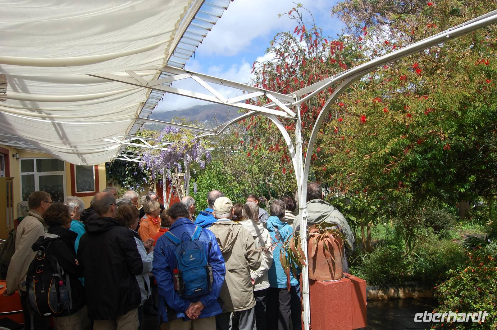 Nach unserer Ankunft auf Madeira treffen wir in der Ankunftshalle des Airports Funchal einen Reiseleiter unserer Partneragentur, der uns nach einer kurzen Begrüßung zum Bus bringt. Schon nach 20 Minuten kommen wir im gebuchten Hotel „Quinta Splendida" in Canico an und werden in einen Besprechungsraum gebeten. Dort werden wir mit einem Glas Madeirawein empfangen. Der Mitarbeiter unserer Partneragentur erläutert uns nun den Ablauf der gesamten Reise. Bereits um 11.30 Uhr sind wir mit allen Formalitäten fertig und haben etwas Zeit, die paradiesische Gartenanlage des Hotels in Augenschein zu nehmen. An der Poolbar des Hotels bekommen wir einen Kaffee und können dann endlich die wunderschönen Appartements beziehen, die wie kleine Ferienwohnungen im blühenden Garten verstreut sind. Nach einer Mittagspause treffen wir uns um 16:00 Uhr, um den kleinen Ort Canico zu erkunden und den Supermarkt im Shopping-Center der Stadt aufzusuchen. Zum gemeinsa-men Abendessen verabreden wir uns um 18 Uhr und gehen nur wenige Schritte zum Restaurant „A Lareia". Obwohl es freie Auswahl an Speisen gibt, entscheiden wir uns fast alle, den typischen Degenfisch zu probieren. Dazu bekommen wir gelbe Lupinenkerne und warmes Knoblauchbrot gereicht. Nach diesem langen Tag fallen alle satt und müde in die weichen Hotelbetten.