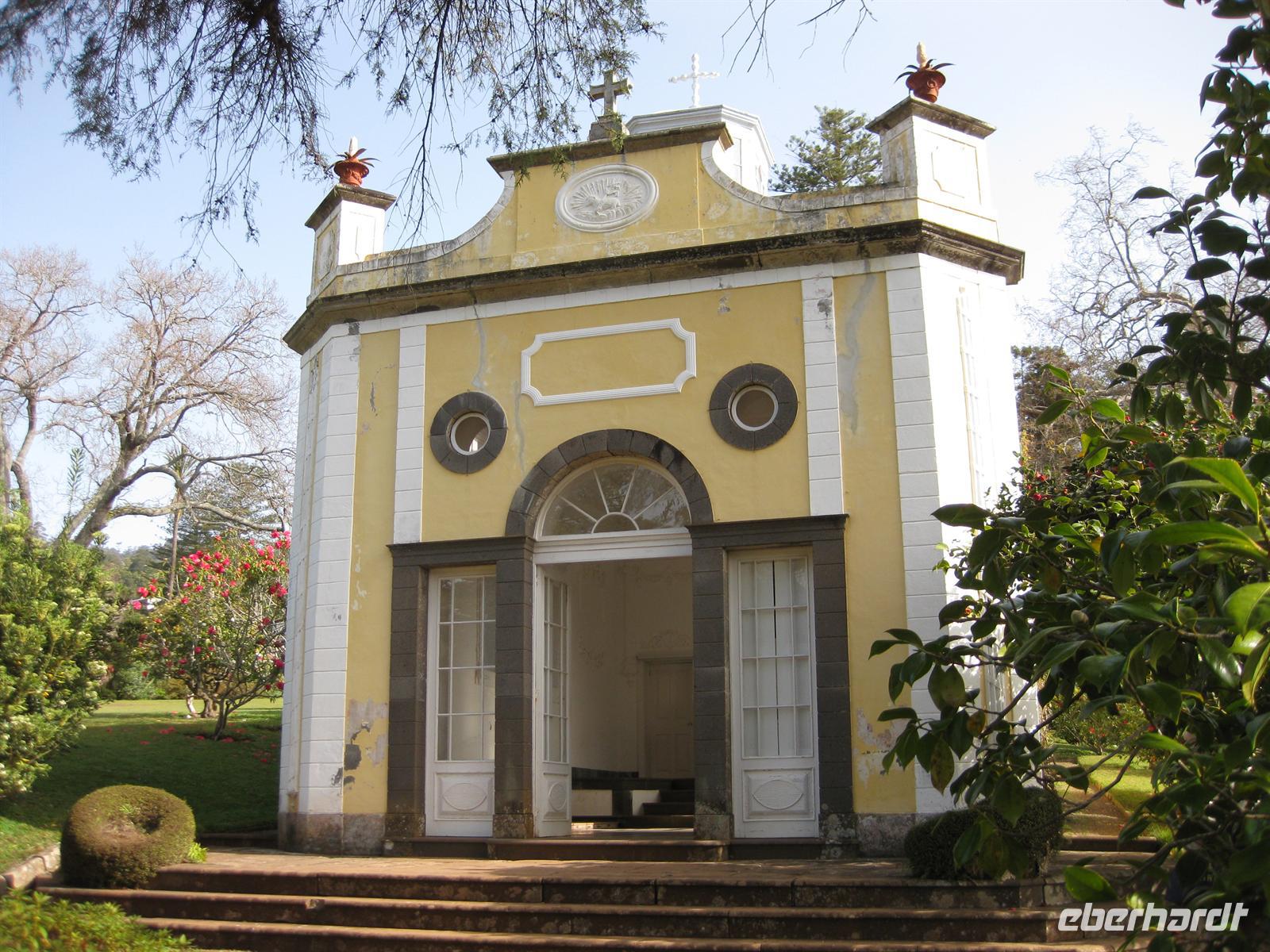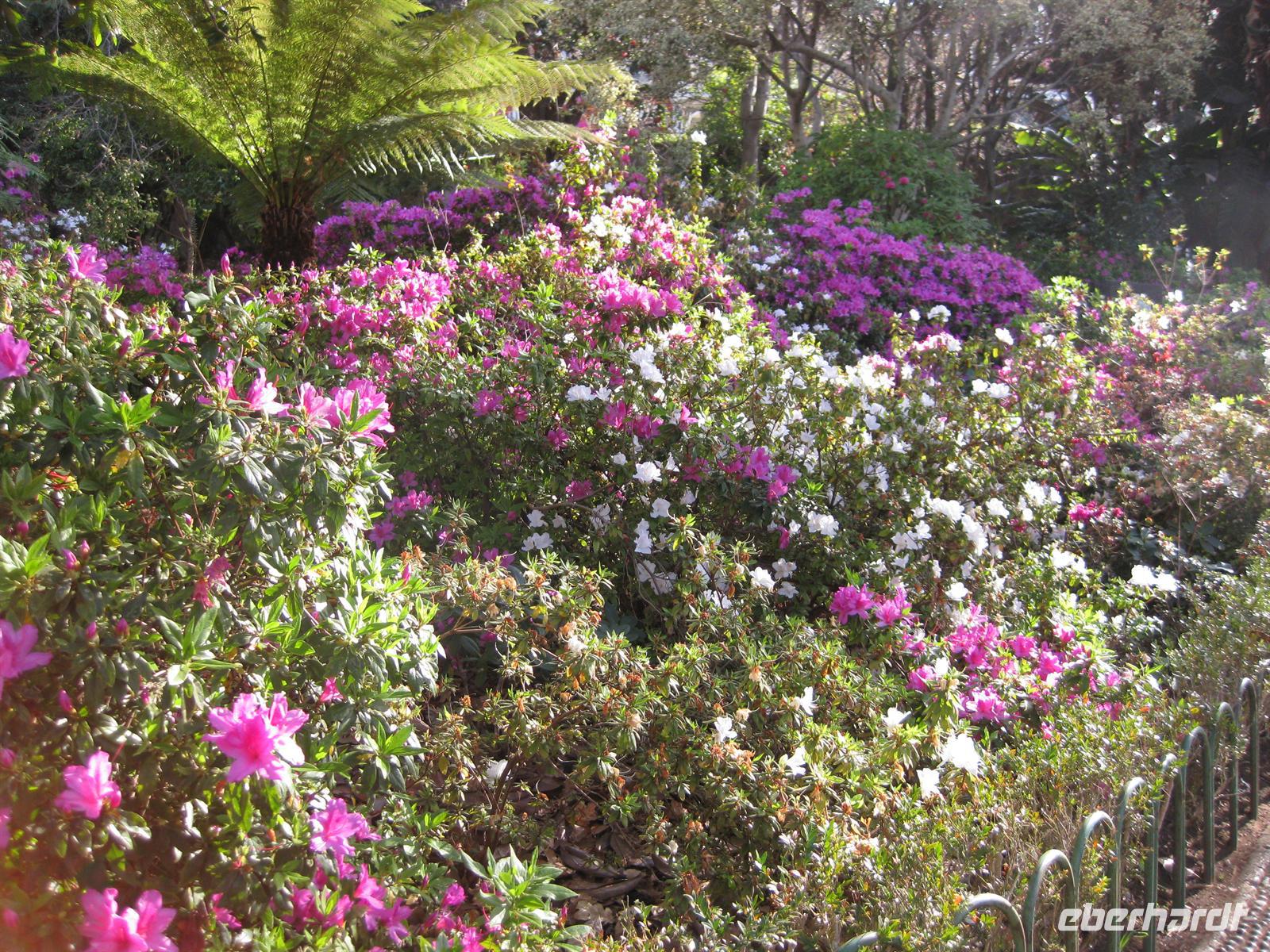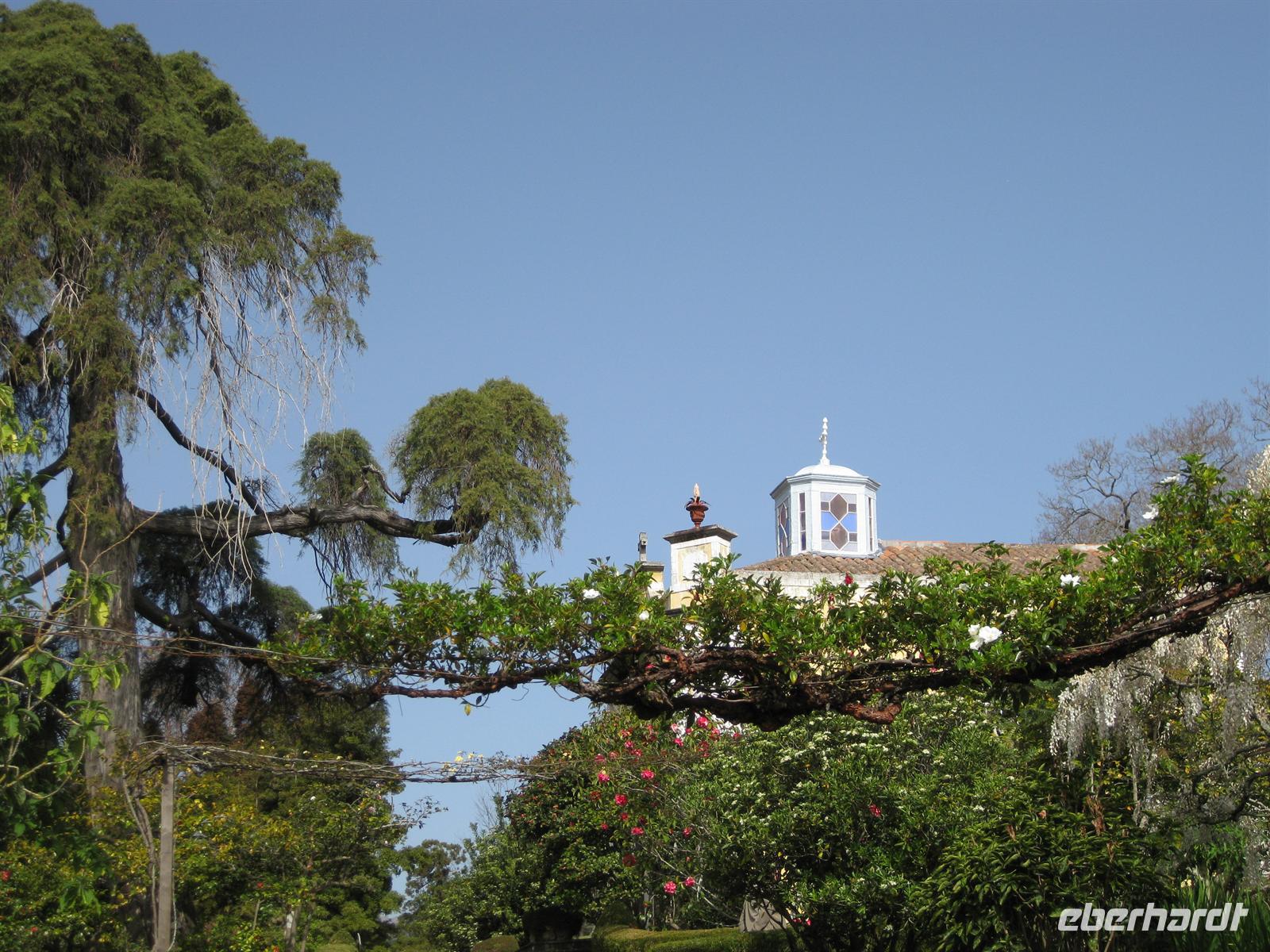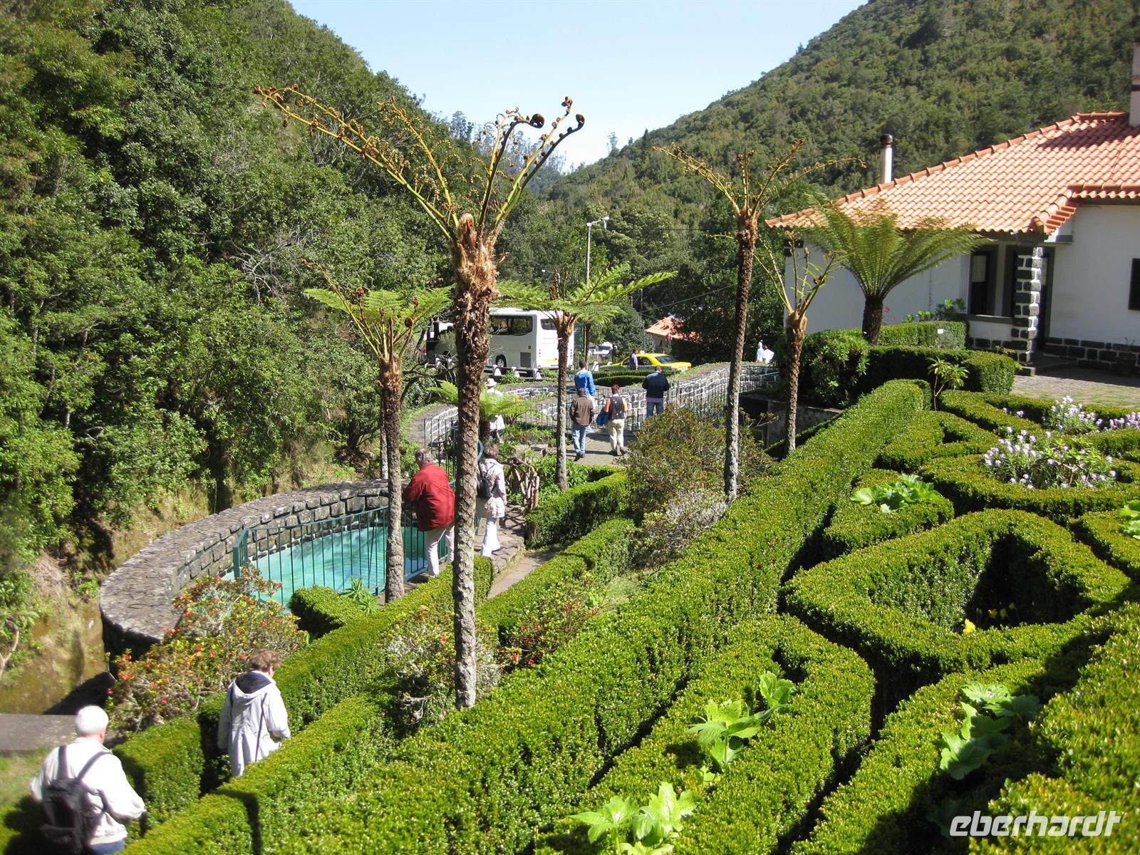 Madeirensern auch Palheiro Gardens genannt, unser erstes Ziel. Vom Eingang führt der Weg an hunderten weiß bis dunkelrot blühenden Kamelienbäumen vorbei in den Park. Auf dem Areal befindet sich ein Herrenhaus, das von den Besitzern noch bewohnt ist. Der daran unmittelbar angrenzende Park ist für die Besucher nicht zur Besichtigung frei gegeben. Das übrige Gelände steht für die Besucher offen. Es beherbergt einen wunderschön angelegten Park mit vielen einheimischen Blumen, Planzen und Bäumen, aber auch mit exotischen. Helena führt uns durch den Park. Sie erläutert uns die Geschichte und sie zeigt und erklärt uns die verschiedenen Pflanzen. Im Garten befinden sich auch eine kleine Kapelle und ein Teehaus, in dem man einkehren kann. Gleich neben dem Park befindet sich das Golf-Hotel und der Golfplatz. Dieses Areal gehörte früher mit zu Blandy's Garden. Nachdem sich alle satt gesehen haben, spazieren wir wieder zum Bus.