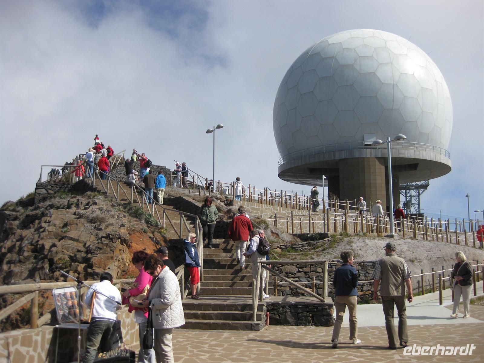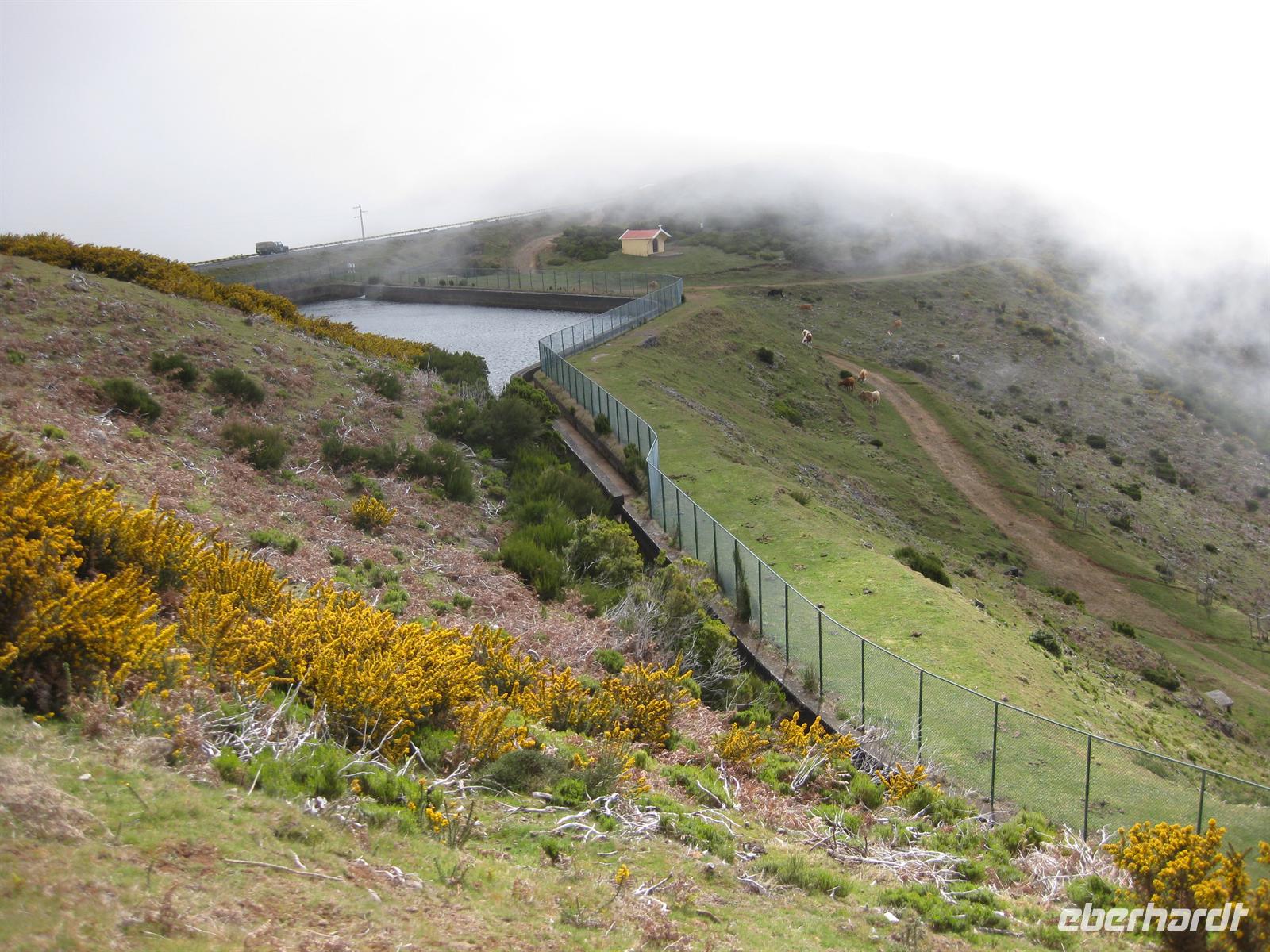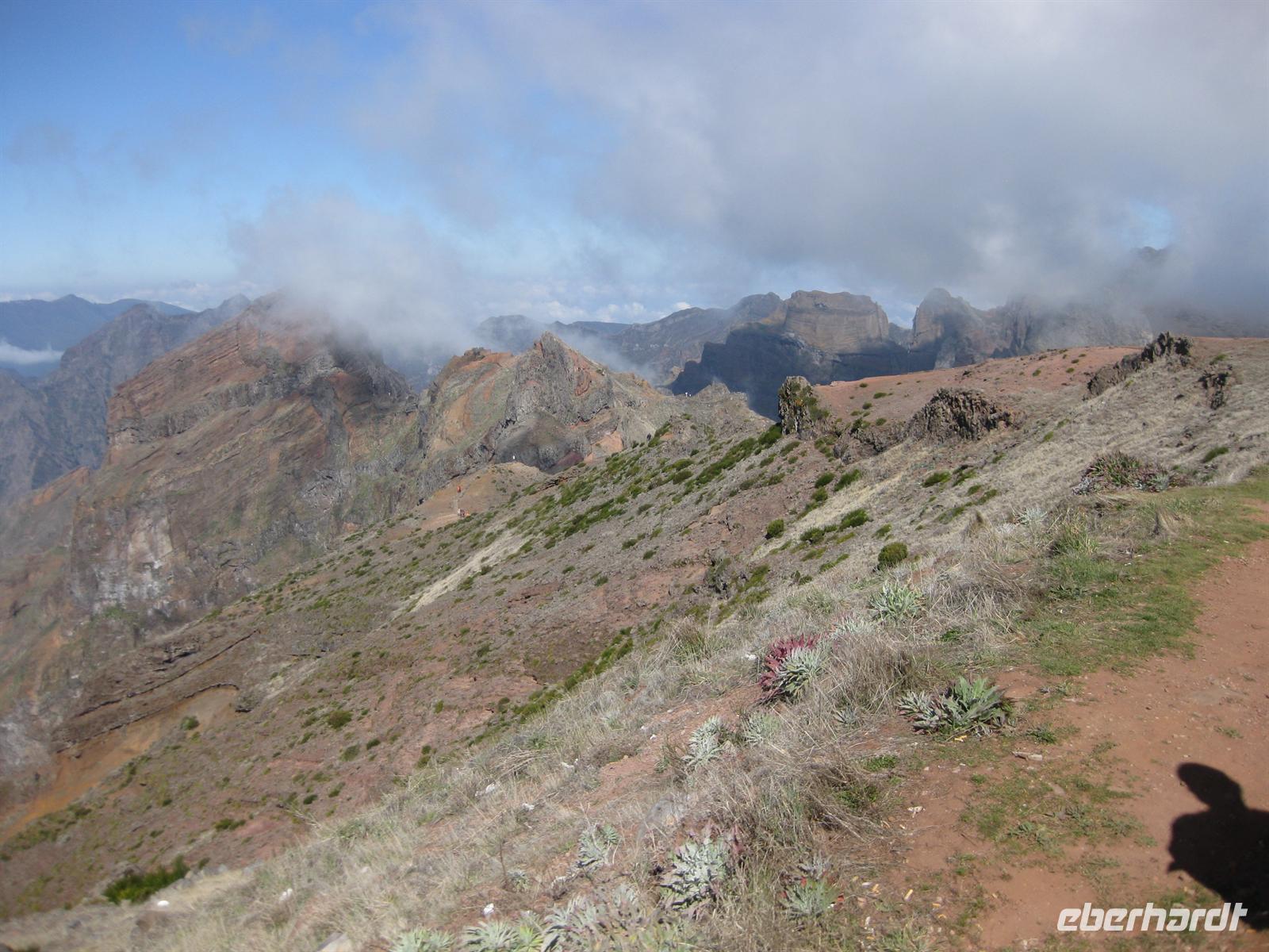 Dann geht die Fahrt weiter zum fast höchsten Berg der Insel, zum Pico do Arieiro. Der ist 1.818 m hoch. Und wir haben Glück, wir kommen bei herrlichstem Sonnenschein oben an. Wir können aussteigen und die Aussicht über die Insel genießen - fantastisch. Nachdem sich alle satt gesehen haben, geht die Fahrt wieder etwas nach unten, durch Wälder bis zur Forellenzucht in Ribeiro Frio. Hier besuchen wir die Forellenzucht und anschließend machen wir unsere erste kleine Levada-Wanderung entlang der Levada do Furado bis zum Balcoes. Vom Balcoes aus haben wir eine tolle Sicht zur östlichen Küste mit dem Adlerfelsen und zu den hohen Bergen der Insel, deren Kuppen sich nun leider etwas in Wolken gehüllt haben, und in das Tal unterhalb des Balcoes. Nach einer kleinen Rast steigen wir wieder hinab und treffen auf unseren Bus. Alle haben die Prüfung für die Levada-Wanderung am morgigen Tag bestanden.