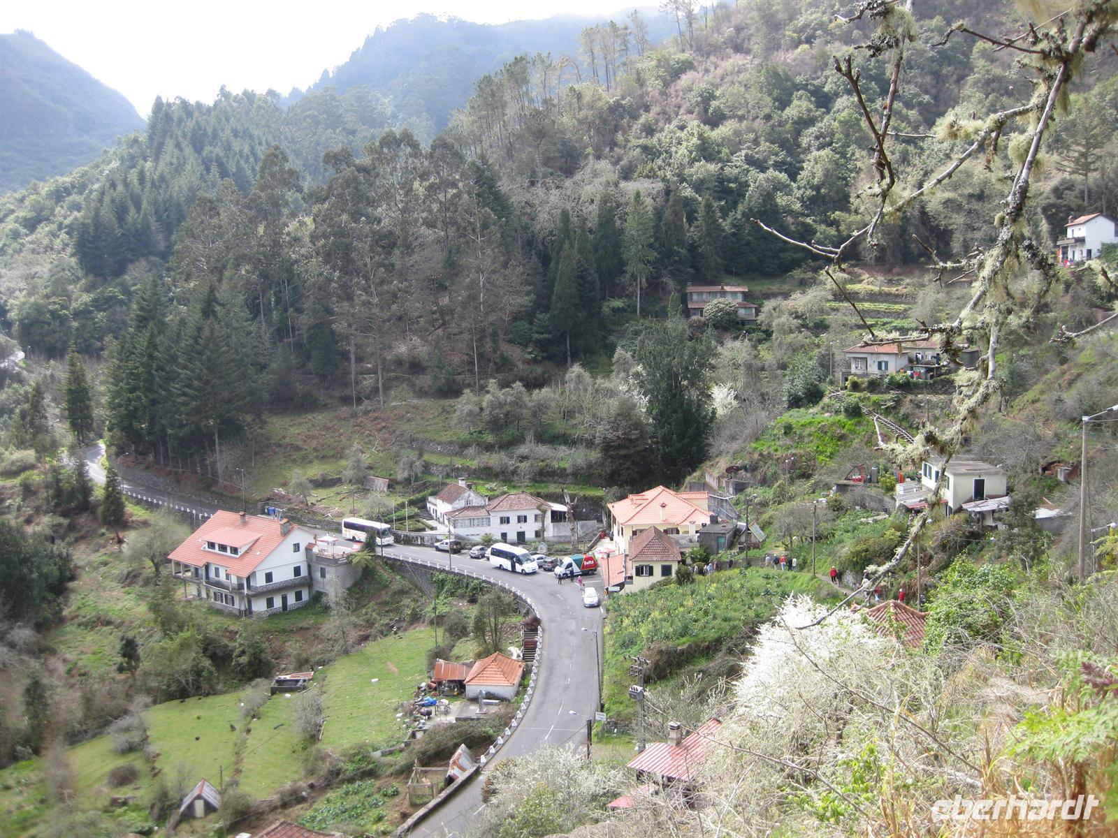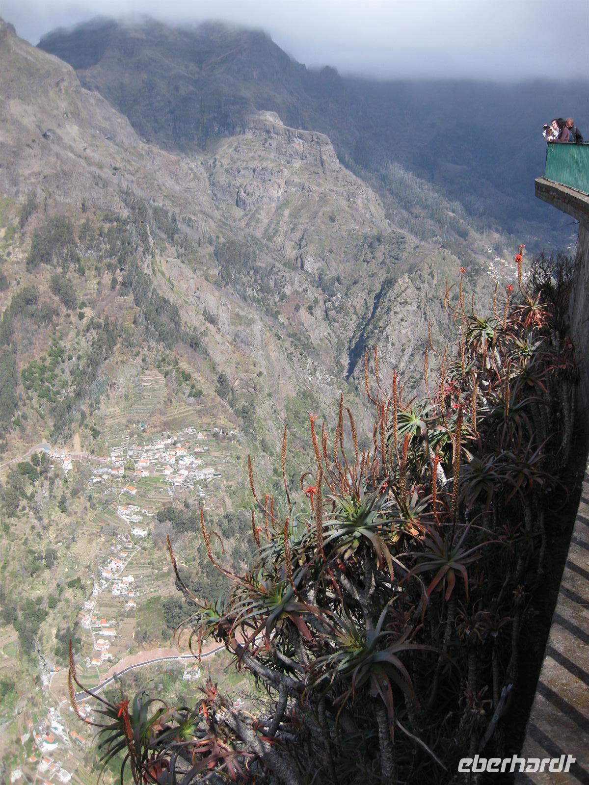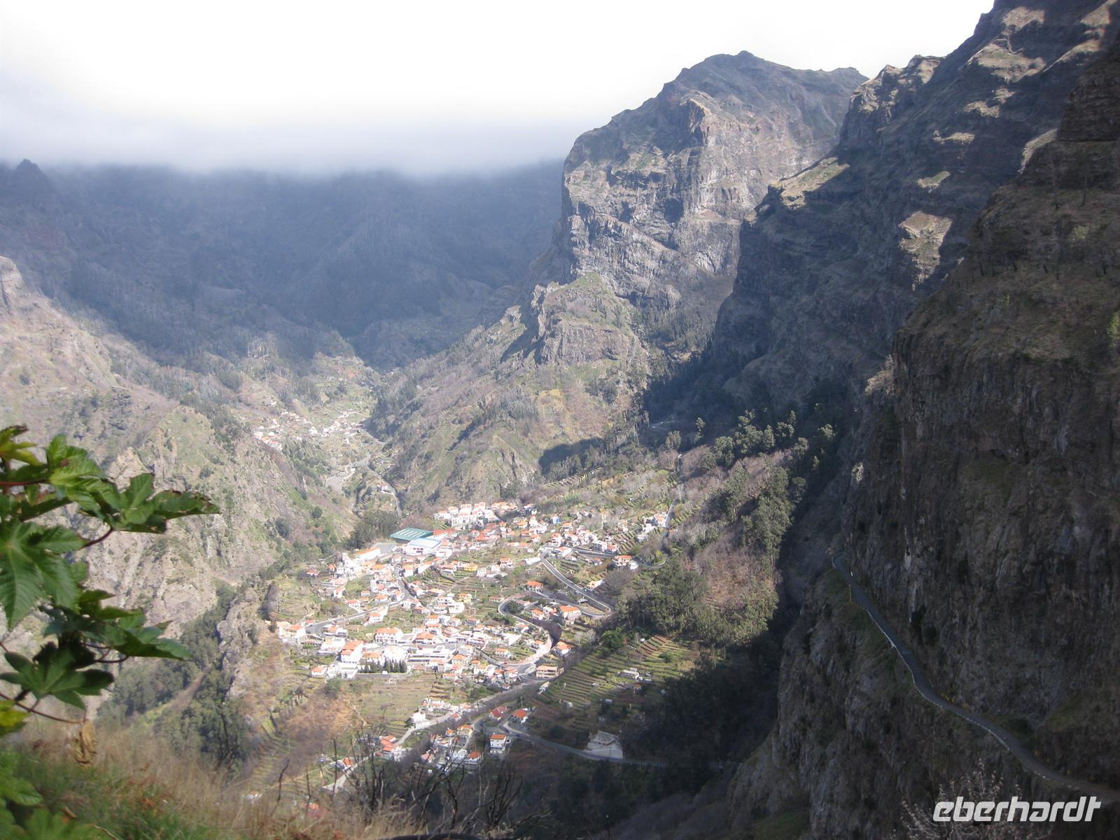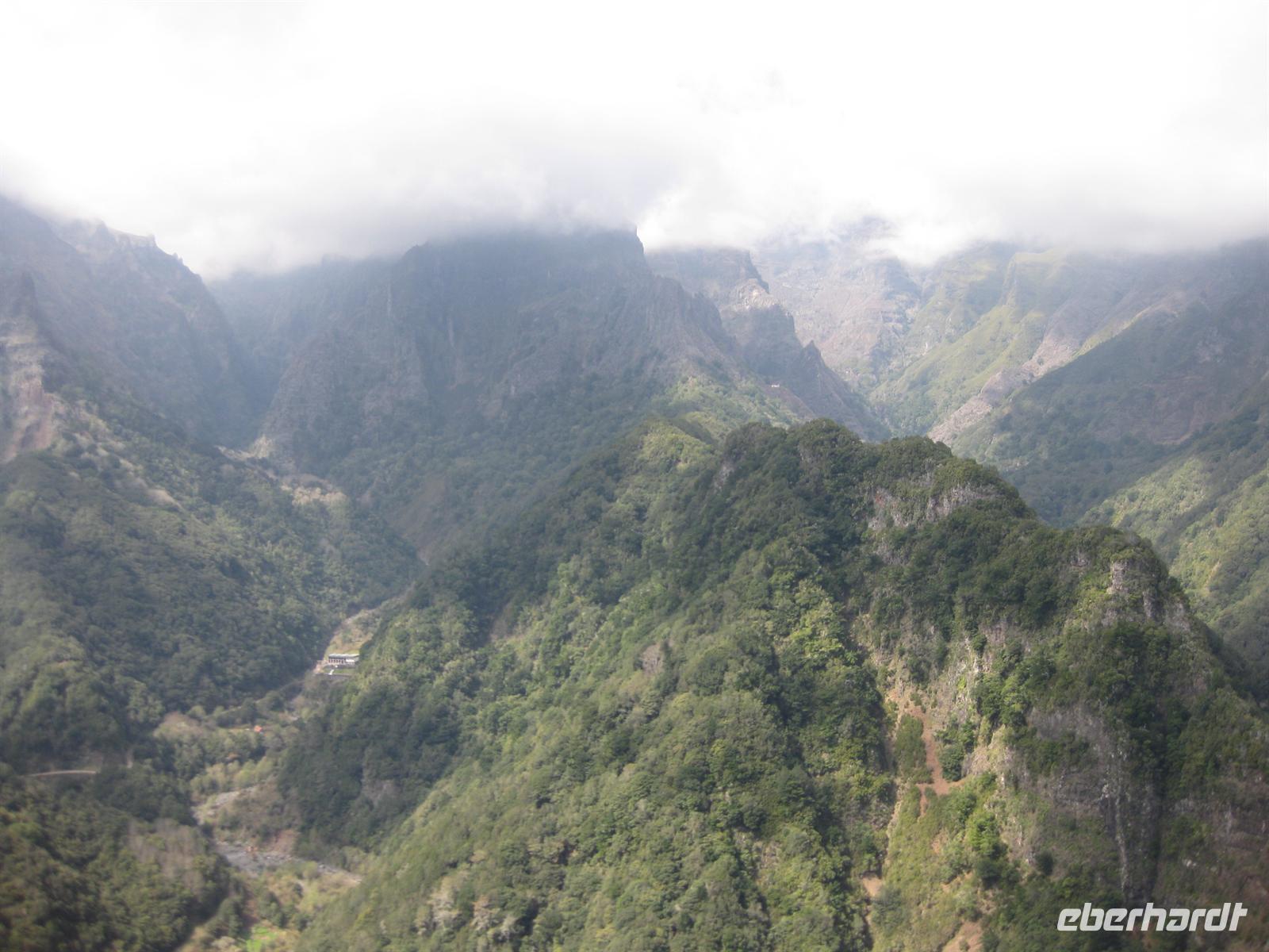 Dann sind wir alle wieder beisammen und fahren zum Nonental. Wir fahren oberhalb von Funchal entlang und biegen dann in Richtung Eira do Serrado und Curral das Freiras (Stall der Nonnen) ab. Die Fahrt geht auf einer steilen Serpentinenstraße durch einen Eukalyptuswald bergauf bis zum Eira do Serrado. Hier ist der höchste Punkt erreicht und die Straße zu Ende. Vom Parkplatz aus spazieren wir zur Aussichtsplattform. Von dieser bieten sich spektakuläre Blicke in das tief unten liegende Nonnental. Im Restaurant am Parkplatz probieren wir als Eberhardt-Wow einen Ginha (Kirschlikör).