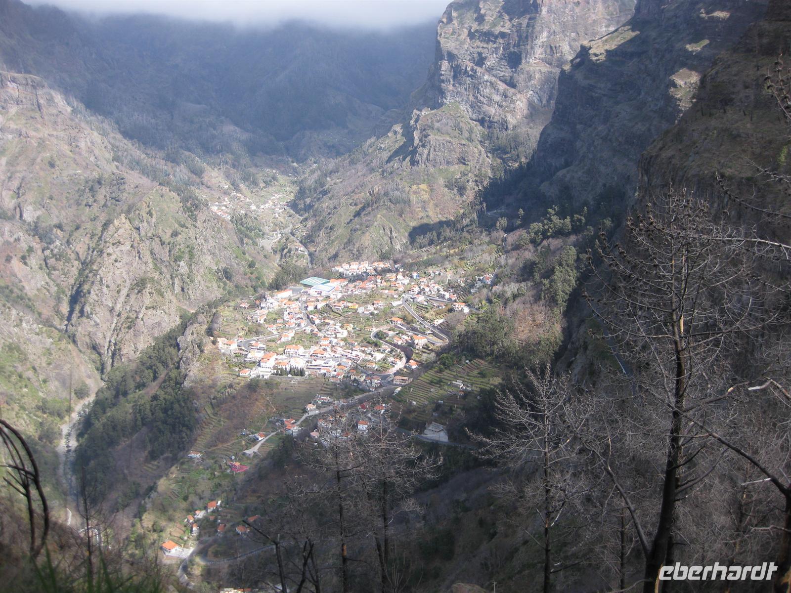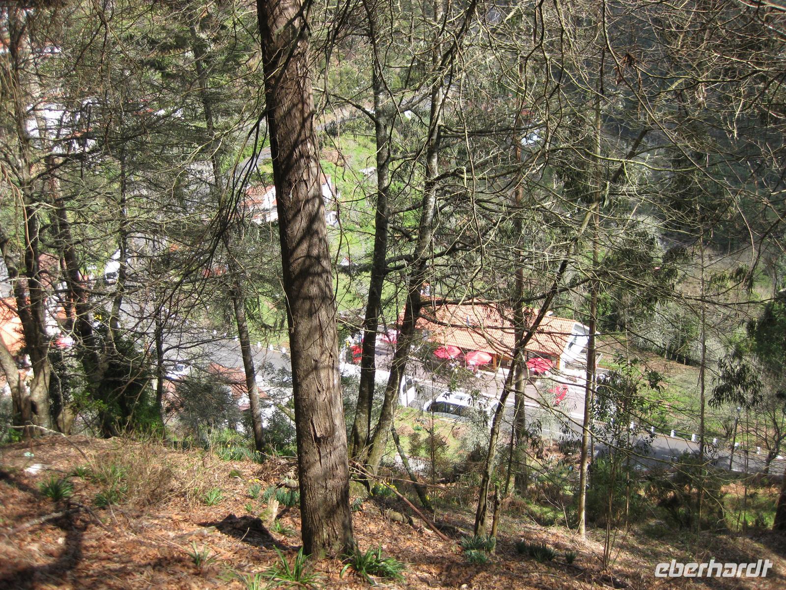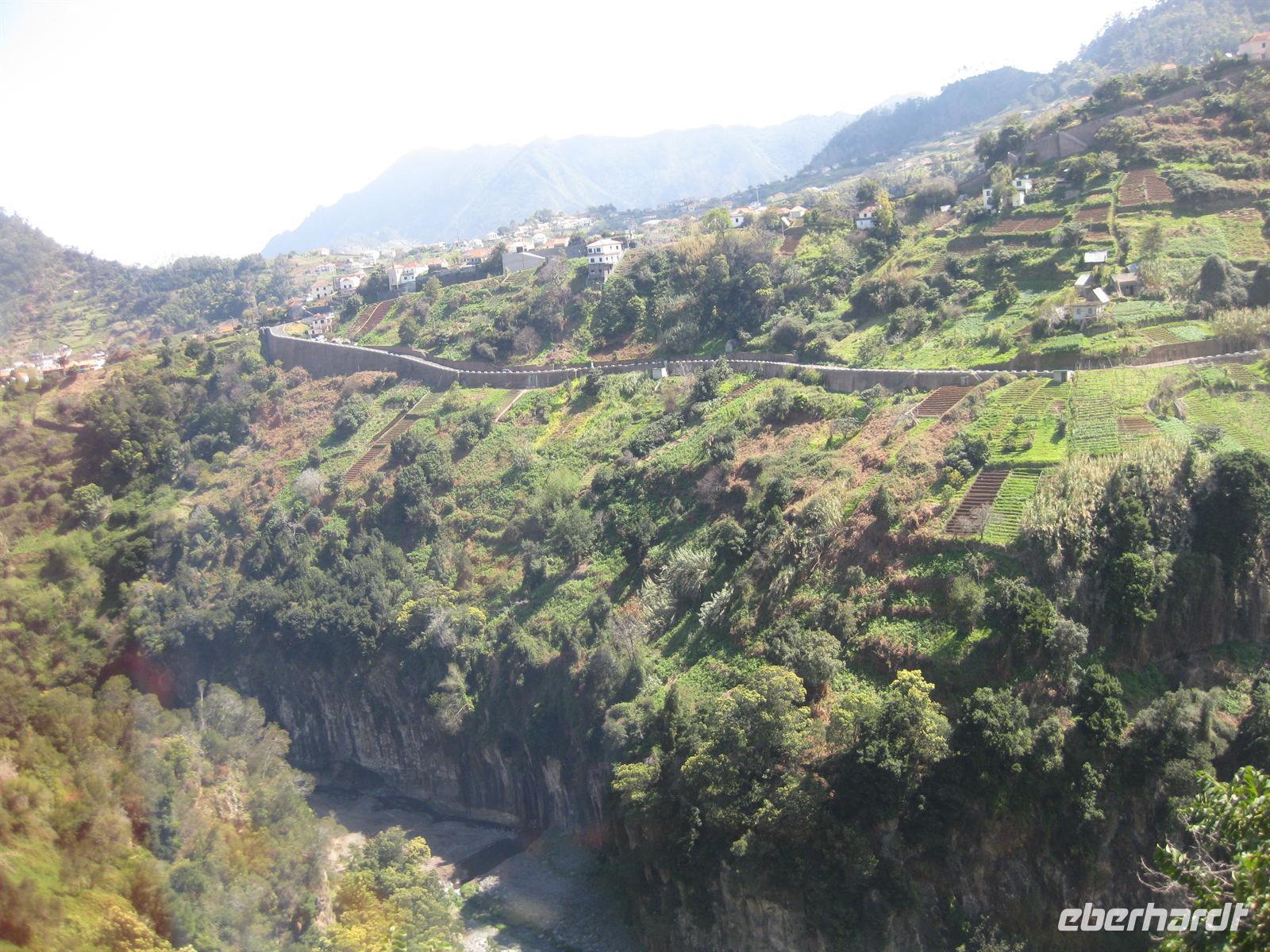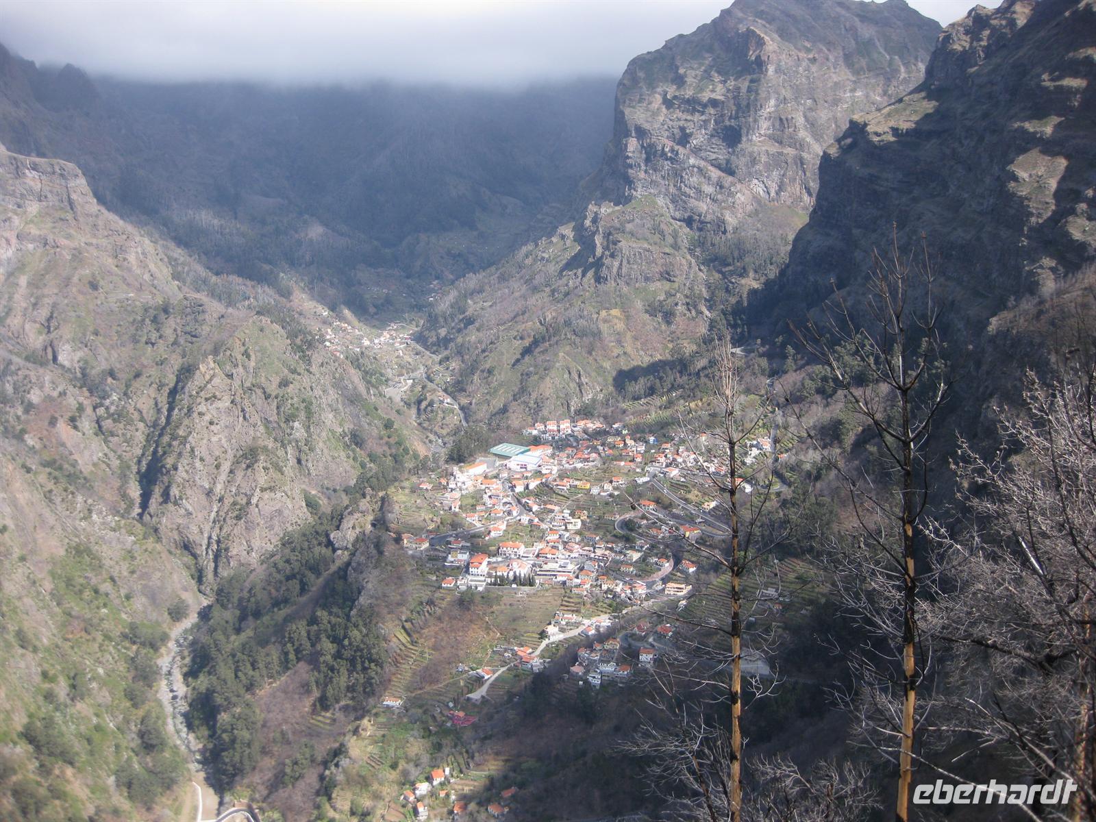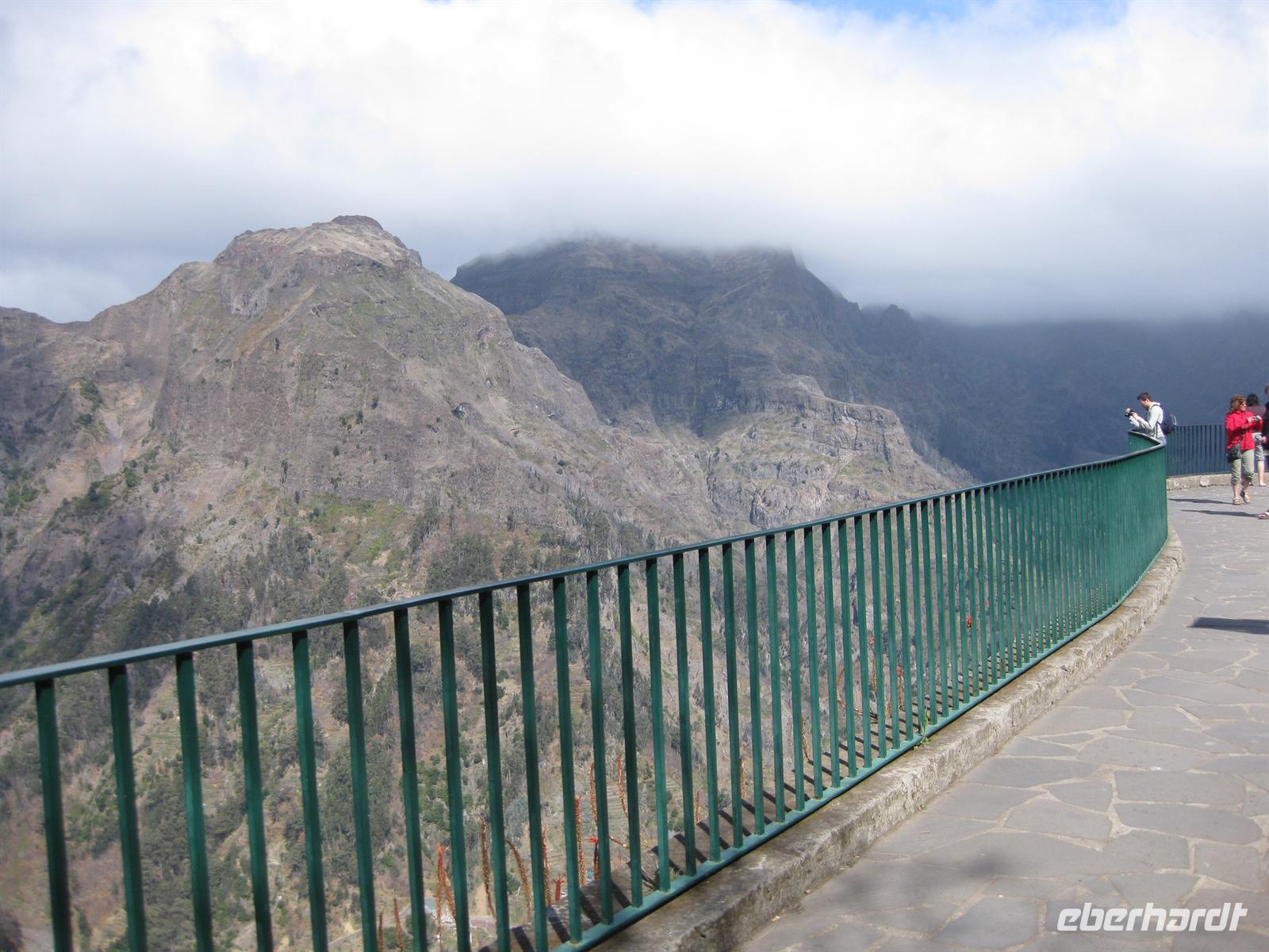 Dann sind wir alle wieder beisammen und fahren zum Nonental. Wir fahren oberhalb von Funchal entlang und biegen dann in Richtung Eira do Serrado und Curral das Freiras (Stall der Nonnen) ab. Die Fahrt geht auf einer steilen Serpentinenstraße durch einen Eukalyptuswald bergauf bis zum Eira do Serrado. Hier ist der höchste Punkt erreicht und die Straße zu Ende. Vom Parkplatz aus spazieren wir zur Aussichtsplattform. Von dieser bieten sich spektakuläre Blicke in das tief unten liegende Nonnental. Im Restaurant am Parkplatz probieren wir als Eberhardt-Wow einen Ginha (Kirschlikör).