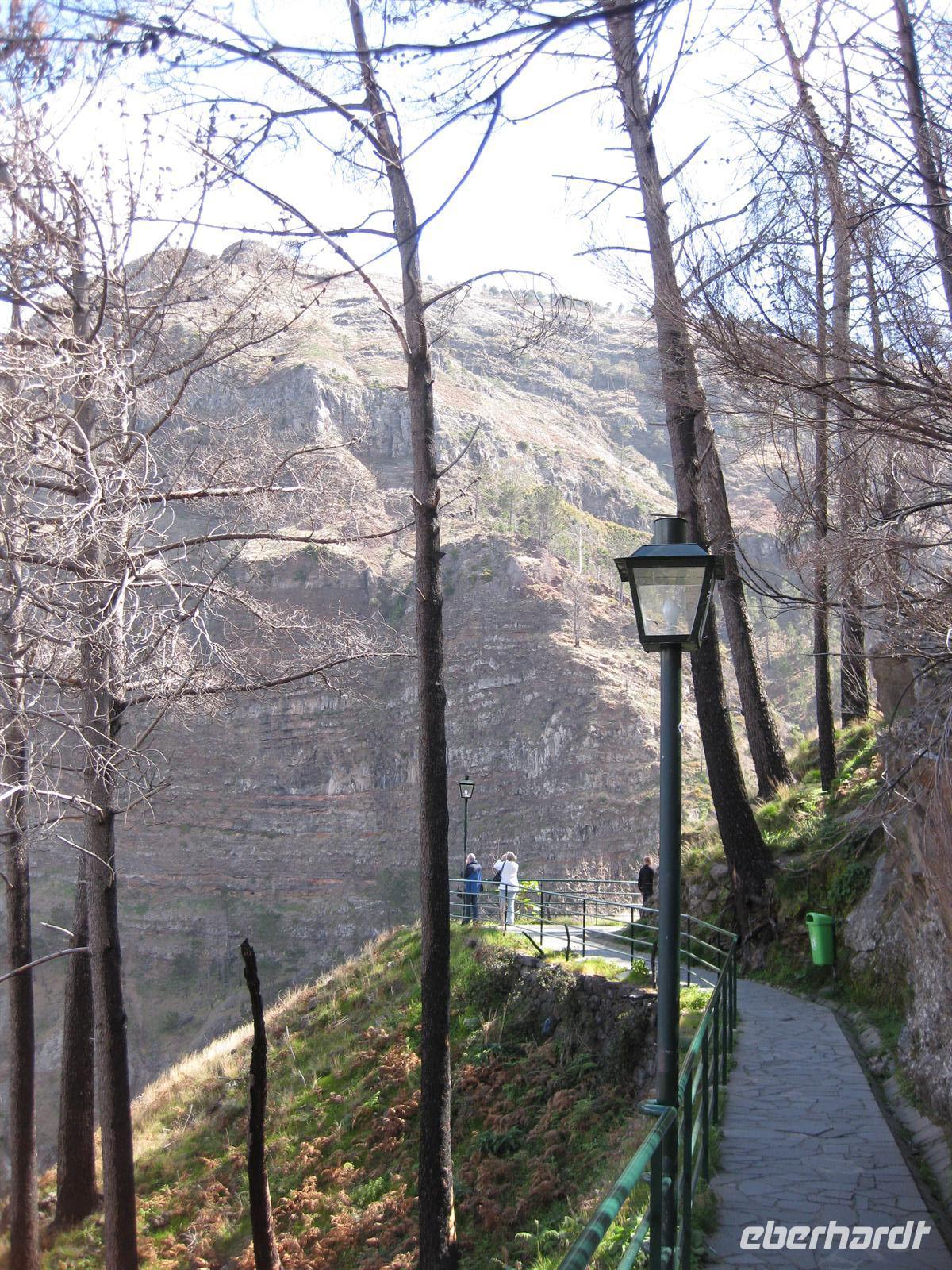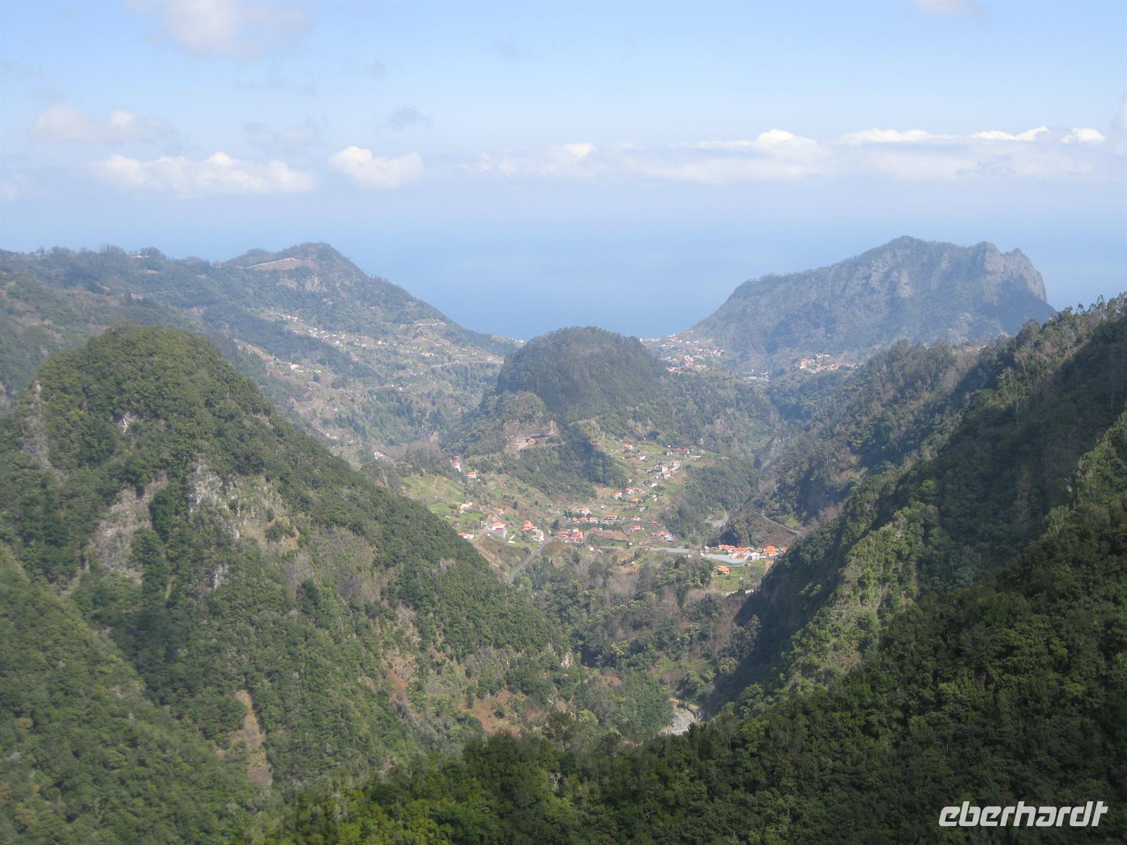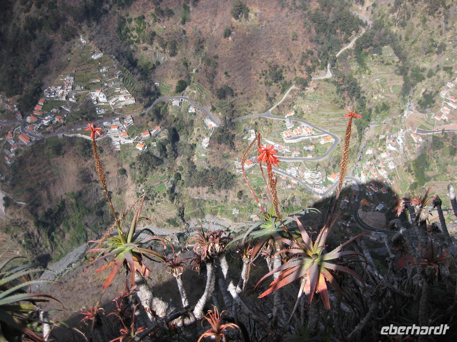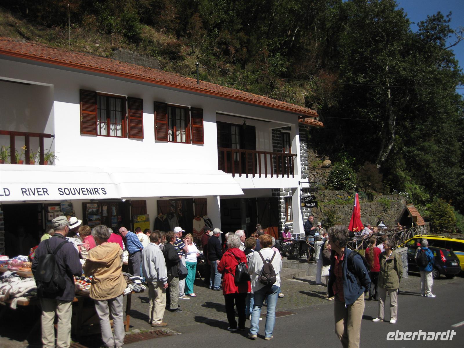 Dann sind wir alle wieder beisammen und fahren zum Nonental. Wir fahren oberhalb von Funchal entlang und biegen dann in Richtung Eira do Serrado und Curral das Freiras (Stall der Nonnen) ab. Die Fahrt geht auf einer steilen Serpentinenstraße durch einen Eukalyptuswald bergauf bis zum Eira do Serrado. Hier ist der höchste Punkt erreicht und die Straße zu Ende. Vom Parkplatz aus spazieren wir zur Aussichtsplattform. Von dieser bieten sich spektakuläre Blicke in das tief unten liegende Nonnental. Im Restaurant am Parkplatz probieren wir als Eberhardt-Wow einen Ginha (Kirschlikör).