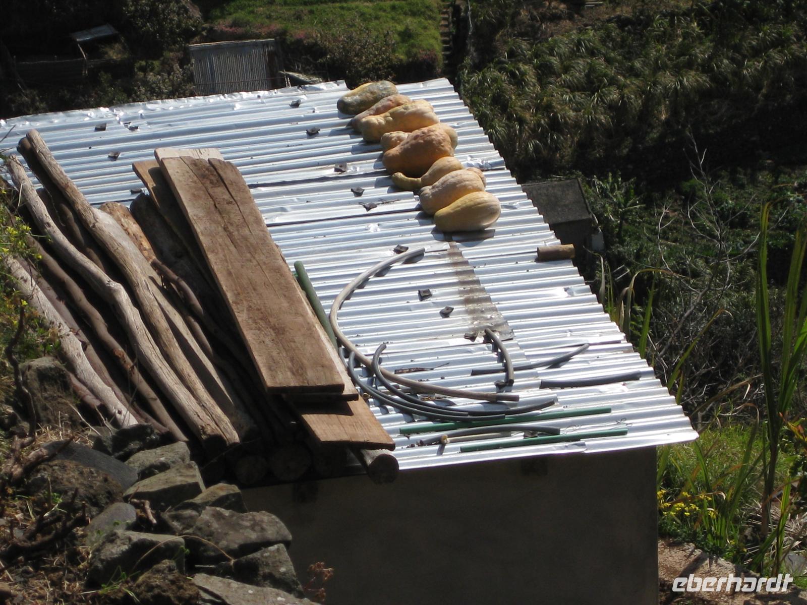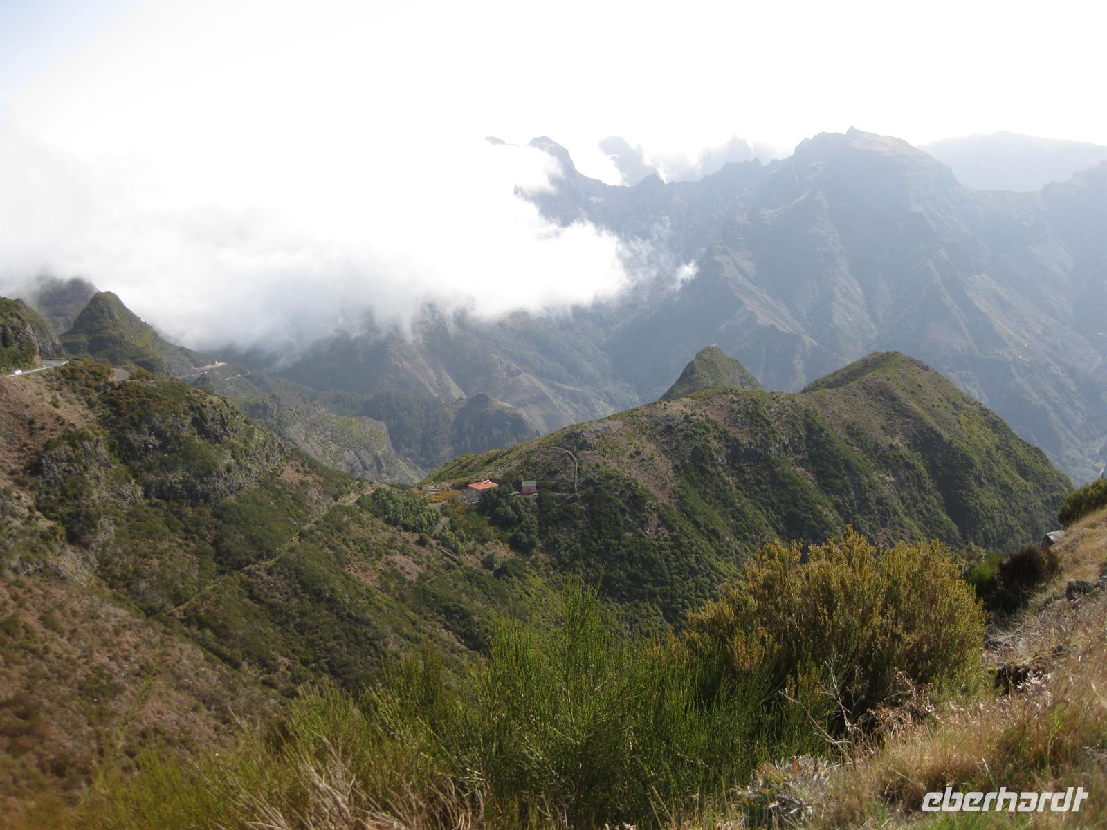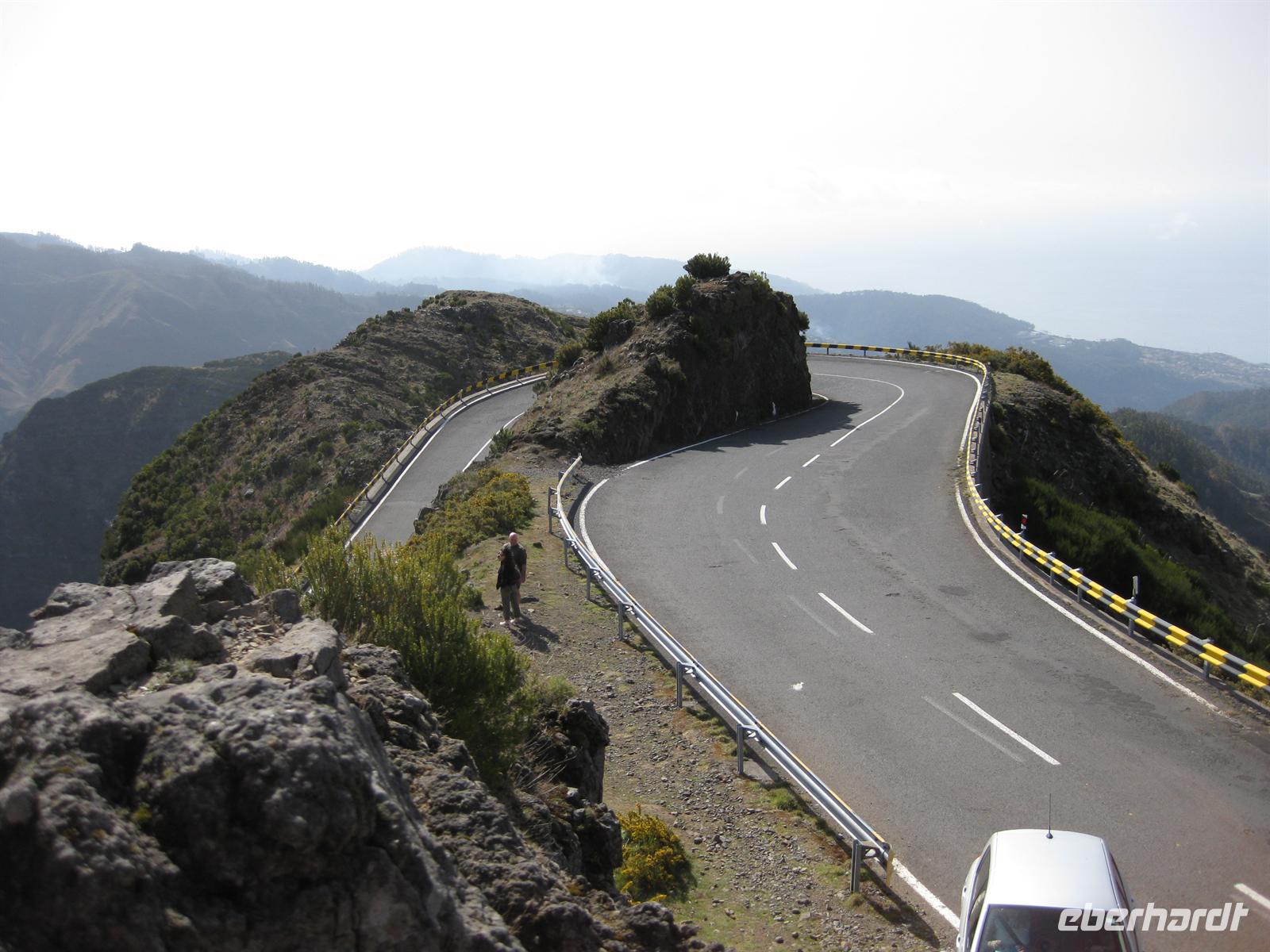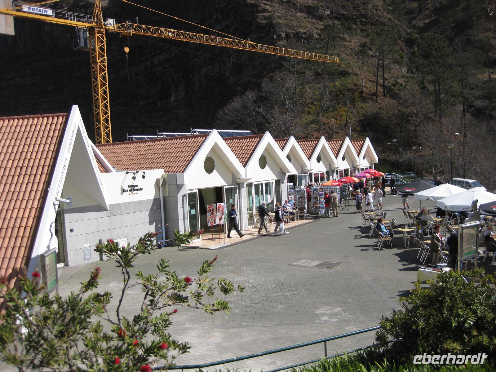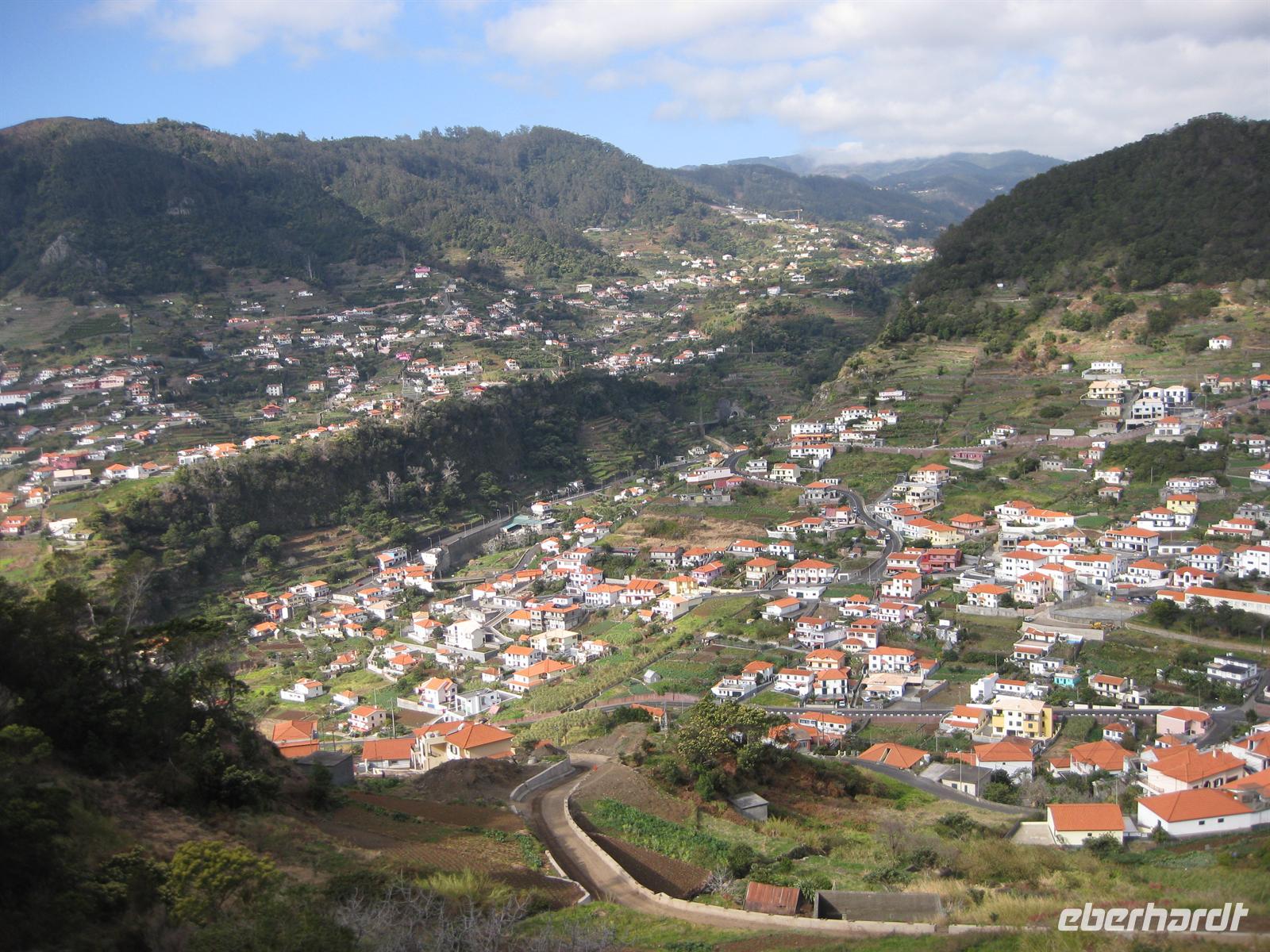 Dann sind wir alle wieder beisammen und fahren zum Nonental. Wir fahren oberhalb von Funchal entlang und biegen dann in Richtung Eira do Serrado und Curral das Freiras (Stall der Nonnen) ab. Die Fahrt geht auf einer steilen Serpentinenstraße durch einen Eukalyptuswald bergauf bis zum Eira do Serrado. Hier ist der höchste Punkt erreicht und die Straße zu Ende. Vom Parkplatz aus spazieren wir zur Aussichtsplattform. Von dieser bieten sich spektakuläre Blicke in das tief unten liegende Nonnental. Im Restaurant am Parkplatz probieren wir als Eberhardt-Wow einen Ginha (Kirschlikör).