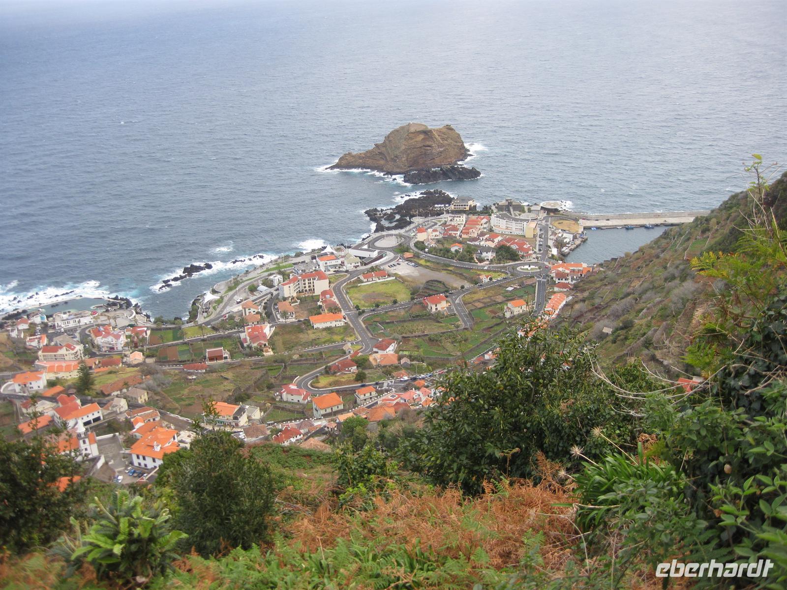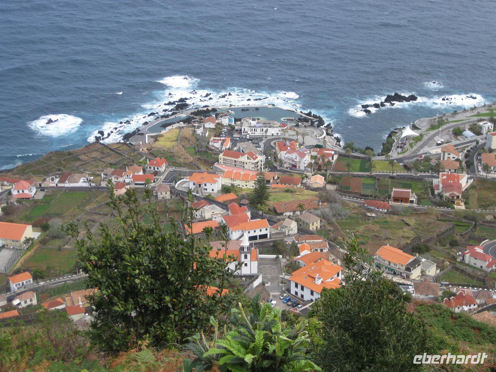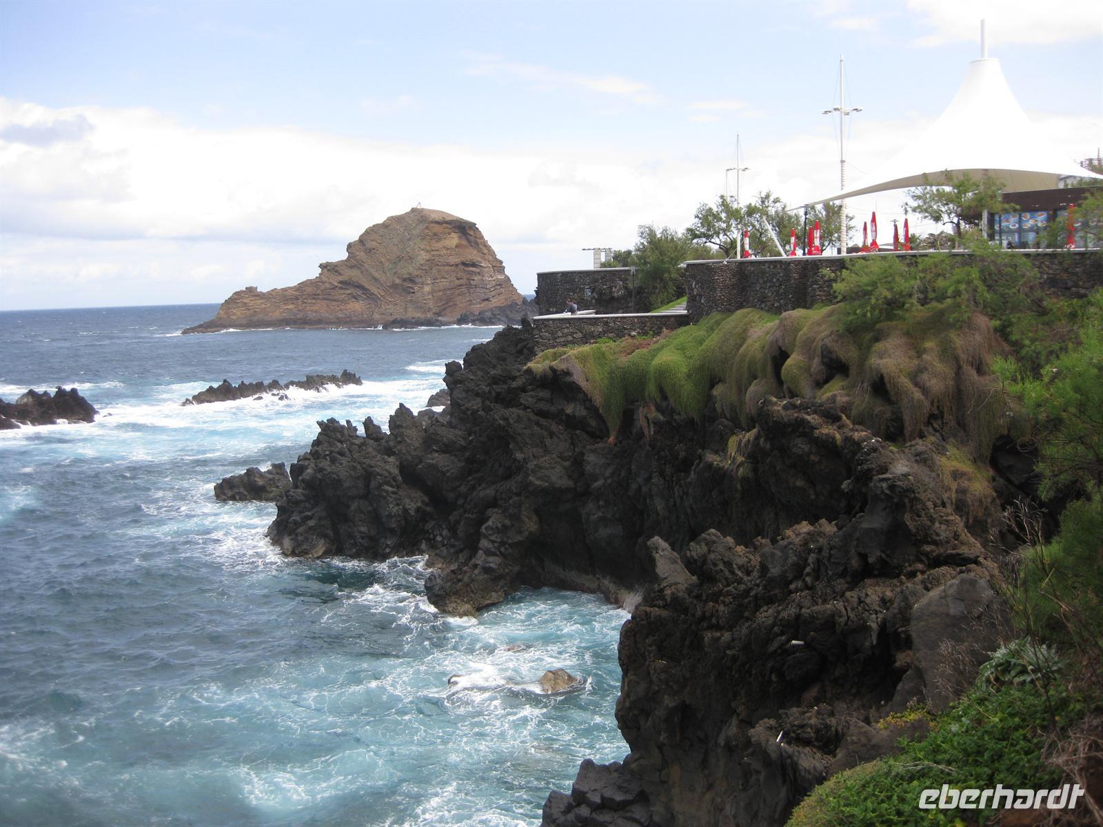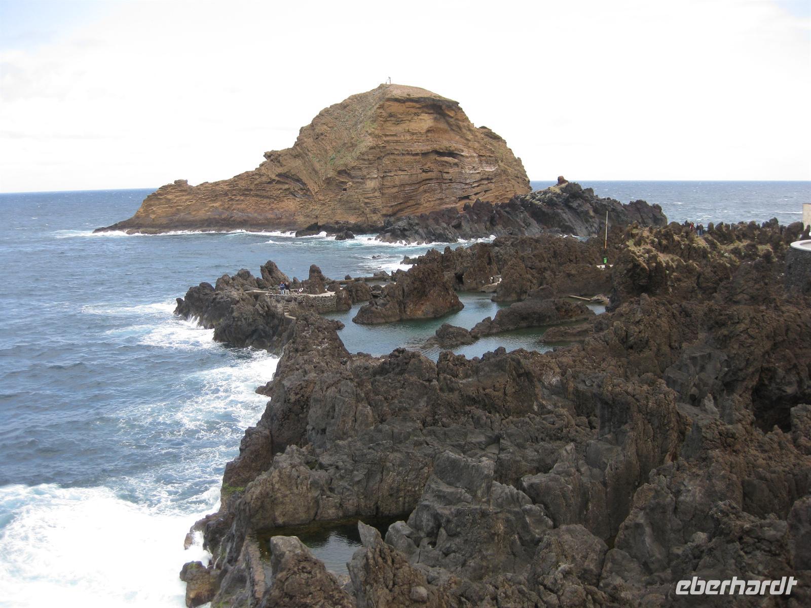 Weiter geht unsere Fahrt durch das Ribeira-Tal, dann über Serpentinenstraßen bis hinauf zum Encumeada Pass in 1007 m Höhe. Von hier aus hat man bei klarem Wetter einen grandiosen Blick zur Nord- und zur Südküste. Leider hüllt sich der Pass heute in Wolken. Wir fahren deshalb in Richtung Westen weiter und nach wenigen Metern sind die Wolken wie weggeblasen und die Sonne strahlt wieder vom Himmel. Helena und unser Fahrer Anastacio kennen einen Aussichtspunkt, an dem wir entschädigt werden. Hier halten wir und können zum Fotostopp aussteigen und die Aussicht genießen. Dann fahren wir über die Hochebene Paul da Serra in Richtung Nordwesten bis zu einem weiteren Aussichtspunkt. Die Nordseite ist wieder in Wolken gehüllt aber in Richtung Süden ist blauer Himmel und Sonnenschein. So schauen wir eben in diese Richtung. Von diesem Aussichtspunkt gehen auch verschiedene Wanderwege ab. Wir fahren weiter auf der Straße. Bald geht es hinunter nach Porto Moniz. Wir können schon das Örtchen mit dem Lavagestein und den Meeresschwimmbecken von oben sehen. Dann haben wir Porto Moniz erreicht. In einem Restaurant am Meer machen wir Mittagspause und anschließend ist noch genügend Zeit, um auf der Promenade zu spazieren oder zu dem Lavagestein hinab zu steigen und die Pflanzenwelt zu bewundern.