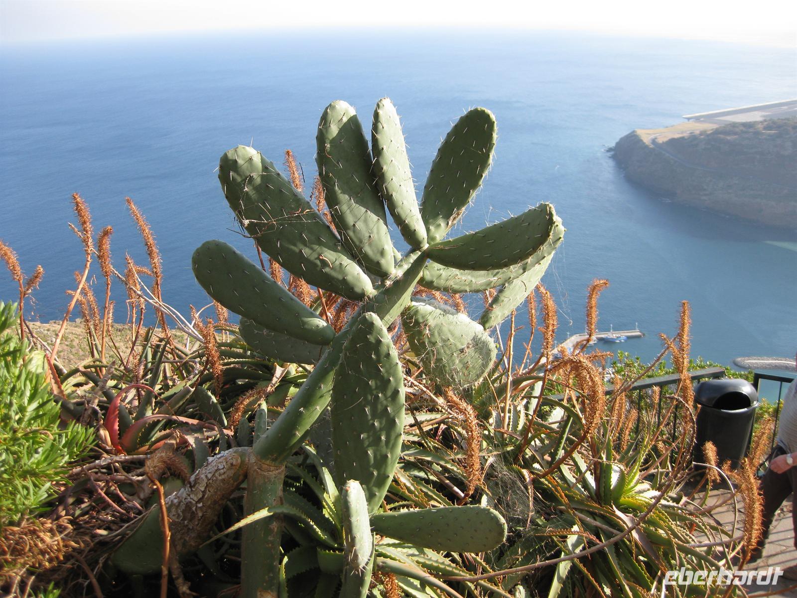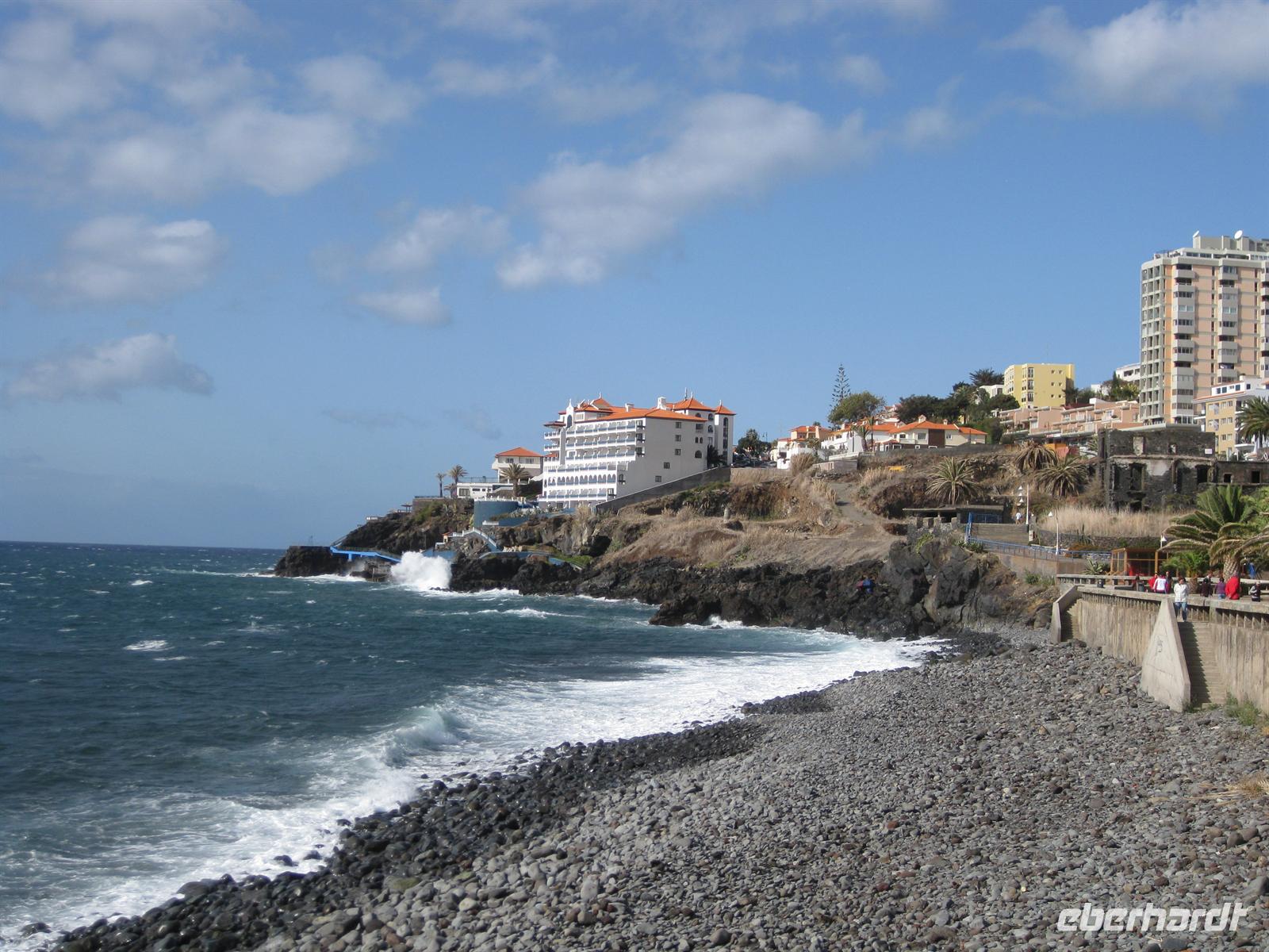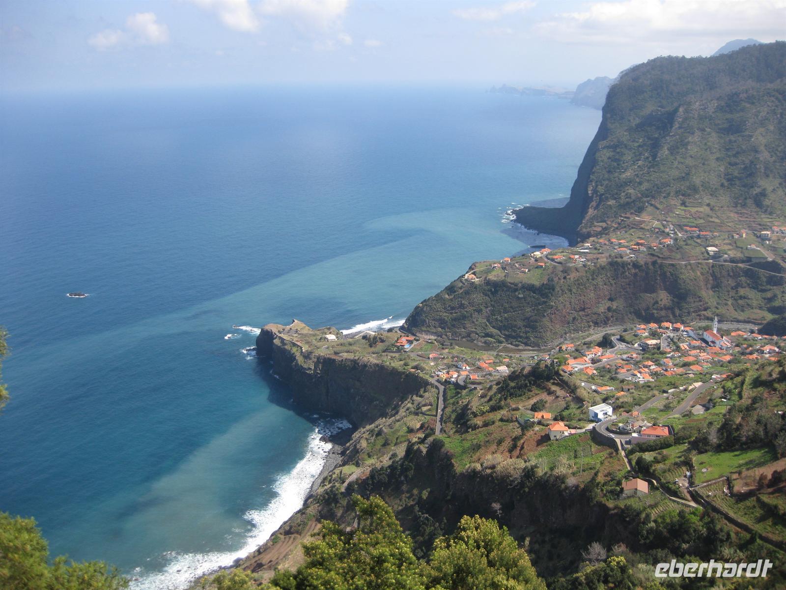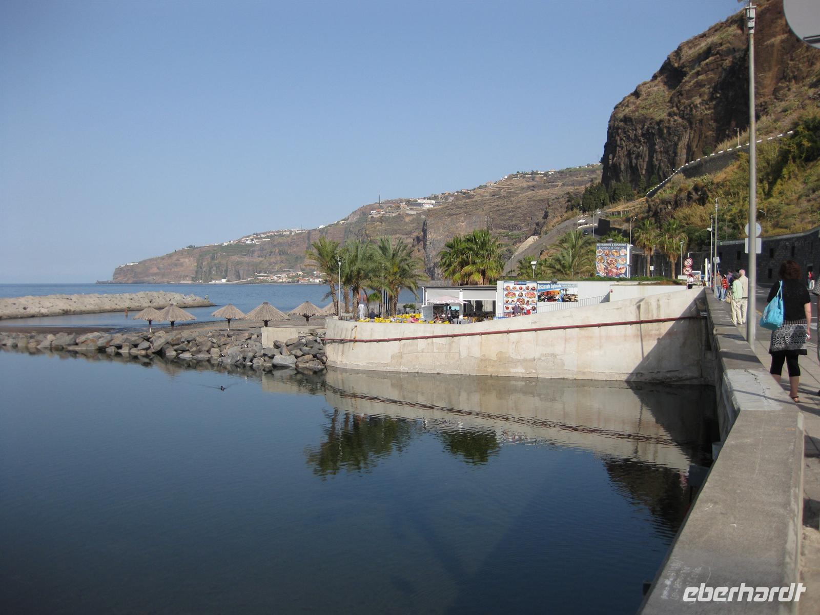 Weiter geht unsere Fahrt durch das Ribeira-Tal, dann über Serpentinenstraßen bis hinauf zum Encumeada Pass in 1007 m Höhe. Von hier aus hat man bei klarem Wetter einen grandiosen Blick zur Nord- und zur Südküste. Leider hüllt sich der Pass heute in Wolken. Wir fahren deshalb in Richtung Westen weiter und nach wenigen Metern sind die Wolken wie weggeblasen und die Sonne strahlt wieder vom Himmel. Helena und unser Fahrer Anastacio kennen einen Aussichtspunkt, an dem wir entschädigt werden. Hier halten wir und können zum Fotostopp aussteigen und die Aussicht genießen. Dann fahren wir über die Hochebene Paul da Serra in Richtung Nordwesten bis zu einem weiteren Aussichtspunkt. Die Nordseite ist wieder in Wolken gehüllt aber in Richtung Süden ist blauer Himmel und Sonnenschein. So schauen wir eben in diese Richtung. Von diesem Aussichtspunkt gehen auch verschiedene Wanderwege ab. Wir fahren weiter auf der Straße. Bald geht es hinunter nach Porto Moniz. Wir können schon das Örtchen mit dem Lavagestein und den Meeresschwimmbecken von oben sehen. Dann haben wir Porto Moniz erreicht. In einem Restaurant am Meer machen wir Mittagspause und anschließend ist noch genügend Zeit, um auf der Promenade zu spazieren oder zu dem Lavagestein hinab zu steigen und die Pflanzenwelt zu bewundern.