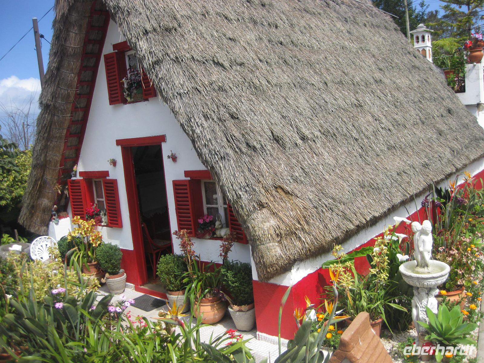Nun fahren wir in das Örtchen Santana, wo es noch die strohgedeckten historischen Häuschen gibt. Unterwegs legen wir noch einen Foto-Stopp auf der Küstenstraße oberhalb von Faial ein. Von hier aus haben wir einen tollen Blick auf das Meer und die östlichste Spitze von Madeira, Sao Lourenco. In Santana machen wir unsere Mittagspause. Und es ist noch ausreichend Zeit, die kleinen Häuschen zu besichtigen.