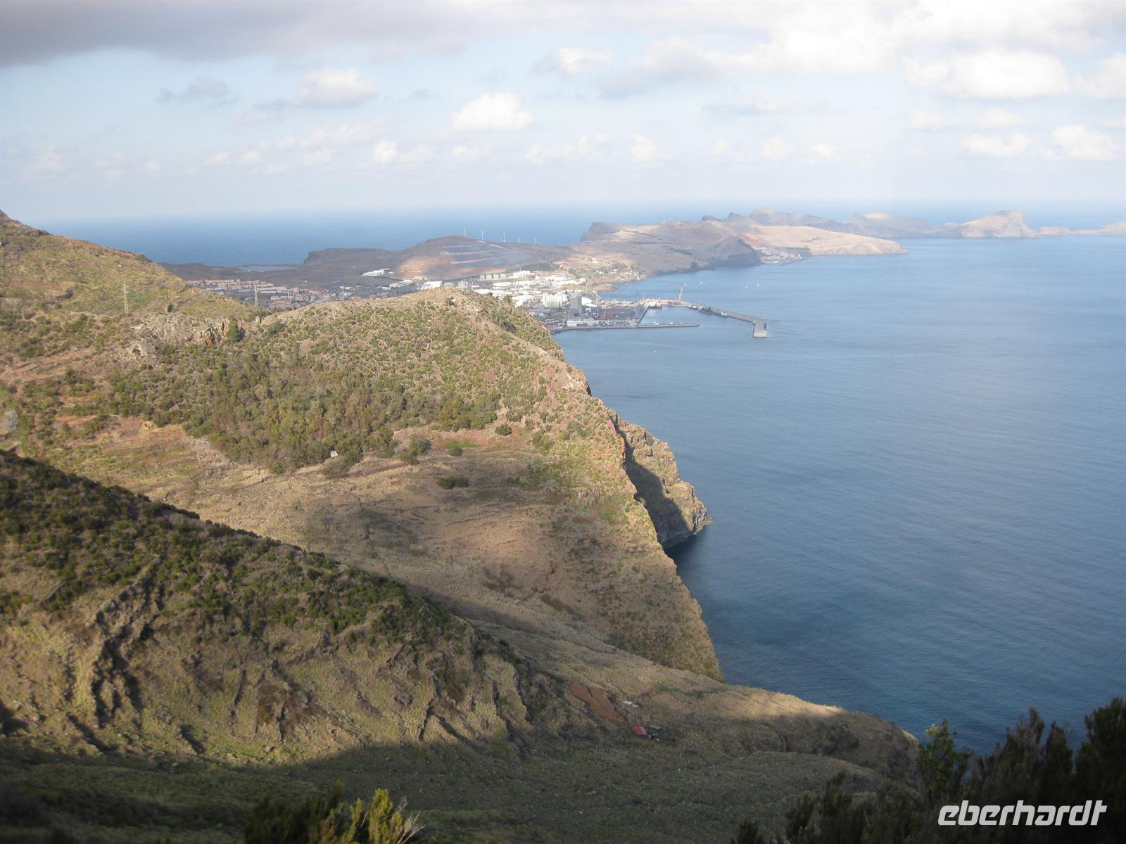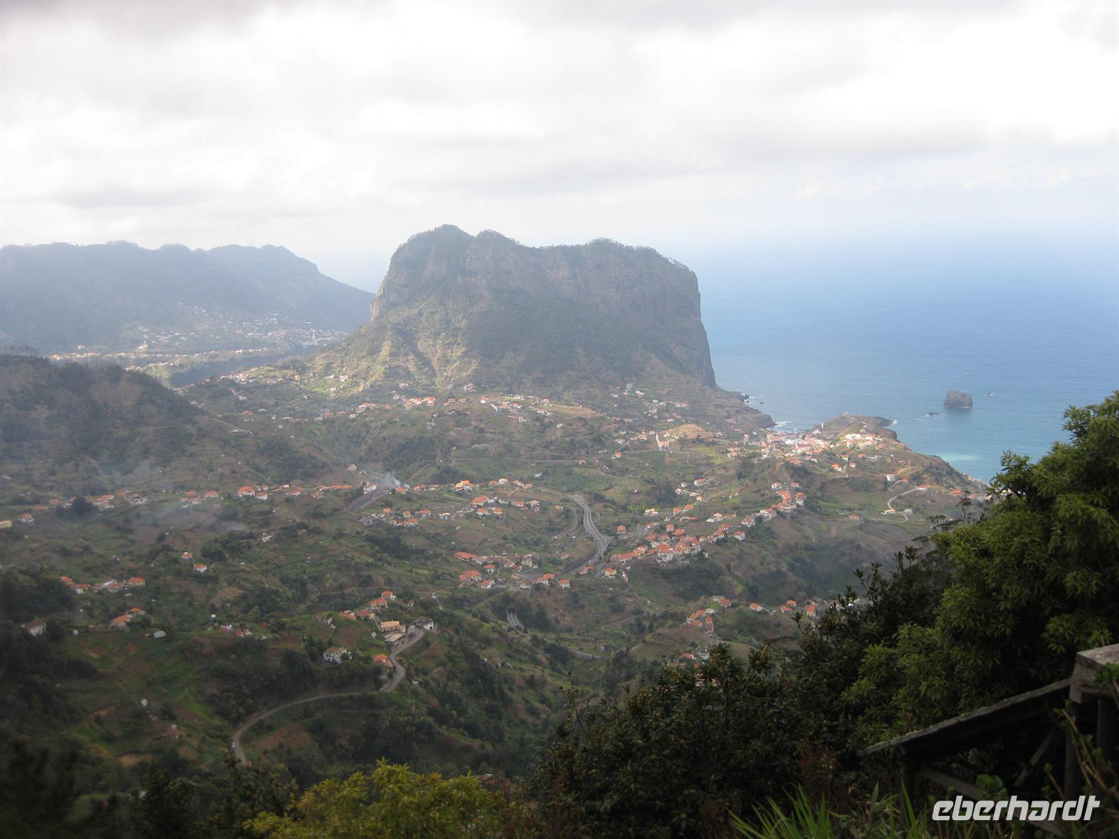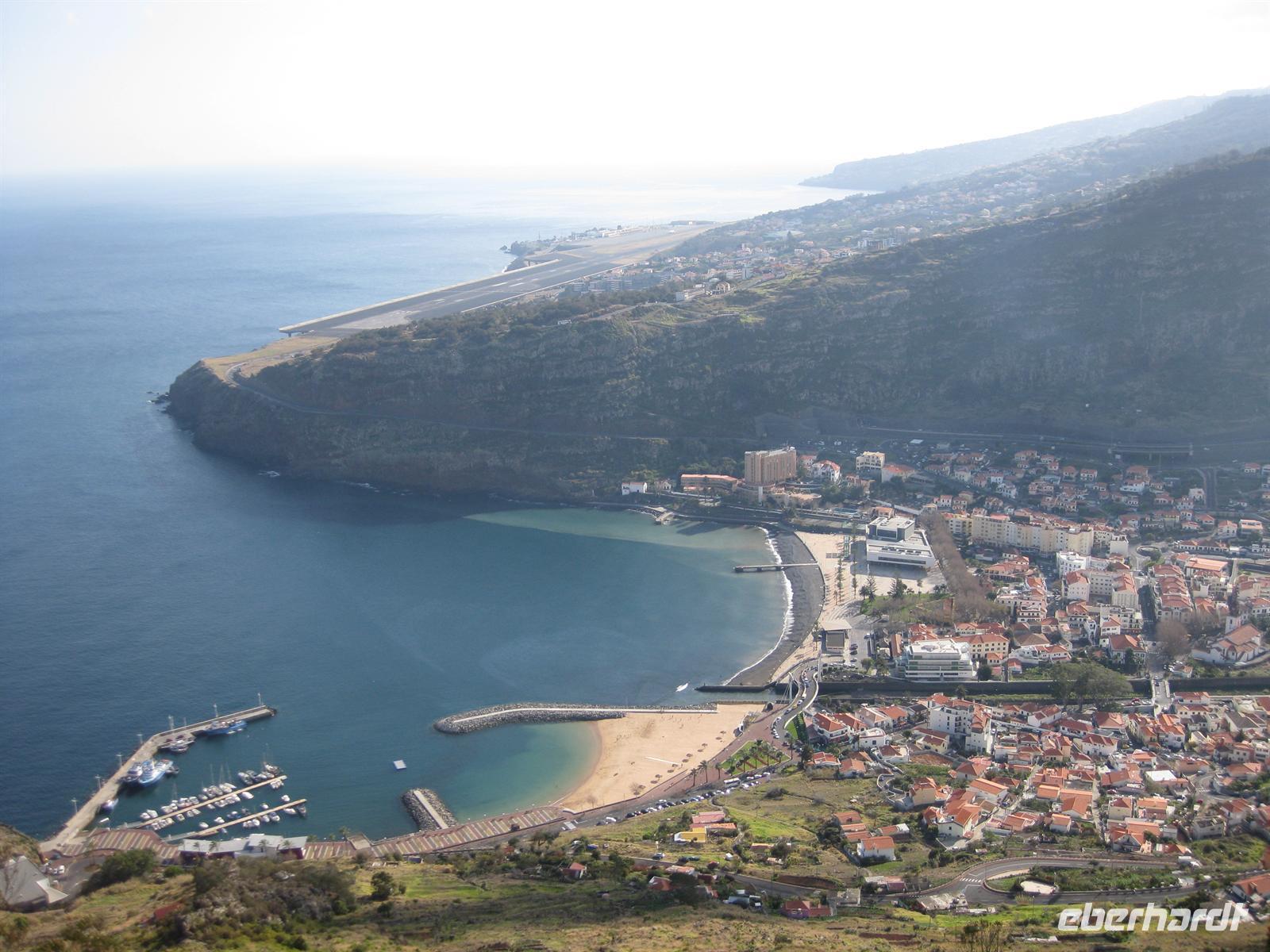 Am Nachmittag geht die Fahrt weiter in Richtung Osten durch Tunnel und über Serpentinenstraßen bis zum Portela Pass. Wir steigen aus und blicken über die Insel bis zum Meer bei Porto da Cruz. Nach einer kurzen Pause fahren wir bis zum Pico do Facho. Wir steigen aus dem Bus und haben nach wenigen Minuten von der Aussichtsplattform aus einen spektakulären Blick auf Machico, das uns zu Füßen liegt, und auf die Landebahn des Flughafens von Madeira. In der anderen Richtung können wir die Ostspitze Madeiras Sao Lourenco ziemlich aus der Nähe sehen. Hier verweilen wir einige Zeit. Der Pico do Facho ist heute unsere letzte Station. Von hier aus fahren wir direkt an und unter der Landebahn des Flughafens zum Hotel zurück.