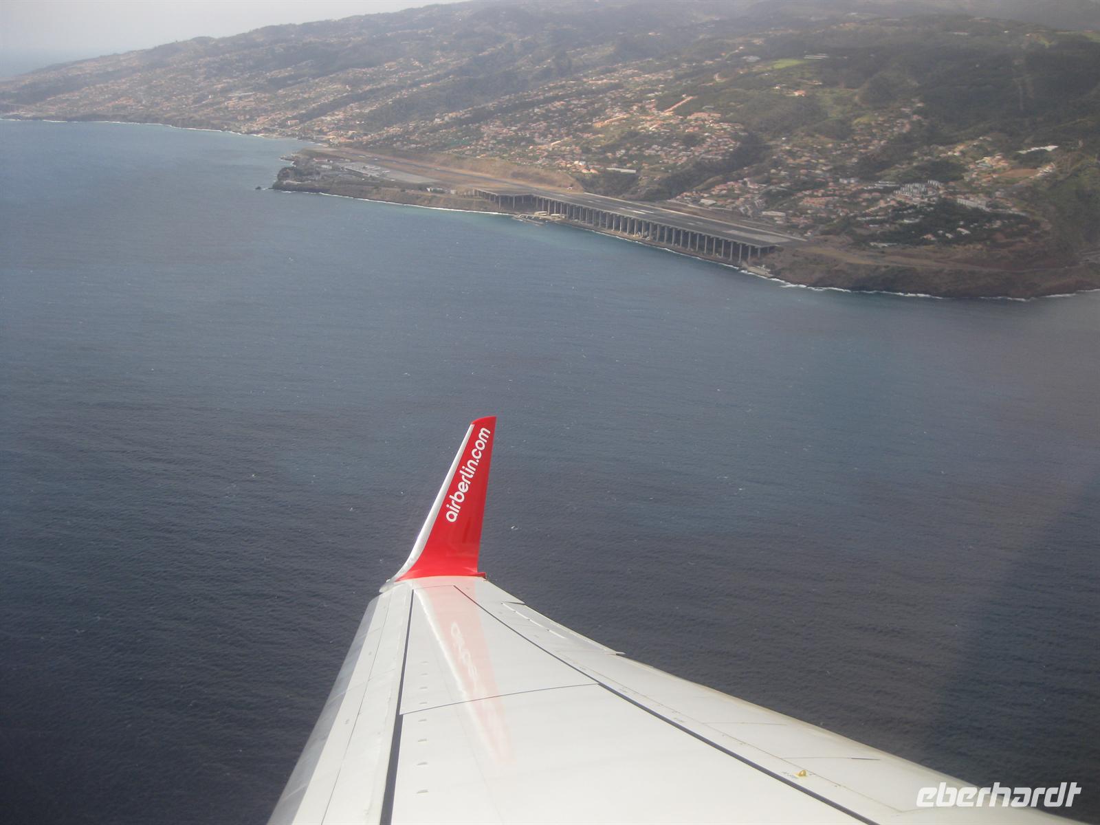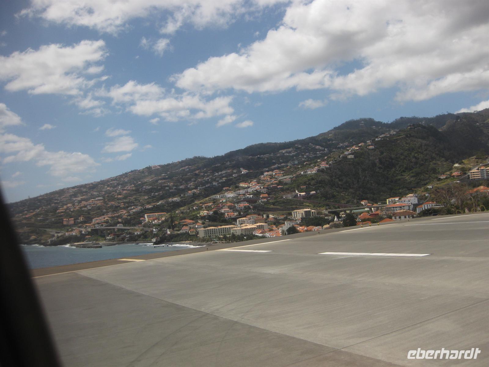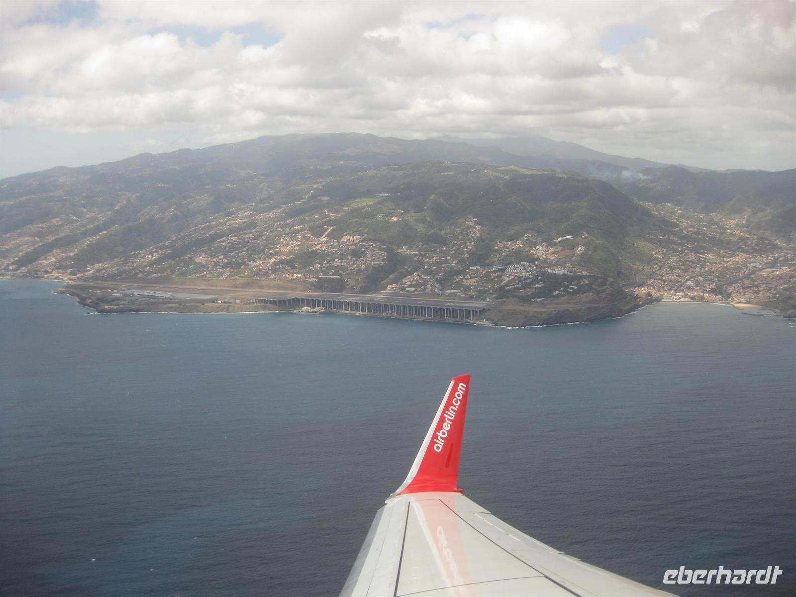 Am Nachmittag geht die Fahrt weiter in Richtung Osten durch Tunnel und über Serpentinenstraßen bis zum Portela Pass. Wir steigen aus und blicken über die Insel bis zum Meer bei Porto da Cruz. Nach einer kurzen Pause fahren wir bis zum Pico do Facho. Wir steigen aus dem Bus und haben nach wenigen Minuten von der Aussichtsplattform aus einen spektakulären Blick auf Machico, das uns zu Füßen liegt, und auf die Landebahn des Flughafens von Madeira. In der anderen Richtung können wir die Ostspitze Madeiras Sao Lourenco ziemlich aus der Nähe sehen. Hier verweilen wir einige Zeit. Der Pico do Facho ist heute unsere letzte Station. Von hier aus fahren wir direkt an und unter der Landebahn des Flughafens zum Hotel zurück.