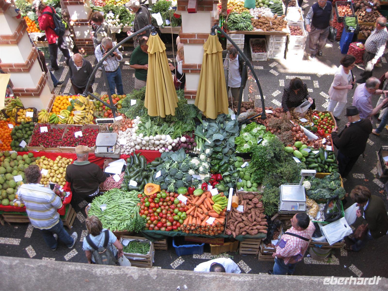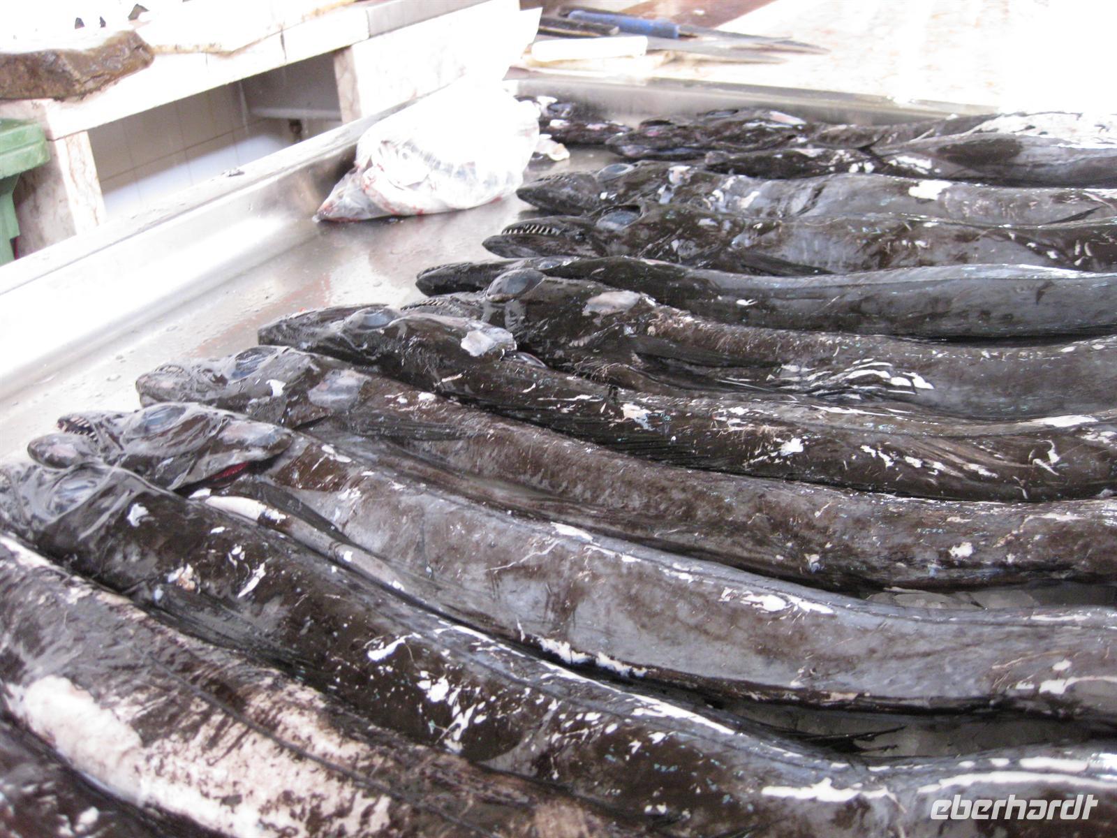 besuchen die Markthalle von Funchal (Mercado dos Lavradores). Heute am Freitag ist Hauptmarkttag. Die Bauern sind da und bieten ihr frisches Obst und Gemüse für das Wochenende an. Blumen und Pflanzen werden in Hülle und Fülle angeboten. Und natürlich müssen wir auch den dazugehörigen Fischmarkt mit besuchen. Hier sehen wir den Schwarzen Degenfisch, dessen gruseliges Aussehen uns schon oft beschrieben wurde. Aber ganz so schlimm ist es dann doch nicht. Überall in der Markthalle herrscht ein reges Treiben. Neben den Madeirensern sind auch viele Gäste da, die so wie wir den berühmten Markt erleben wollen.