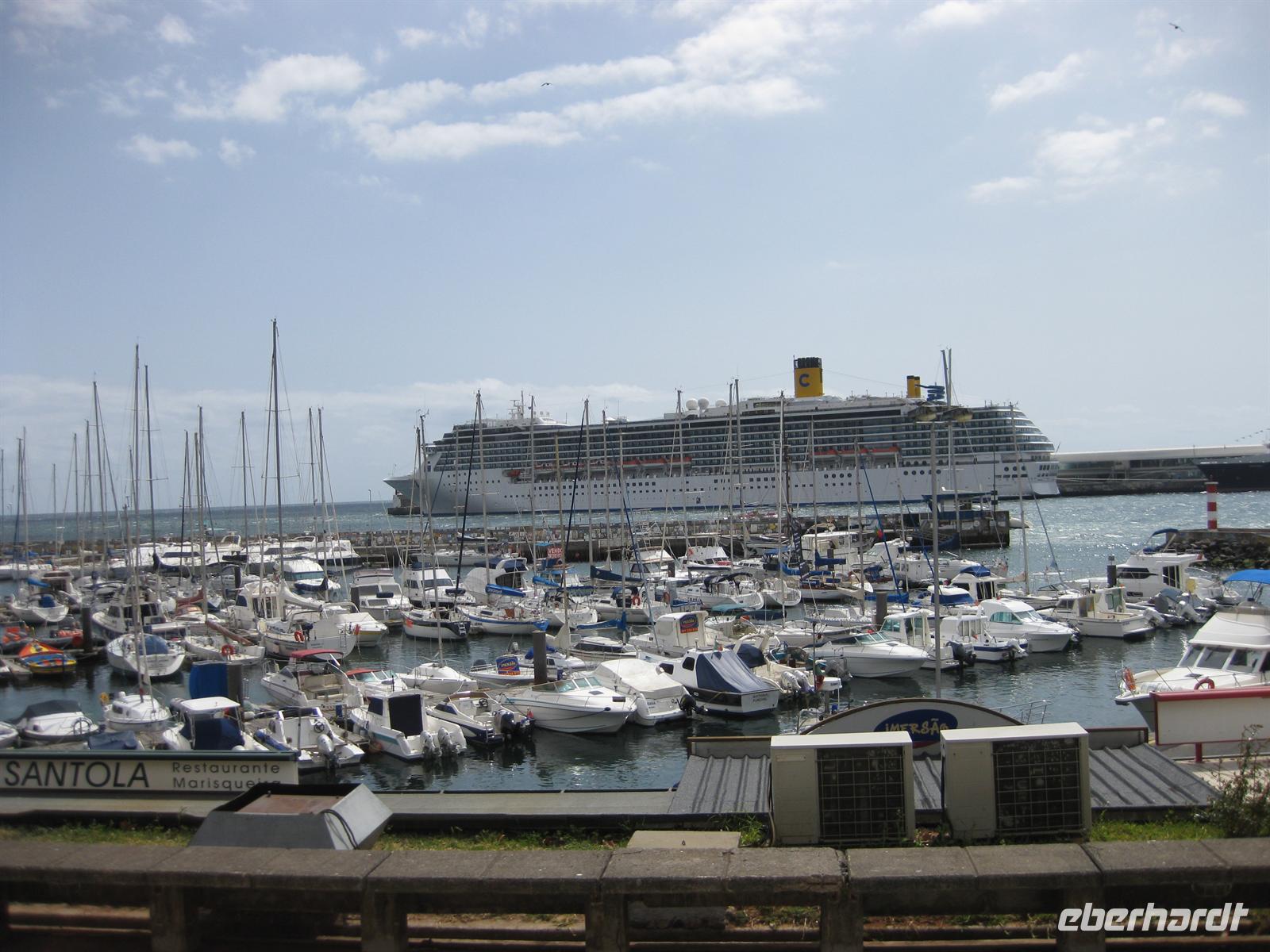 Weiter geht es zur Stadtbesichtigung, die wir zu Fuß machen. Gleich neben der Markthalle ist eine kleine Gasse, in der die Hausbesitzer die Haustüren künstlerisch verziert lassen haben. Dann geht es zum Rathausplatz, der an der einen Seite vom Rathaus und an der anderen Seite von der College Kirche St. Johannes Evangelist begrenzt wird. Wir können die Kirche von Innen besichtigen und auf das Dach steigen. Von dort aus bietet sich ein faszinierender Blick über die Stadt. Ein "Geheimtipp" von Helena.Wir wandeln über den Fußgängerbereich vorbei an berühmten Gebäuden wie der Bank von Portugal, dem Fort Palacio de Sao Lourenco, der Oper bis zum Hafen. Dort machen wir in einem kleinen Restaurant unmittelbar am Kai Mittagspause.