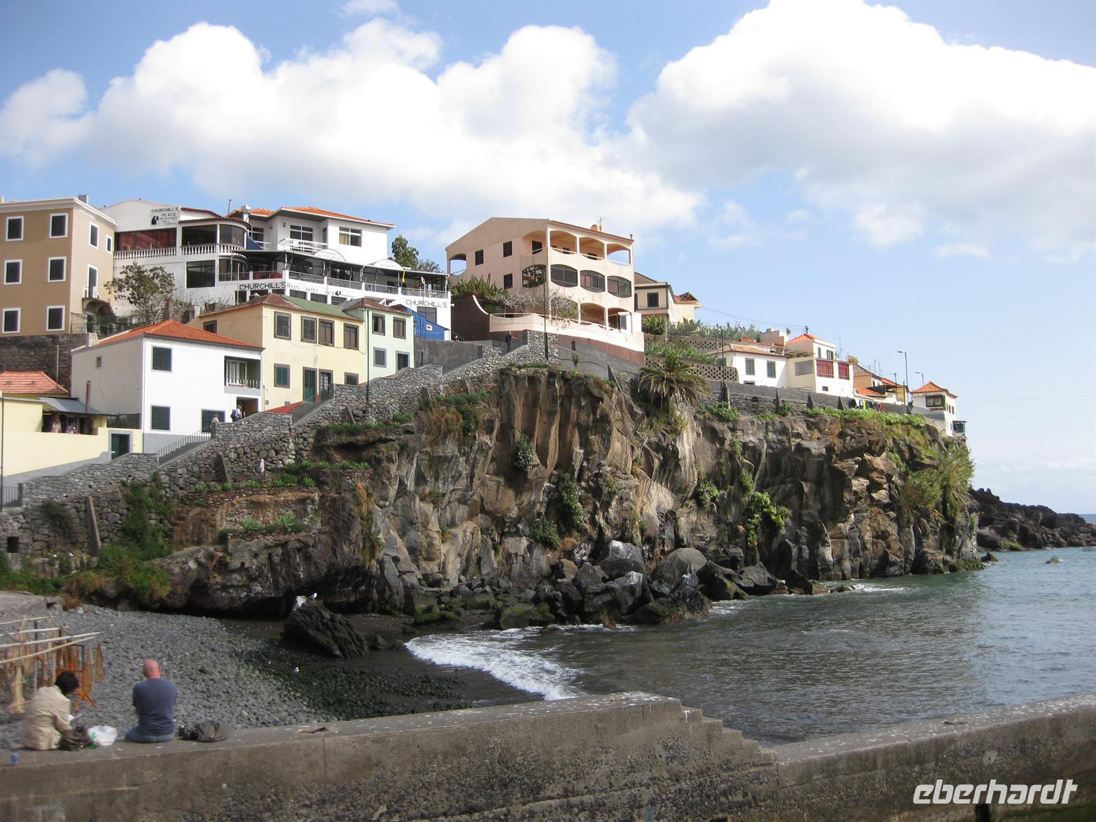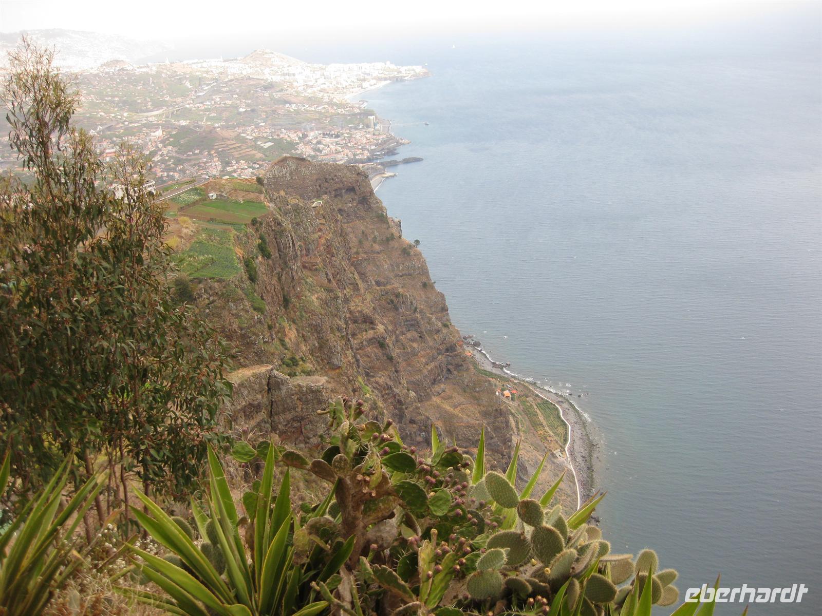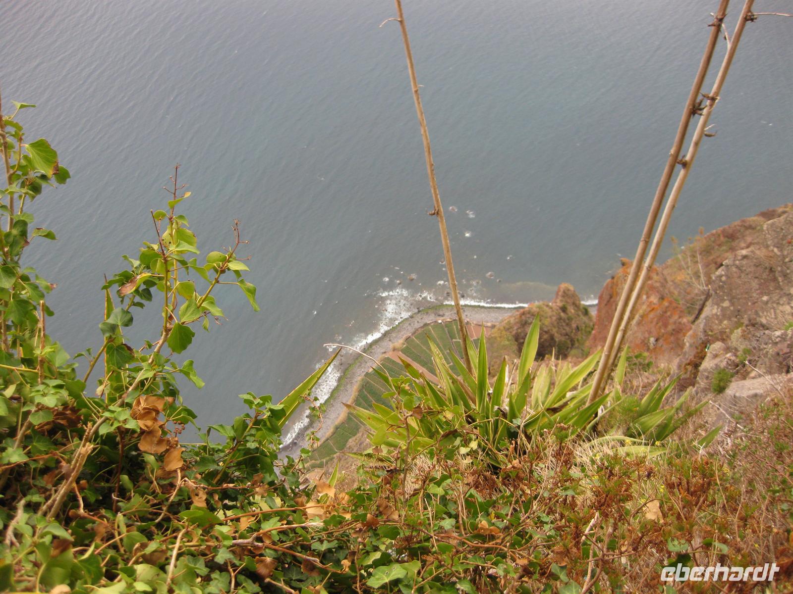 Nachdem wir uns gestärkt haben, setzen wir uns wieder in den Bus und fahren durch das Hotelviertel Funchals zu dem Fischerdorf Camara de Lobos. Es liegt an einer malerischen Bucht kurz vor dem Felskap Cabo Girao. Der britische Staatsmann Sir Winston Churchill machte hier auch schon Station und ließ sich zum Malen inspirieren. Wir machen unweit von seinem Malplatz oberhalb des Hafens einen Fotostopp. Über schmale Serpentinenstraßen geht es hinauf zum Aussichtspunkt auf dem Cabo Girao. 580 m hoch ragt die steile Klippe aus dem Meer. Von der Aussichtsplattform aus bietet sich ein spektakulärer Blick direkt nach unten auf einen schmalen Kiesstrand und zum Meer. Auch da unten haben Bauern kleine Terrassenfelder angelegt.