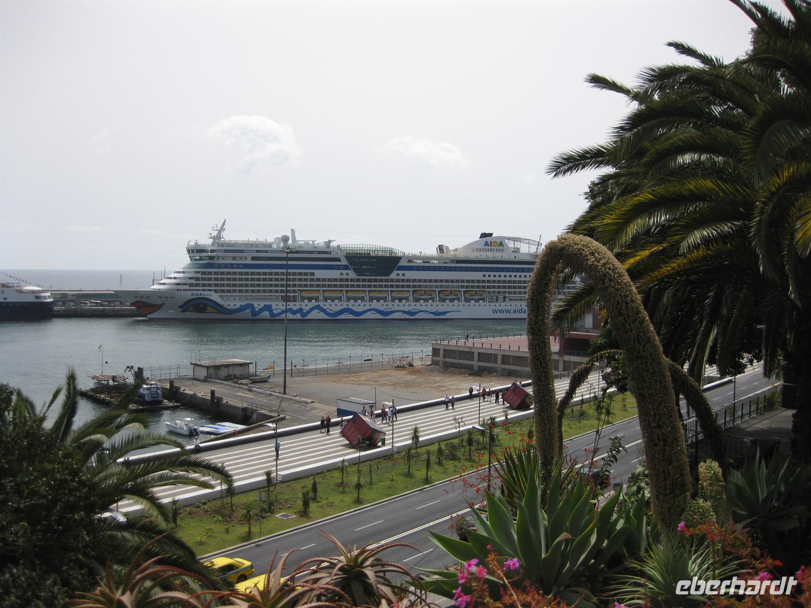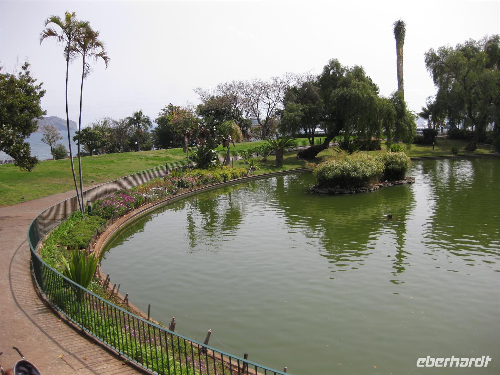 Der dritte Garten auf unserer Tour, der Parque de Santa Catarina, befindet sich in der Stadt direkt oberhalb des Hafens. Wir fahren mit dem Bus hinunter in die Stadt bis zum Hotel und Casino von Madeira. Dort steigen wir aus und gehen weiter zu Fuß bis zum Park. Wir spazieren durch den Park, bewundern auch hier die Pflanzen und insbesondere die Bäume und genießen die Parkanlage. Besonders reizvoll ist der Blick zum Hafen.