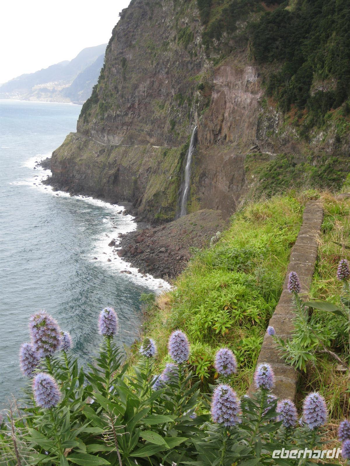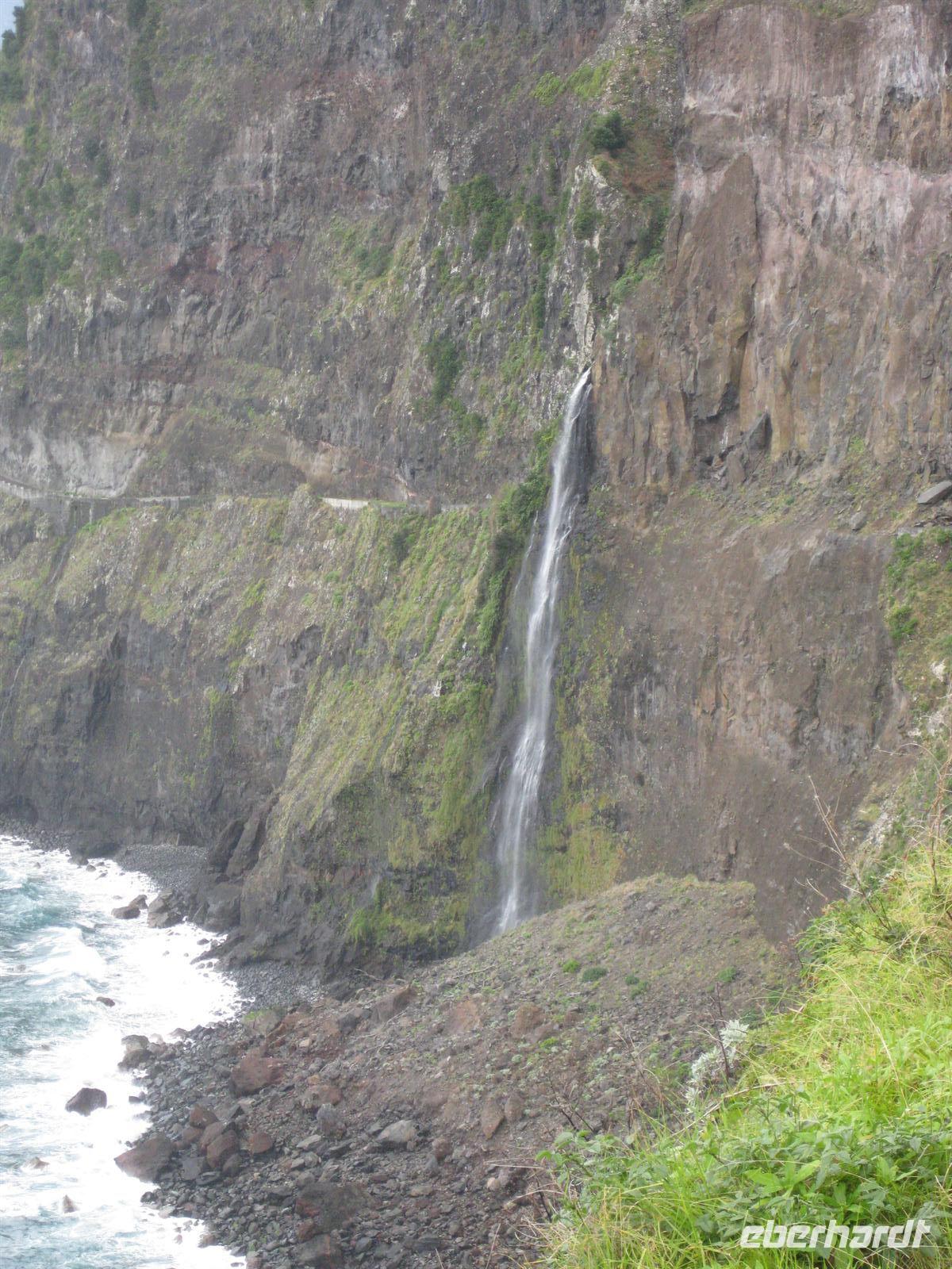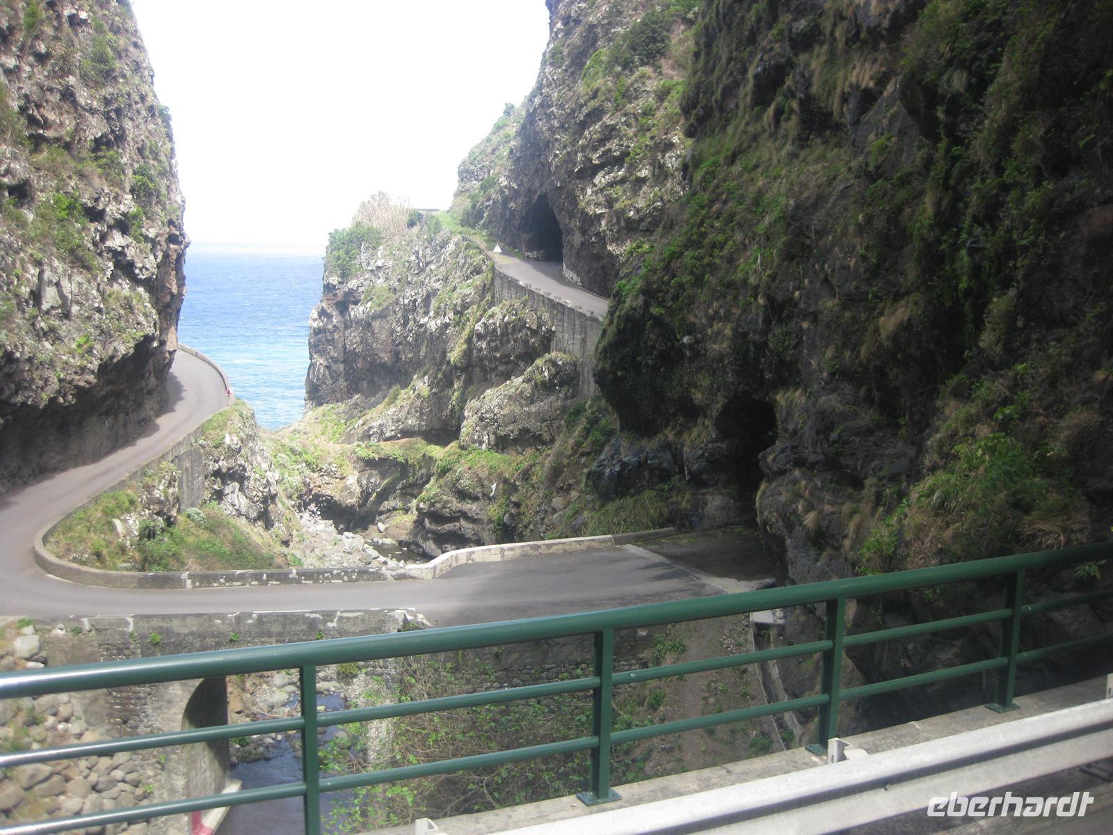 einem Aussichtspunkt hinter Seixal, von dem aus wir den Brautschleierwasserfall gut sehen können. Die Fahrt auf der Küstenstraße ist sehr interessant, mal geht es durch Tunnel und mal kann man das Meer sehen. Nebenan sieht man die alte Küstenstraße, die unmittelbar auf den Felsen am Meer entlang führte. Das muss schon abenteuerlich gewesen sein.