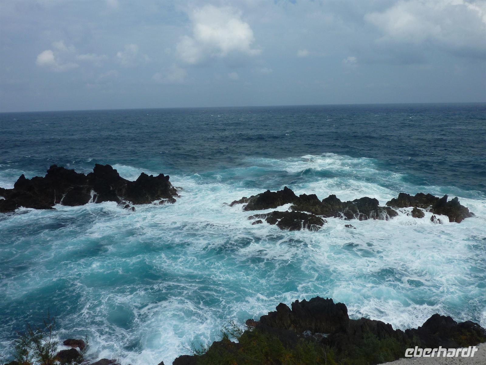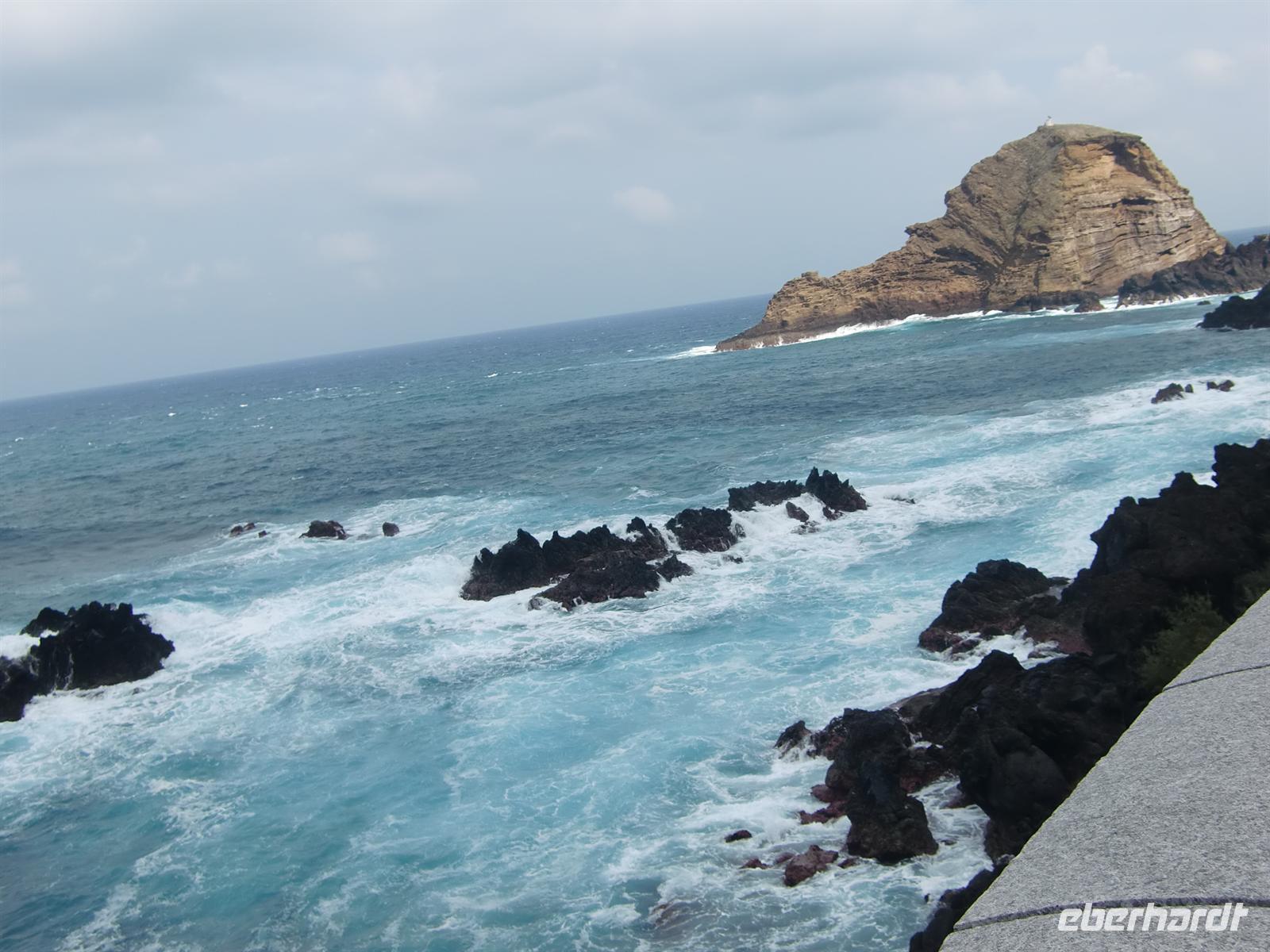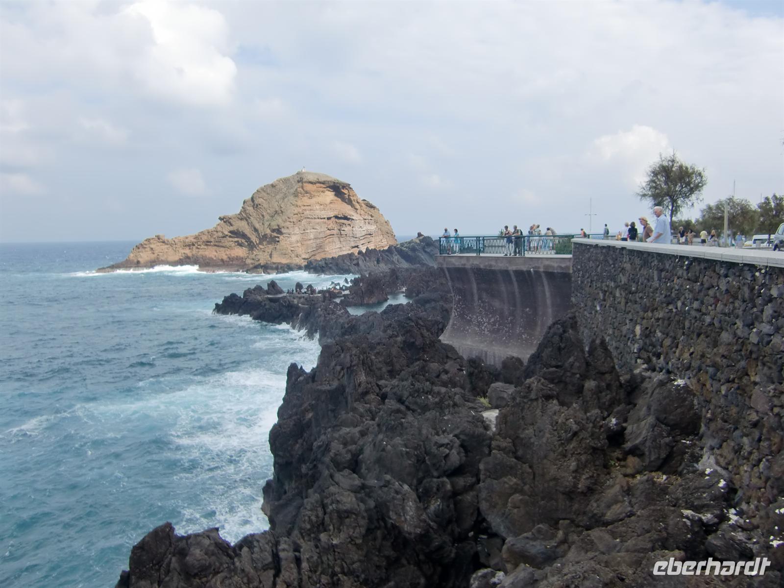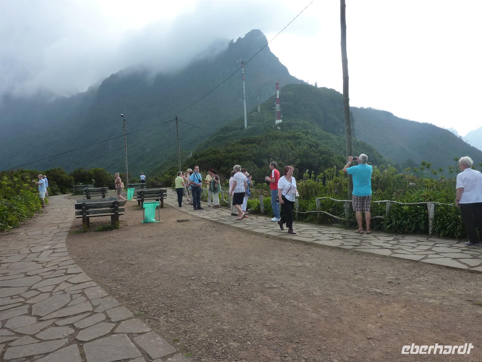 An diesem Tag erwartete uns eine Fahrt zur Nordküste der Insel. Um 8.30 Uhr holte uns unser Transfer mit Busfahrer Paulo und Reiseleiterin Teresa ab. Unser erstes Ziel war Cabo Girão. Hier hat man von der höhsten Steilklippe Europas einen wunderbaren Ausblick auf die Ortschaft. Leider hatten wir nur etwas trübe Sicht und die Sonne wollte auch noch nicht für uns strahlen, aber dennoch war der Blick aus dieser Höhe einfach schön. Sogar in einer Schwindel erregenden Höhe wie dieser haben die Madeirenser noch Terrassenfelder angelegt, die sie mit Obst und Gemüse bebauen; kaum zu glauben, wie diese Felder bewirtschaftet werden. An den Souvenirständen konnte man erste Mitbringsel kaufen, wie Strick- und Korbwaren, Schmuck oder Bonbons. Unser nächstes Ziel war die Ribiera Brava, wo wir in einem lebhaften Ort gelangten, der Freizeitbeschäftigung für jedermann bot. Hier befinden sich zum Beispiel die Kirche São Bento, eine Kirche aus dem 16.Jh., die im typischen Sakralstil gehalten ist. Die Strandpromenade lädt zum Flanieren ein. Dorthin gelangt man von der Kirche am besten durch eine kleine Gasse, die Souvenirläden und kleine Cafés bereithält. Hier hat jeder seine Zeit individuell genutzt, bis wir uns auf die Weiterfahrt mit dem Bus ins Landesinnere begaben. Auf guten 1000m Höhe gelangten wir über zahlreiche Serpentinen zum Encumeada, einem einzigartigen Aussichtspunkt. Von hier aus kann man normalerweise sowohl die Südküste der Insel als auch die Nordküste sehen. Ich schreib „normalerweise“, da uns auch hier das Wetter wieder einen Strich durch die Rechnung gemacht hat. Man konnte leider auf Grund des Nebels nicht so weit gucken, wie wir es gern gehabt hätten. Die zweithöchste Erhebung auf Madeira ist der Bica da Cana mit 1620m Höhe. Hier beginnt auch die Paúl da Serra, Madeiras größte Ebene, die einen kompletten Gegensatz zur schroffen und gebirgigen Landschaft der restlichen Insel darstellt. Über weite Strecken hat man kaum etwas von der Landschaft, die wohl viele an Schottland erinnert, sehen können, da man nur den dichten Nebel vor sich hatte. Trotzdem hatten wir zwischendurch Blick auf wunderschöne Bäume. Wir fuhren entlang der Fanal, einer neu asphaltierten Straße, die noch gar nicht so oft genutzt wird. Am Ende gelangten wir zu einem Aussichtspunkt, von wo aus man einen weiten Teil der Nordküste einsehen konnte, nämlich bis zum Ponta Delgada. Auf dem Weg nach Porto Moniz sahen wir die Illheus da Ribiera da Janela, eine kleine Felsengruppe im Wasser von denen der größte ein Loch hatte, das Fenster, das nie geschlossen wird. Für Teresa die Begründung, warum es an der Nordküste so windig ist. J In Porto Moniz verbrachten wir unsere Mittagspause. Im Restaurant Orca bestellte Teresa schon auf dem Weg unser Mittagessen, so dass schon alles fertig war, als wir ankamen. Man konnte wählen zwischen Degenfisch, Omlette oder Suppe. Dazu gab es Wein/Wasser, Espresso und ein Eis zum Nachtisch.