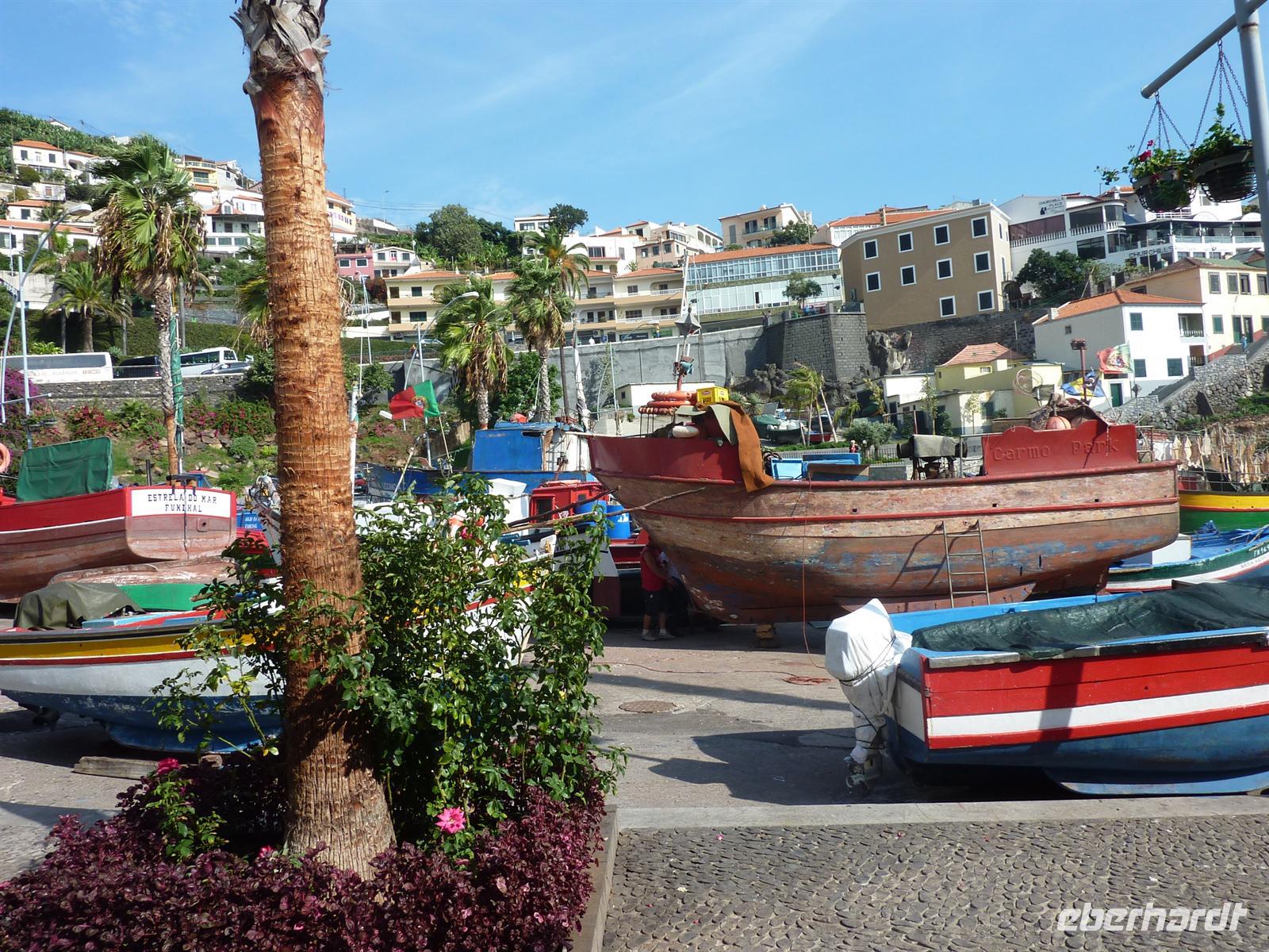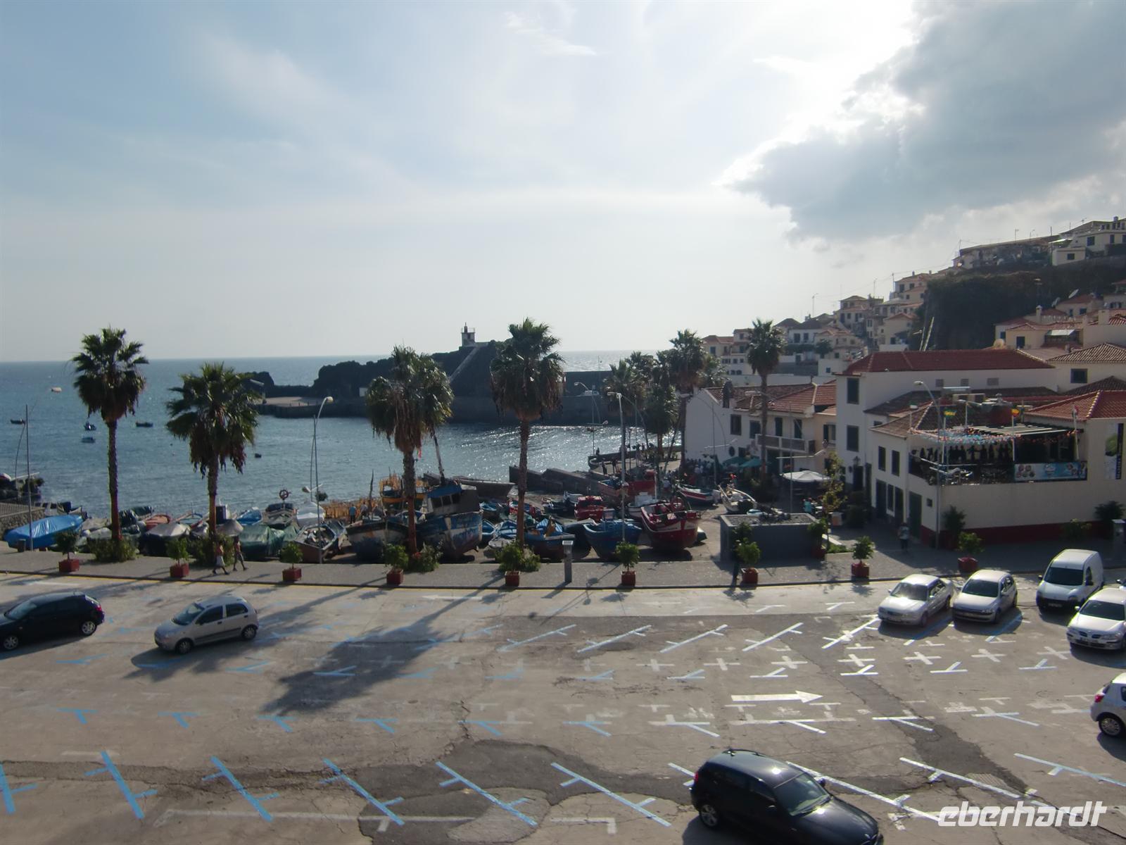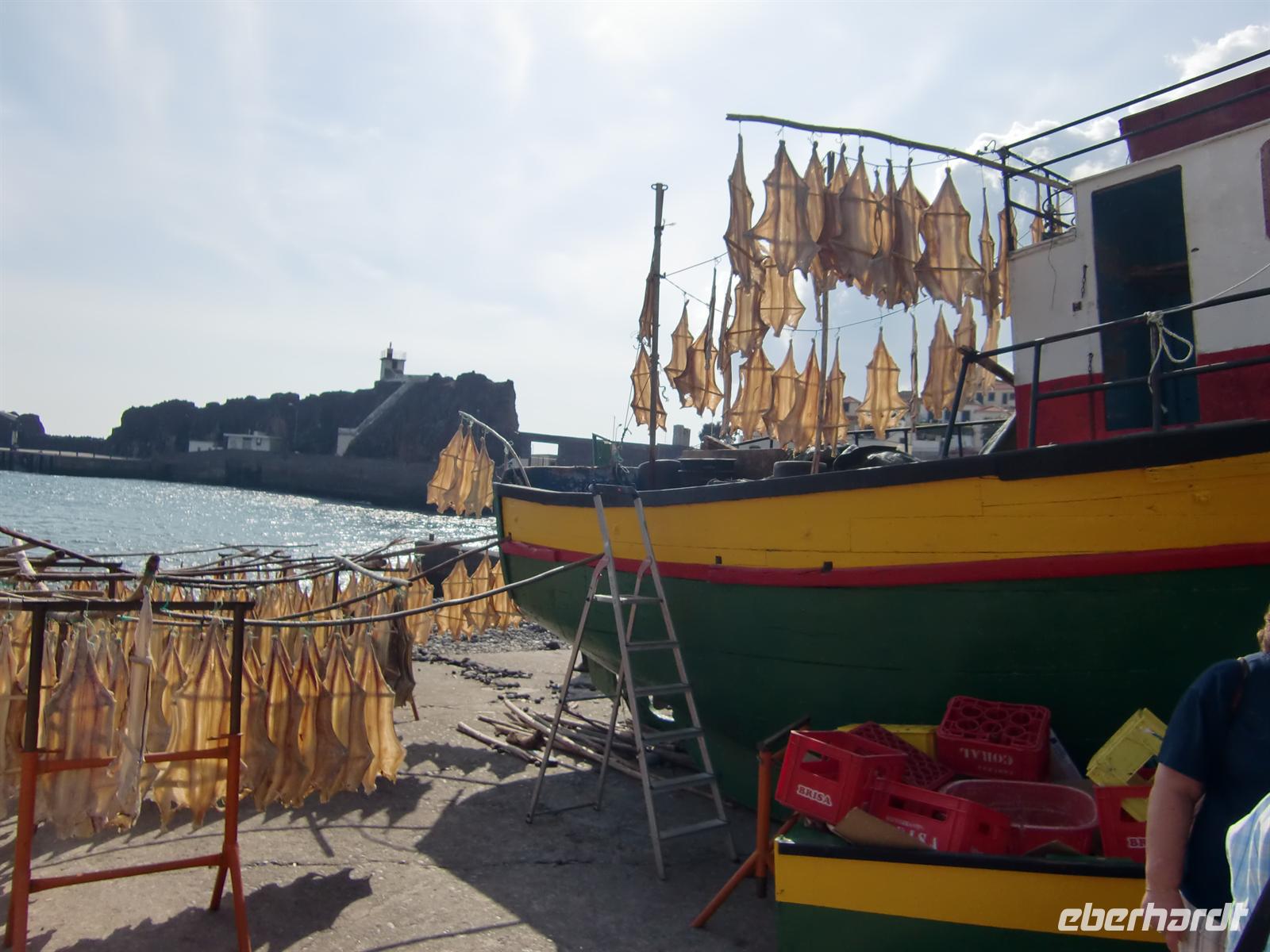 Für den Rückweg von Porto Moniz zurück zur Südküste nahmen wir nicht komplett den gleichen Weg wie hinsondern fuhren diesesmal durch den Berg hindurch und durchquerten somit den längsten Tunnel Madeiras (ca. 3km). In Camara de Lobos, einem kleinen, aber auch dem bekanntesten Fischerort auf Madeira hatten wir noch viel zu entdecken. Man sah dort eine Plattform von der aus Winston Churchill, der bekanntlich auch ein leidenschaftlicher Maler war, seine Bilder malte. Besonders interessant waren die Katzenhaie, die wie Stockfische am Hafen aufgehängt waren. Danach fiel uns eine Gruppe von Menschen auf, größtenteils Männer, die in einer Traube zusammenstanden. Wir waren natürlich neugierig und gingen näher. Teresa erklärte uns, dass das Fischer sind, die bei rauer See nicht mit den Booten raus können und sich mit Karten spielen die Zeit vertreiben. Unser Weg führte uns in ein Lokal, wo wir die Möglichkeit hatten die traditionellen Getränke Madeiras zu probieren, Poncha und Nikita. Damit endete unser Ausflug. Nach dem Aufenthalt in Camara de Lobos kehrten wir zurück zum Hotel. Einige nutzten die Gelegenheit in Canica auszusteigen und sich dort beispielsweise die wunderschöne Gartenanlage der Quinta Splendida anzuschauen. Zum Abendessen gingen wir in das Restaurant A Traineira, welches sich in Laufnähe an der Promenade befindet.