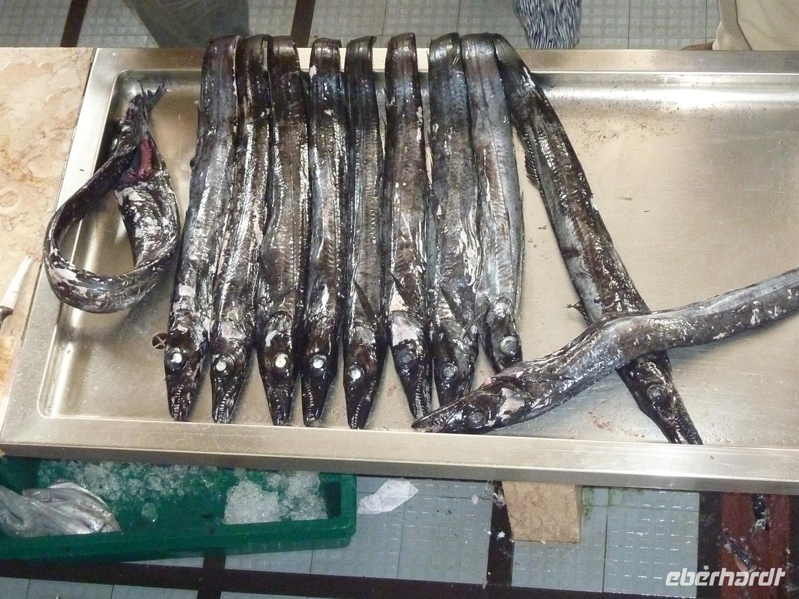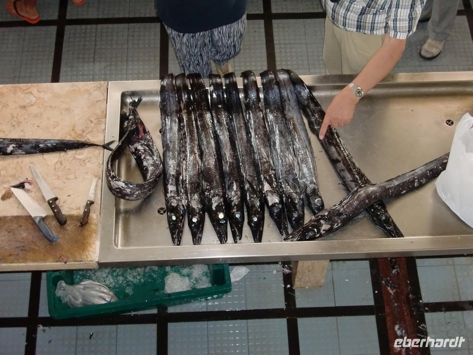 Im Anschluss gingen wir zum Bus und fuhren weiter in Richtung Stadtzentrum. Hier besuchten wir als erstes den Markt, der an Freitagen und Samstagen besonders schon ist, weil neben den üblichen Händlern auch die örtlichen Obst- und Gemüsehändler da sind um ihre Ware anzubieten. Natürlich zog es uns auch in die Fischhalle. Die meisten von uns hatten schon ein oder mehrere Male den so berühmten Degenfisch gegessen. Hier konnten wir ihn in seiner vollen Pracht sehen. Degenfische werden aus mehr als 1000m Wassertiefe gefangen und bekommen erst dann durch den starken Druckverlust ihre schwarze Farbe. Auch hier konnte sich jeder ganz individuell umschauen, Obst und Gemüse probieren oder auch etwas kaufen. Danach fuhren wir in die Weinkellerei „D’Oliveiras“ um den bekannten Madeirawein zu probieren. Wir bekamen verschiedene Arten zum Probieren, darunter auch ein fünfjähriger. Dazu gab es Bolo de Mar, eine Art Honigkuchen, der ein bisschen an deutschen Lebkuchen erinnert, nur viel leckerer Hier hatten wir die Gelegenheit für die Daheimgebliebenen ein paar Kleinigkeiten mitzunehmen. Unser nächstes Ziel war die Kirche São João Evangelista. Im Inneren sahen wir vergoldete Schnitzereien und die typischen Kachelbilder. Über kleine Gassen der Stadt entlang kamen wir zur Sé, der Kathedrale Funchals. Diese konnten wir leider nicht besichtigen, da sie von 12.30 bis 14.30 Uhr geschlossen ist. Also gingen wir die Allee Richtung Bus zurück. Die Innenstadt Funchals ist geprägt von einer langen geraden Straße, die mit Bäumen bepflanzt ist. Wir müssen allerdings alle noch einmal zu einer anderen Jahreszeit hin um sie in ihrer vollen Blütenpracht zu sehen. An dieser Stelle konnte man sich entscheiden, ob man den restlichen Tag in der Stadt verbringen oder wieder mit dem Bus zurückfahren möchte. Einige nutzten die Gelegenheit in der Stadt zu bleiben und mit der Seilbahn nach Monte zu fahren. Für unsere Gruppe war heute ein Tisch im Restaurant „Atlantis“ reserviert. Das Restaurant ist direkt über dem Meer gelegen und ist über einen Fahrstuhl zu erreichen. Wir waren von anderen Restaurants schon so verwöhnt, als uns dieses Abendbrot hätte wirklich beeindrucken können. Dennoch muss man sagen, dass es gut geschmeckt hat und wir einen angenehmen Abend hatten.