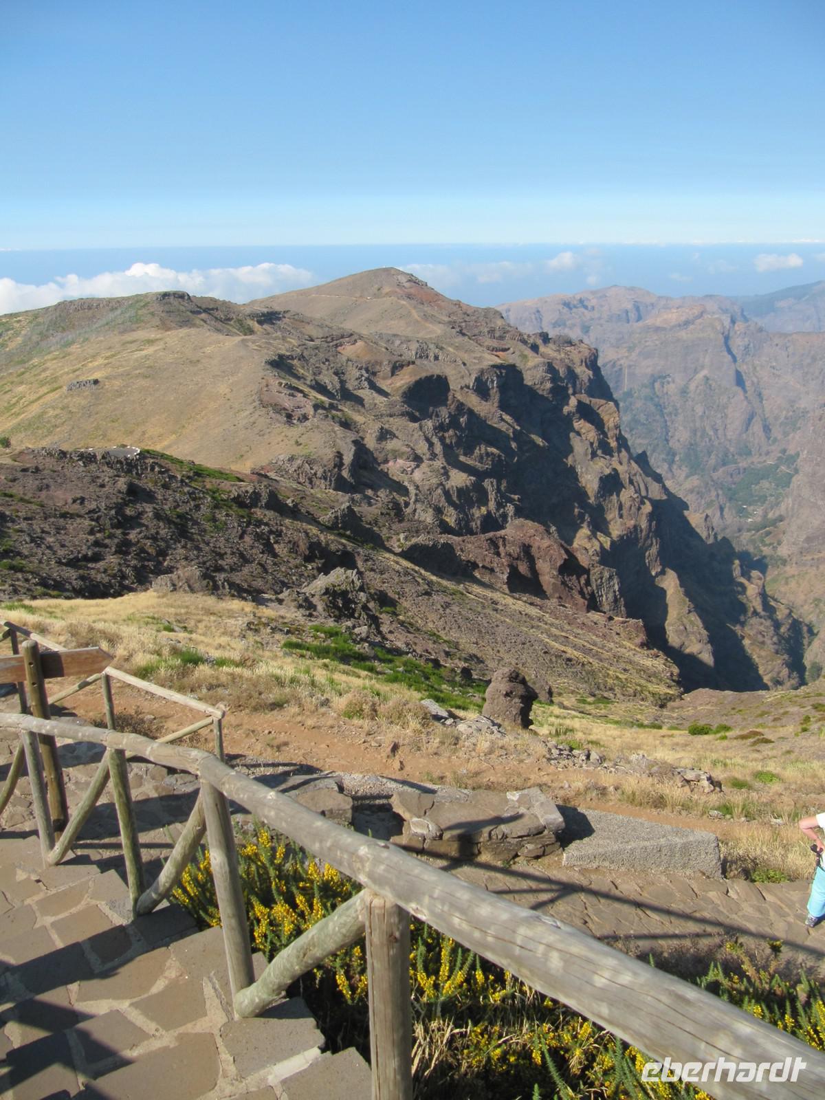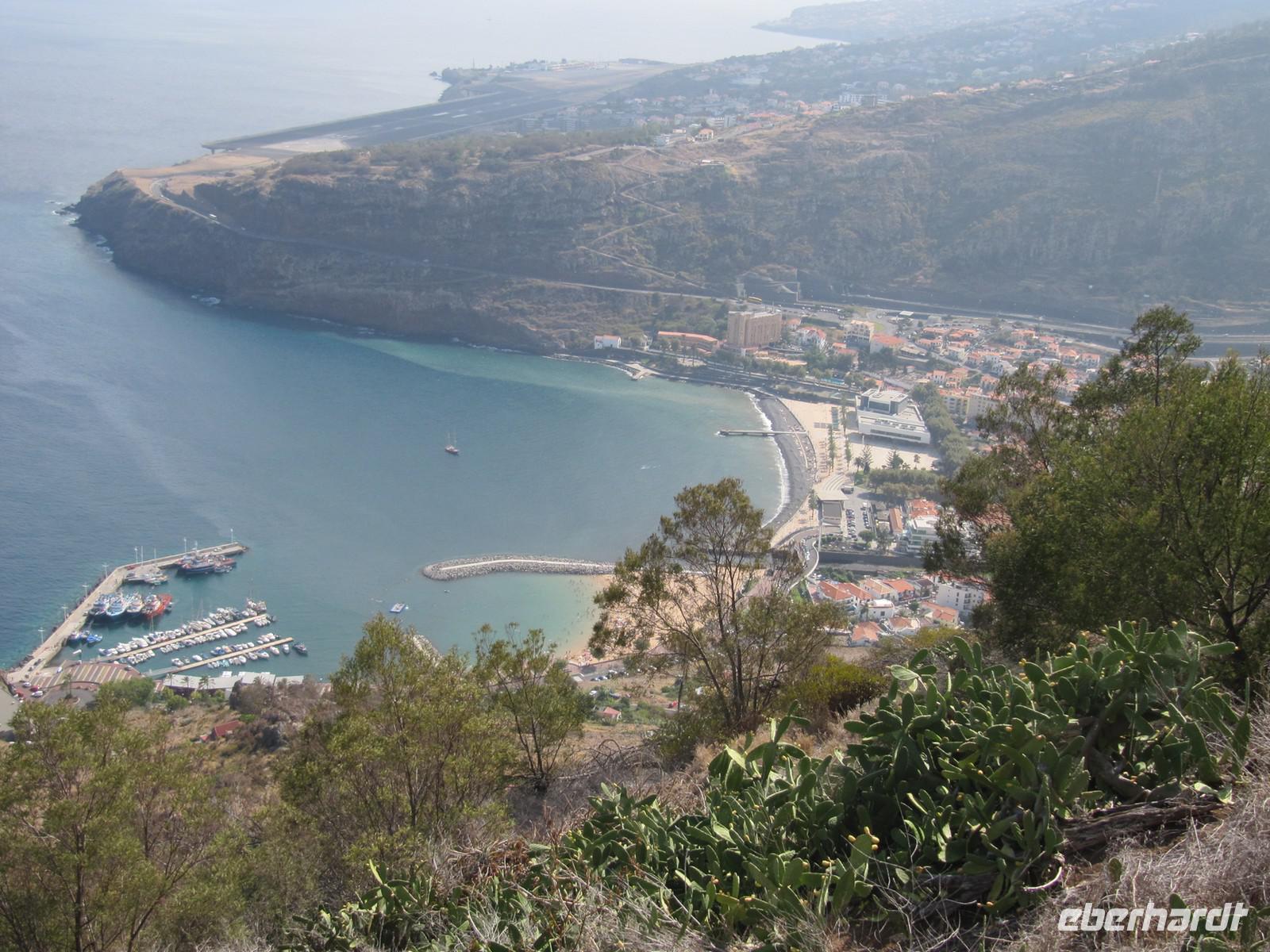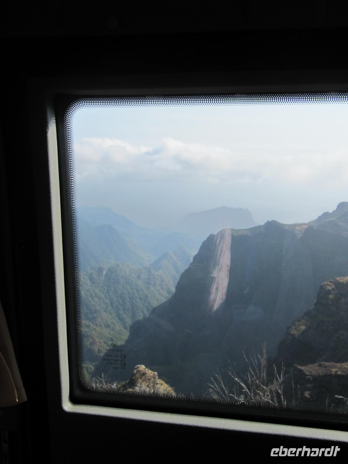 Von dort fuhren wir zum Pico do Arieiro (1818m), dem dritthöchsten Berg Madeiras. Von dort hat man einen weiten Blick auf die umliegende Landschaft. Viele Wanderer starten von hier aus ihre Touren. Wir hingegen stiegen wieder gemütlich in den Bus und fuhren zur Forellenzuchtstation Ribeiro Frios. Etwas weiter die Straße runter gibt es Souvenirläden und ein Café. Von hier aus starteten wir zu einer kleinen Wanderung auf gerader Strecke entlang einer Levada. Diese kleine Tour war zum Testen, ob wir alle fit waren für unsere größere Wanderung am nächsten Tag J. Danach fuhren wir in die traditionelle Kleinstadt Santana. Sie ist bekannt für die buntgestrichenen Bauernhäuser, deren Strohdächer fast bis zum Boden reichen. Nach dem von allen sehr gelobten Mittagessen hatten wir noch Zeit für eine kleine Besichtigung des Ortes, um die hübschen Häuschen zu fotografieren. Die Rückfahrt erfolgte über Faial und zum Aussichtspunkt Penha de Águia, wo einige Gäste bereits eine erste Auswahl über die später mitzunehmenden Pflanzen trafen und gemeinsam Ihr Pflanzenwissen erörterten. Über den Portela Pass schließlich gelangten wir zum Pico de Facho, von dessen Aussichtspunkt man einen direkten Blick auf den einzigen weißen Sandstrand der Insel in Machico sowie bis zur Ostspitze der Insel hat. Danach fuhren wir zurück ins Hotel, wo einige Gäste mit mir in einem nahe gelegenen Restaurant den Abend ausklingen lassen.