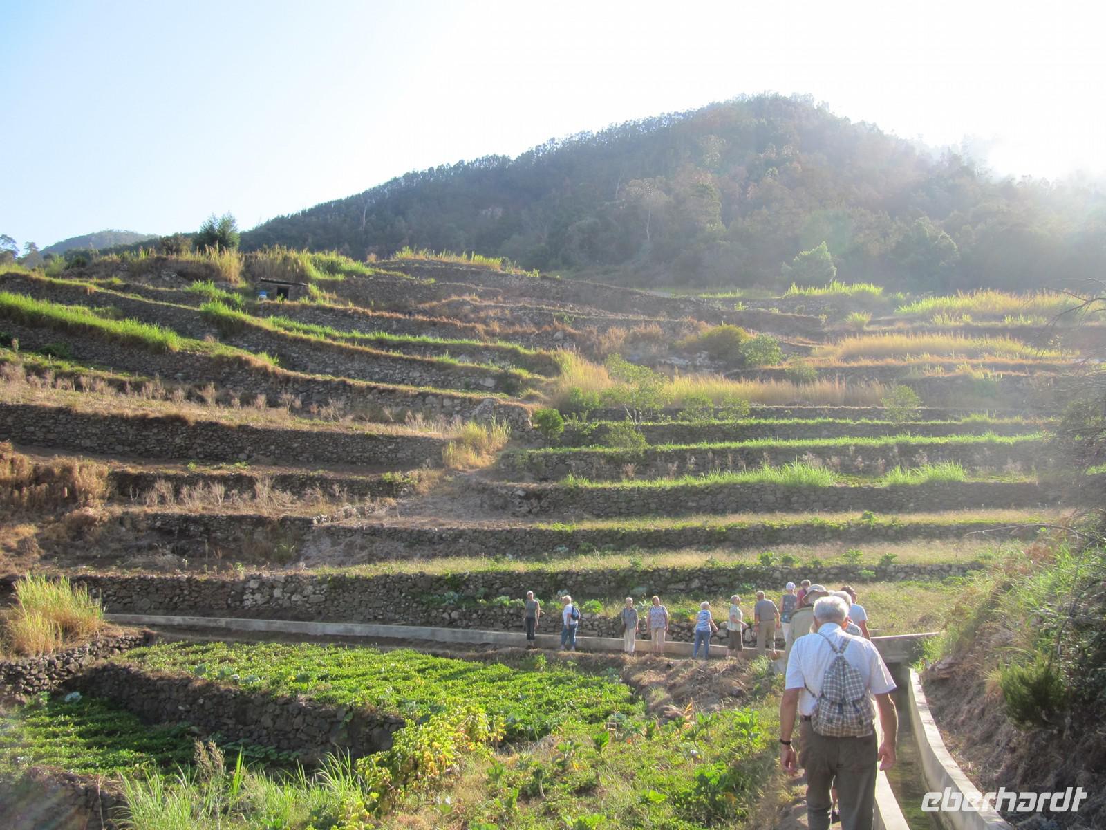 Gestern haben wir das Wandern getestet und weils so schön war, schnüren wir heute wieder unsere Wanderschuhe und machen uns auf den Weg entlang der Levada von Marocos. Die für Madeira typischen Bewässerungskanäle, die zum Teil schon im 15. Jahrhundert künstlich angelegt wurden, führen uns vorbei an pittoresken Terrassenlandschaften, wilden Blumen und sorgsam gepflegten Feldern. Helena nimmt immer wieder Kontakt zu den Einheimischen auf und so bekommen eine Ahnung vom schwierigen Leben der Bauern, die in dieser Höhe jeden Zentimeter bewirtschaften. Manche zweigen - mit nicht ganz legalen Mitteln- das Wasser aus der Levada ab, um Ihre Erde zu bewässern. An einem kleinen Cafe machen wir am Ende Rast und sind uns alle einig: Diese Wanderung hätte noch länger gehen können! Der steile Abstieg jedoch geht in die Knie und wir freuen uns alle auf einen gemütlichen Nachmittag in unserem schönen Hotel. Einige verbringen die Zeit am Pool, andere machen einen kleinen Rundgang durch unseren Ferienort Caniço. Einige Gäste nahmen den doch etwas beschwerlichen Weg ans Meer auf sich und berichteten am Abend von ihrem Bad im Atlantik. Abends genießen wir ein leckeres Essen in Klenk's Café auf der Terrasse.