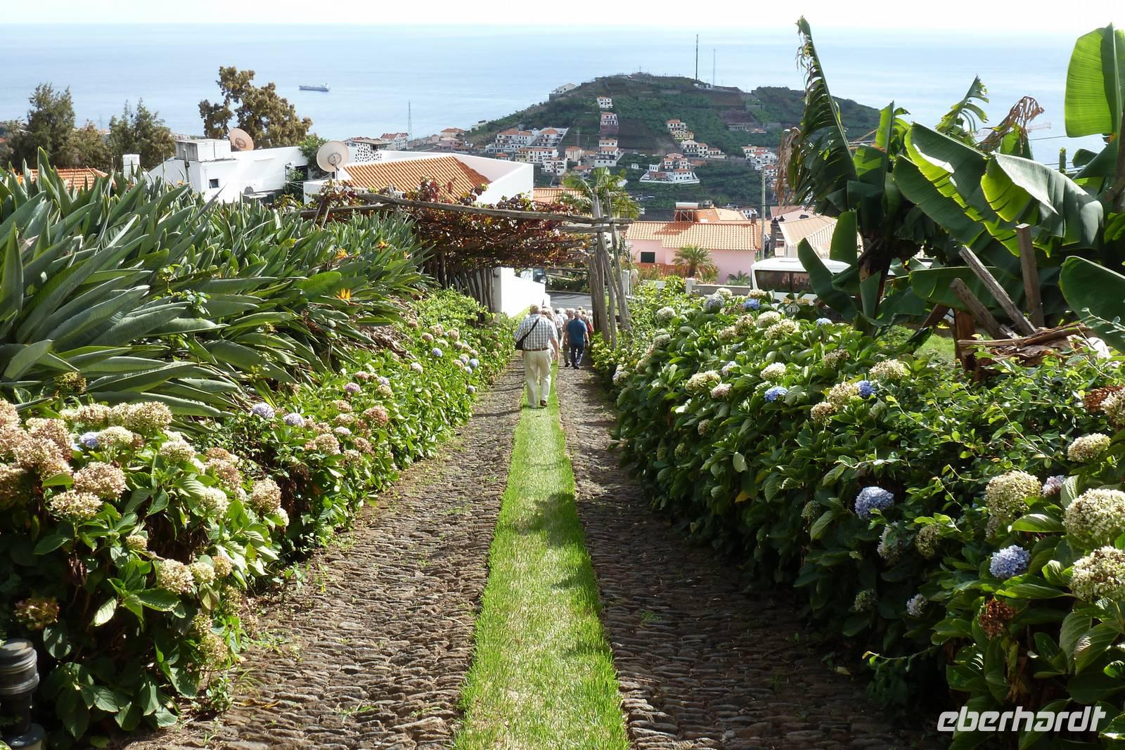 Nachmittags wurden die Augen durch die herrliche Vielfalt der Pflanzen im Botanischen Garten strapaziert. Ob Exoten oder heimische Pflanzen - Helena leitete uns mit großer Leidenschaft und viel Kompetenz durch das Labyrinth der Artenvielfalt. Entlang der bekanntesten Hotels und dem teuersten Wohnviertel von Funchal machten wir einen Zwischenstopp im Herrenhaus eines Weingutes und ließen uns Madeira-Wein und traditionelle Lebkuchen schmecken. Nach dem Fotostopp an Europas höchster Klippe, dem Cabo Girao, endet die heutige Tour in Camara de Lobos. Schon Churchill erkannte die Schönheit dieses Fischerortes. Hier faszinierte uns der Hafen mit seinen Fischerbooten, die reich ausgestattete Kapelle oder die Dorfkirche.