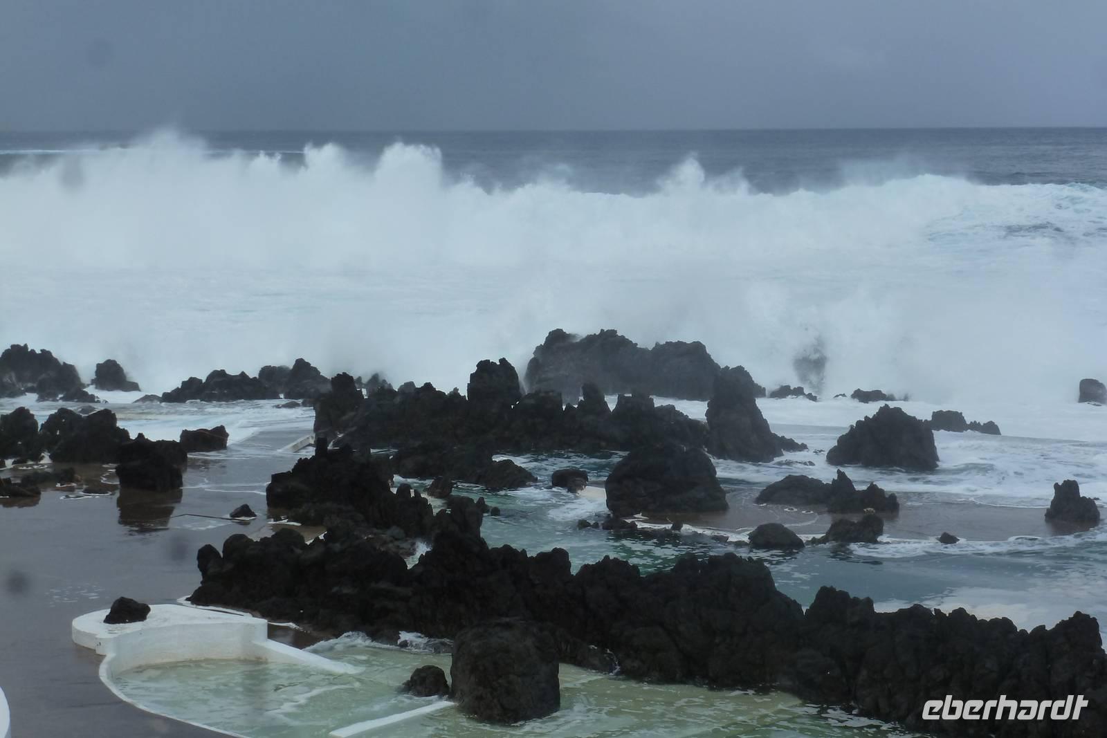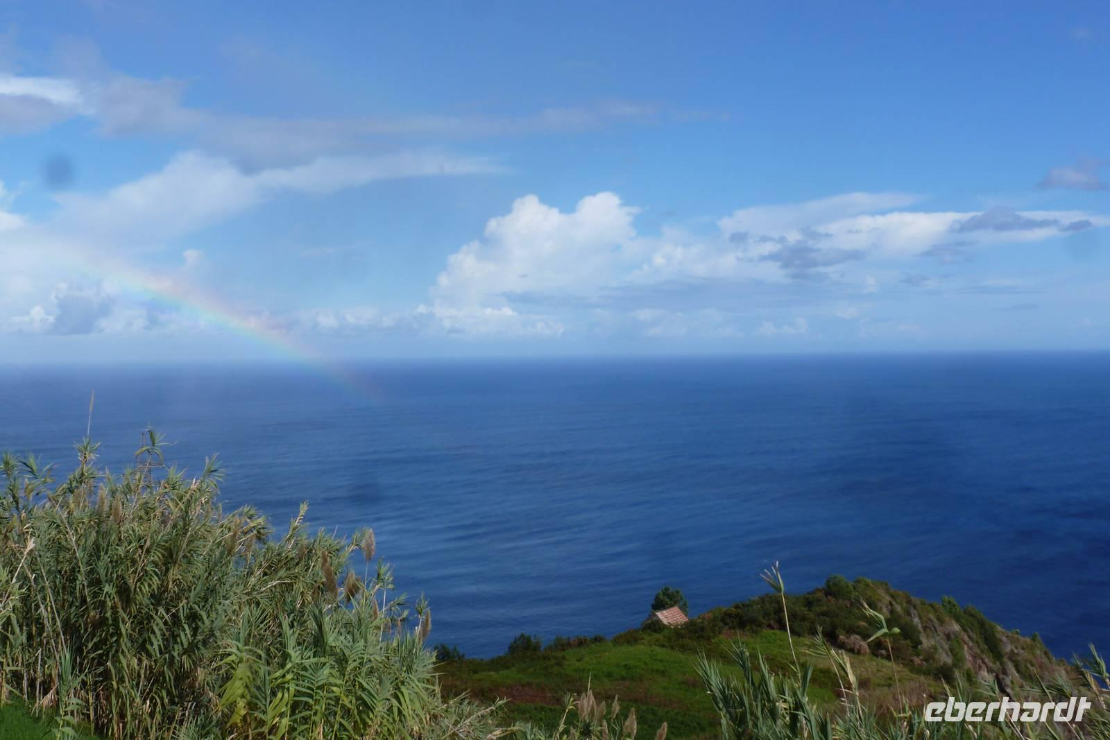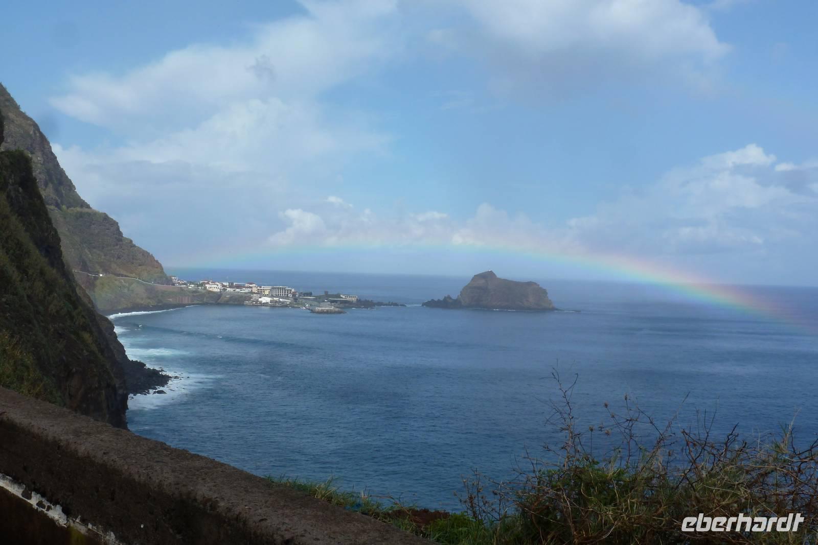 Wieder einmal war uns der Wettergott nicht wohl gesonnen - trübes und feuchtes Wetter begleitete unseren Ausflug. Unseren ersten Stopp machten wir im Küstenort Ribeira Brava und besichtigten die kleine Kirche des Ortes. Im Inneren prunkvoll ausgestattet vielen die Kronleuchter aus böhmischen Glas sofort ins Auge. Vorbei an Ponta do Sol und den zahlreichen Bananenplantagen ging es in Richtung Norden bergauf nach Paul da Sera, auch Hochmoor genannt. Heute Naturschutzgebiet ist es nach wie vor wichtig für die Wasserversorgung der Insel. In Porto Moniz, an der Nordost-Spitze der Insel war endlich die Sonne wieder kurz da. Uns wurde neben den vielen Regenbogen eine traumhafte Brandung an den Naturschwimmbecken geboten. Bei strömendem Regen besichtigten wir den Brautschleierwasserfall in der Nähe von Sao Vincente. Am Abend heißt es fast Abschied nehmen von Madeira. Aber nicht ohne einen traditionellen Espetada (Fleisch-Spieß) im Restaurant „Vasgo da Gama"" über den Dächern von Funchal zu probieren.