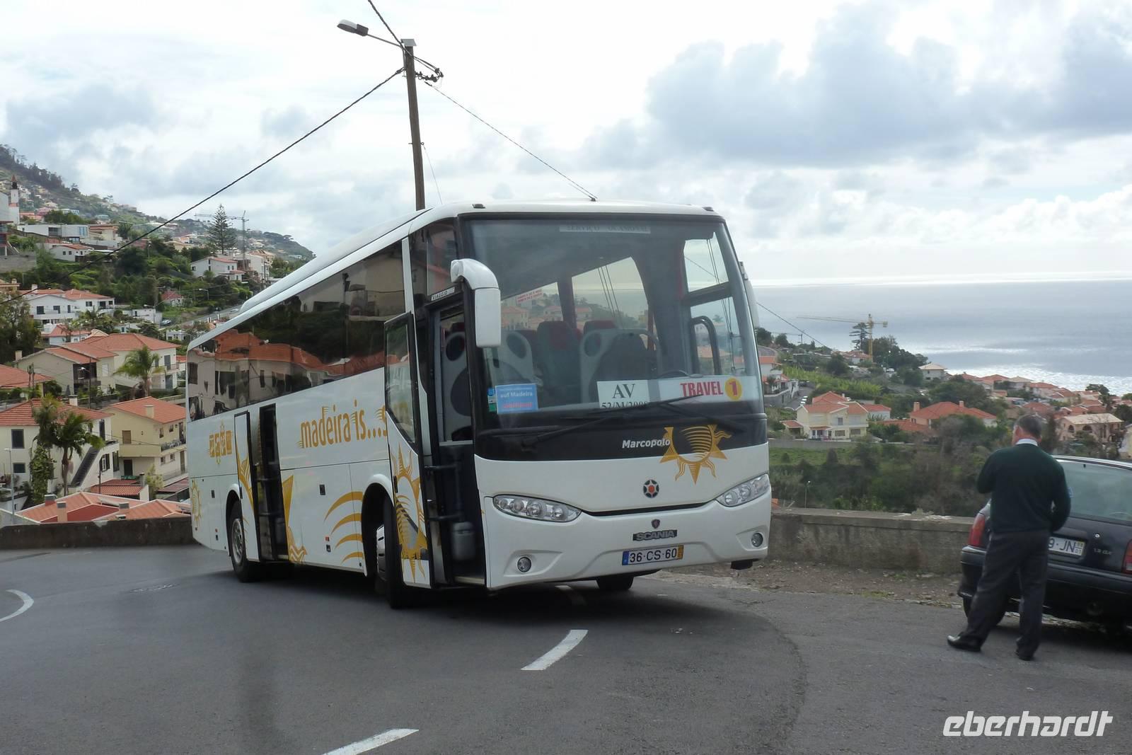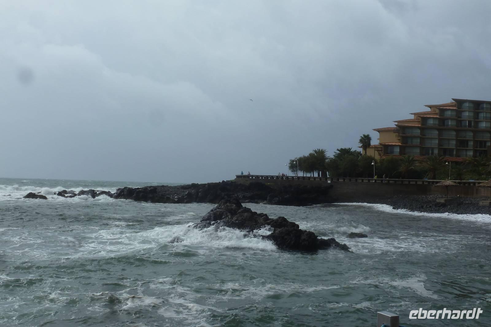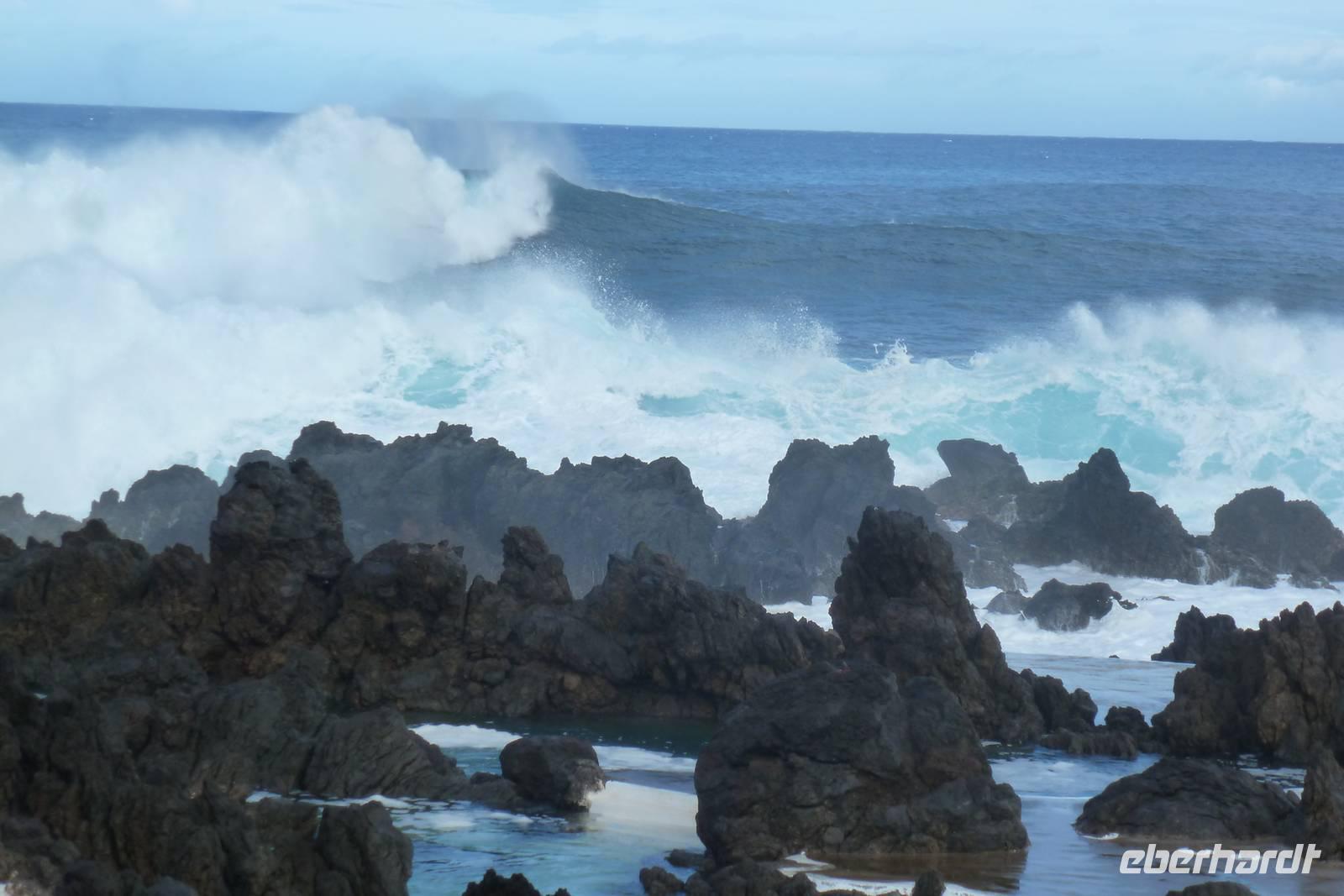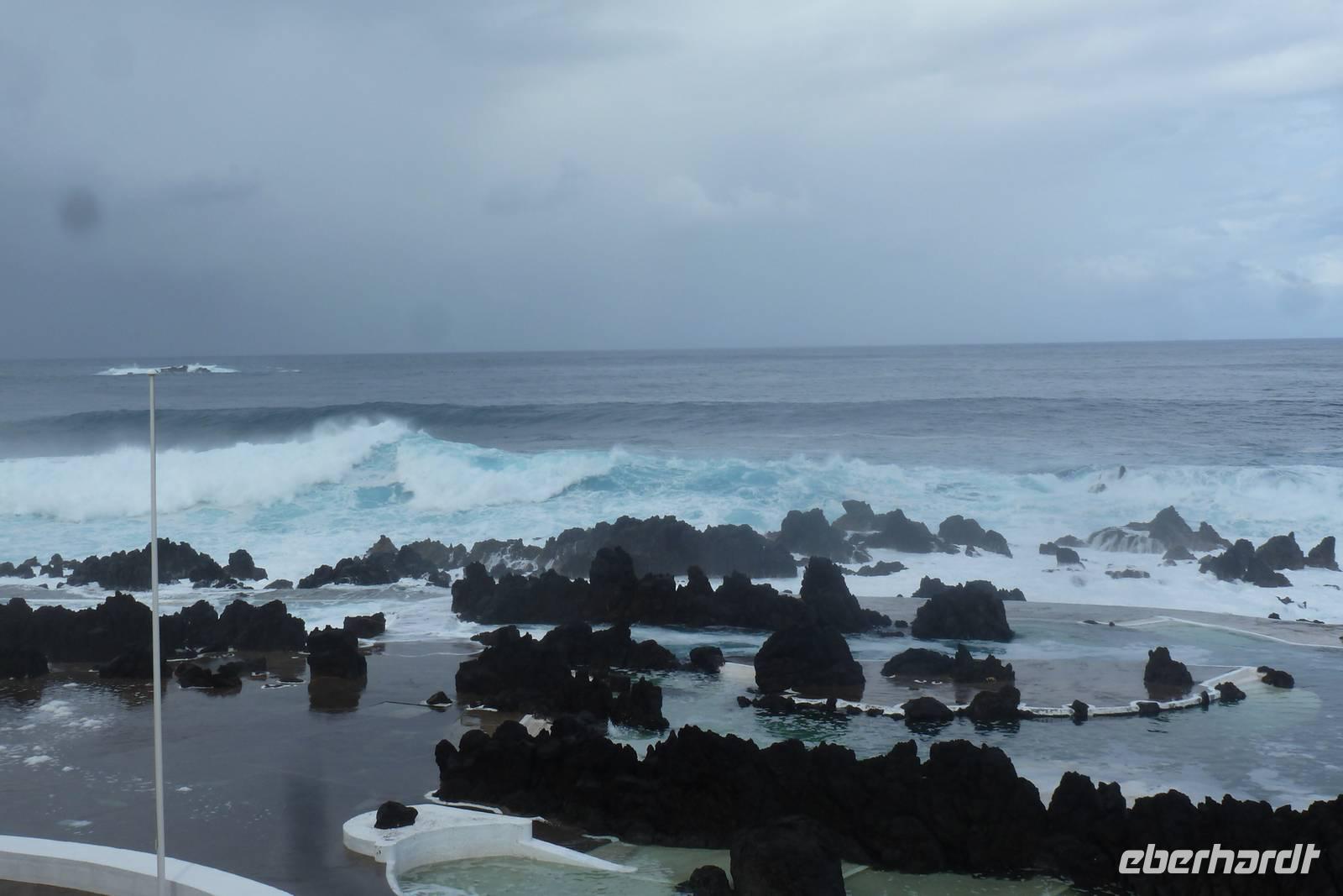 Wieder einmal war uns der Wettergott nicht wohl gesonnen - trübes und feuchtes Wetter begleitete unseren Ausflug. Unseren ersten Stopp machten wir im Küstenort Ribeira Brava und besichtigten die kleine Kirche des Ortes. Im Inneren prunkvoll ausgestattet vielen die Kronleuchter aus böhmischen Glas sofort ins Auge. Vorbei an Ponta do Sol und den zahlreichen Bananenplantagen ging es in Richtung Norden bergauf nach Paul da Sera, auch Hochmoor genannt. Heute Naturschutzgebiet ist es nach wie vor wichtig für die Wasserversorgung der Insel. In Porto Moniz, an der Nordost-Spitze der Insel war endlich die Sonne wieder kurz da. Uns wurde neben den vielen Regenbogen eine traumhafte Brandung an den Naturschwimmbecken geboten. Bei strömendem Regen besichtigten wir den Brautschleierwasserfall in der Nähe von Sao Vincente. Am Abend heißt es fast Abschied nehmen von Madeira. Aber nicht ohne einen traditionellen Espetada (Fleisch-Spieß) im Restaurant „Vasgo da Gama"" über den Dächern von Funchal zu probieren.