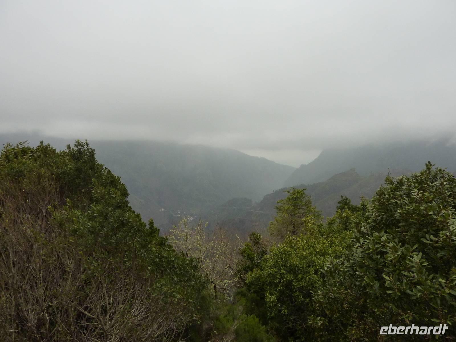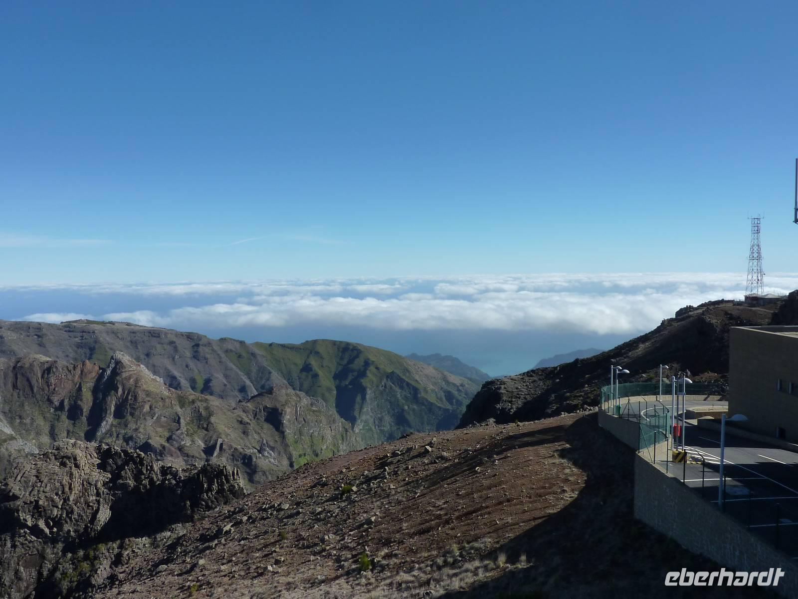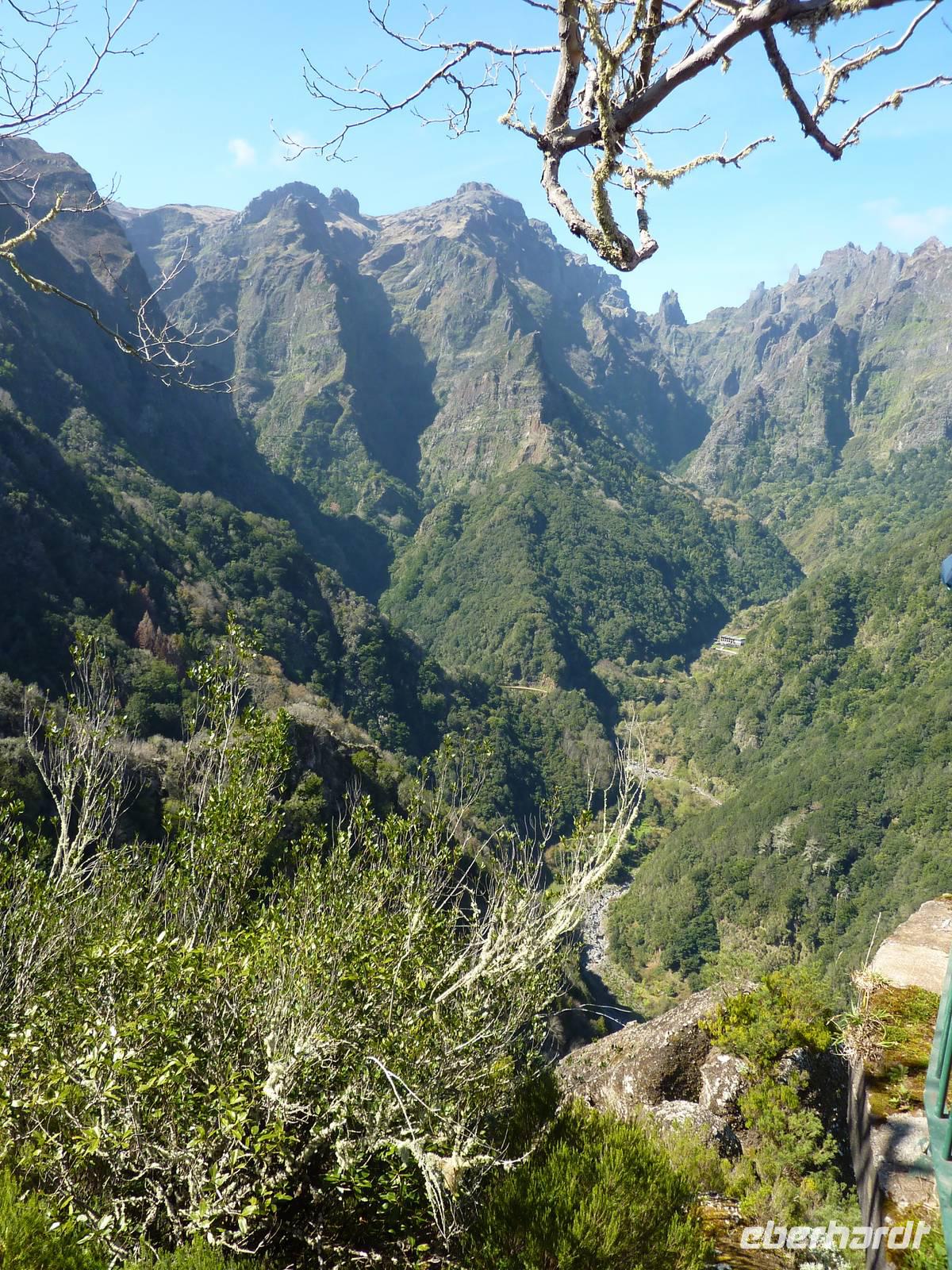 Nun fuhren wir zum Pico do Arieiro (1818 m), dem dritthöchsten Berg Madeiras. Es gab eine klare Sicht ohne Wolken und wir hatten einen weiten Blick auf die umliegende Landschaft, auch die Hochebene Paul de Serra mit den Windrädern konnten wir klar und deutlich sehen. Den Wanderweg zum Pico Ruivo starteten hier einige Wanderer. Wir hingegen stiegen wieder gemütlich in den Bus und fuhren nach Ribeiro Frio. Hier gibt es eine sehenswerte Forellenzuchtstation, eine Ausflugsgaststätte, ein Café und, natürlich, Souvenirläden. Marbelia führte uns bei einer kleinen Levadawanderung durch den Wald zum Aussichtspunkt Balcoes. Es war tatsächlich ein toller Blick vom Balkon! Diese kleine Tour machte uns Geschmack für die größere Wanderung am nächsten Tag.