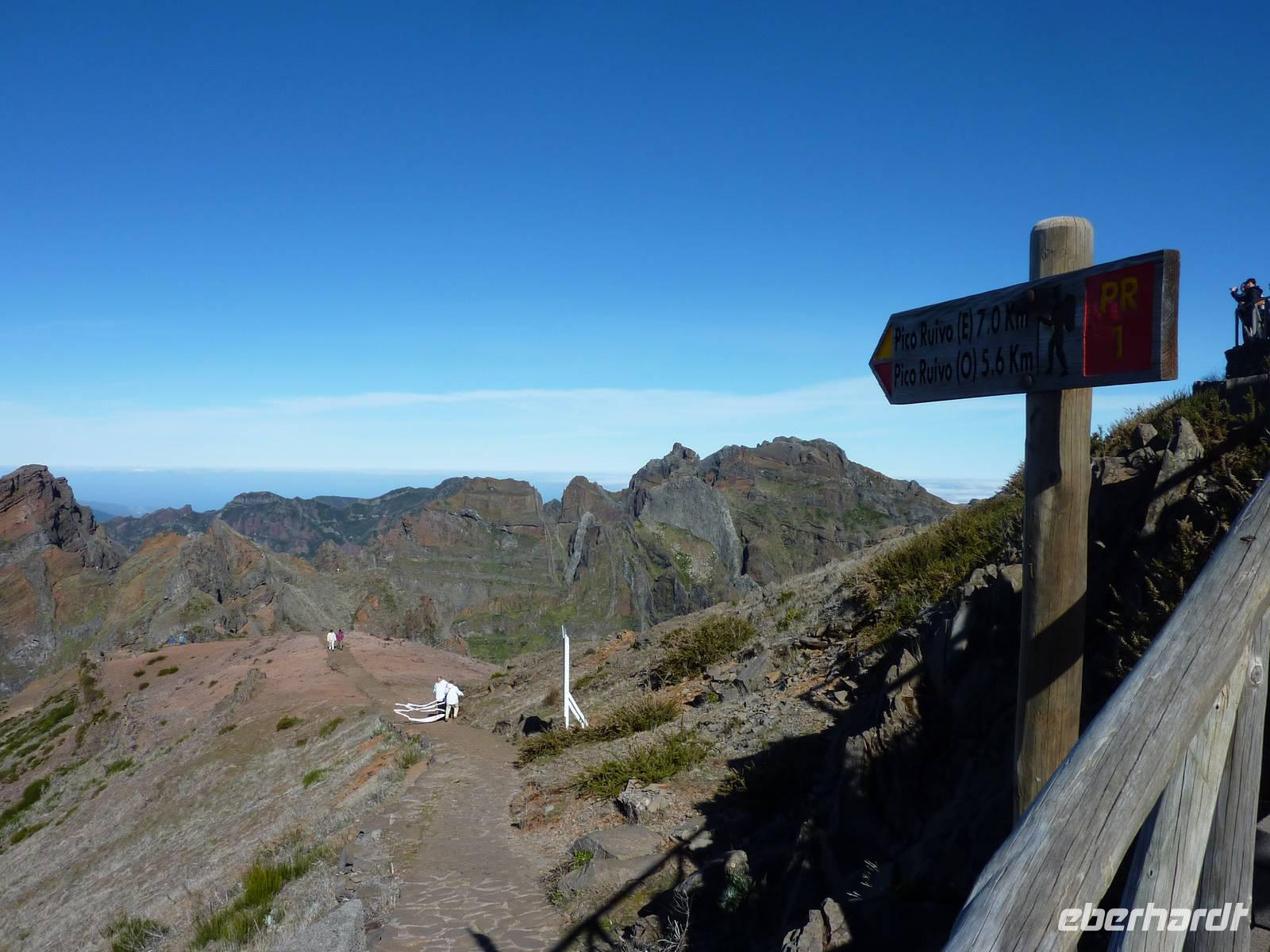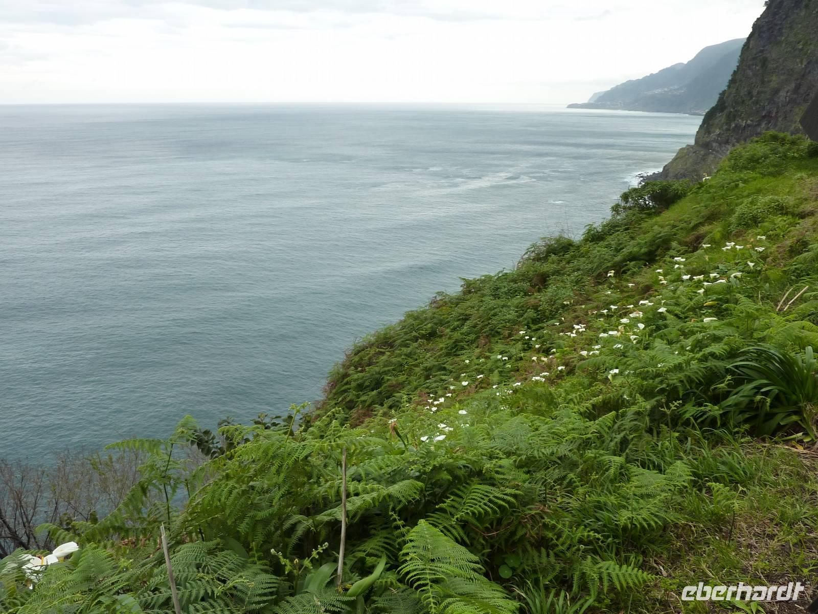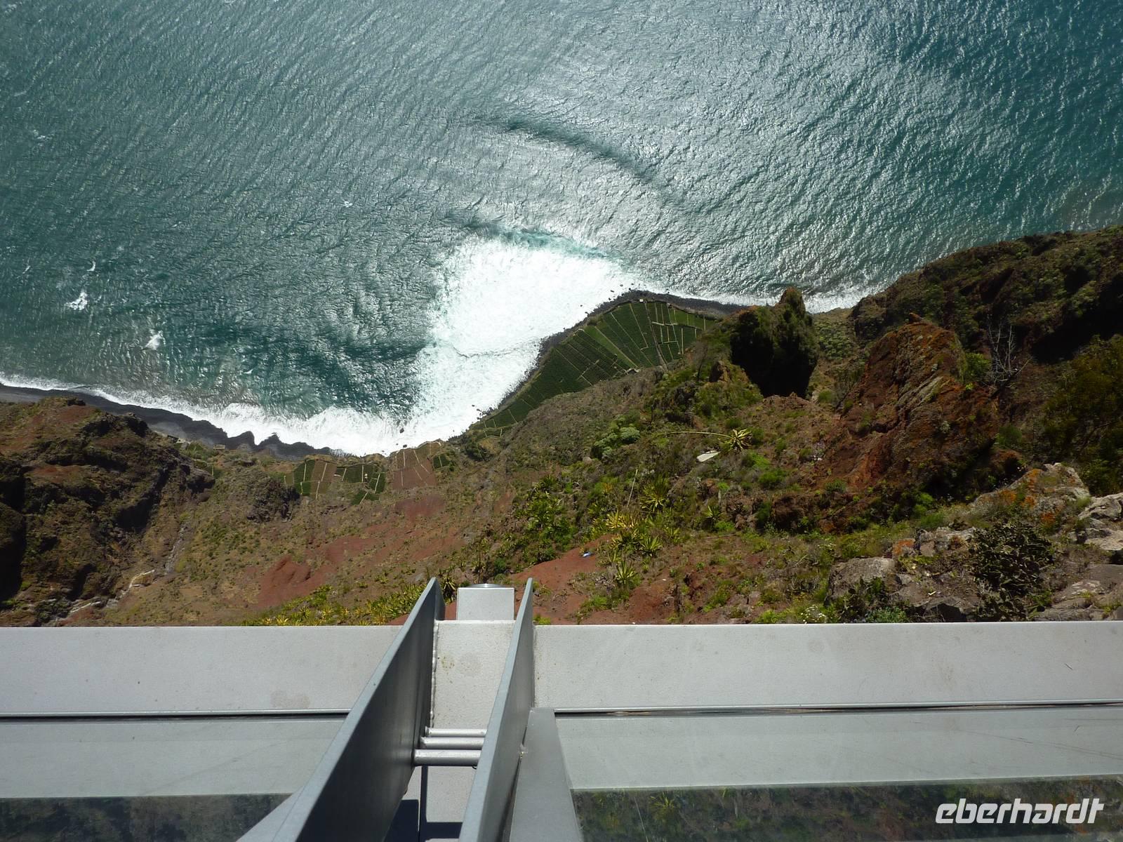 Nun fuhren wir zum Pico do Arieiro (1818 m), dem dritthöchsten Berg Madeiras. Es gab eine klare Sicht ohne Wolken und wir hatten einen weiten Blick auf die umliegende Landschaft, auch die Hochebene Paul de Serra mit den Windrädern konnten wir klar und deutlich sehen. Den Wanderweg zum Pico Ruivo starteten hier einige Wanderer. Wir hingegen stiegen wieder gemütlich in den Bus und fuhren nach Ribeiro Frio. Hier gibt es eine sehenswerte Forellenzuchtstation, eine Ausflugsgaststätte, ein Café und, natürlich, Souvenirläden. Marbelia führte uns bei einer kleinen Levadawanderung durch den Wald zum Aussichtspunkt Balcoes. Es war tatsächlich ein toller Blick vom Balkon! Diese kleine Tour machte uns Geschmack für die größere Wanderung am nächsten Tag.