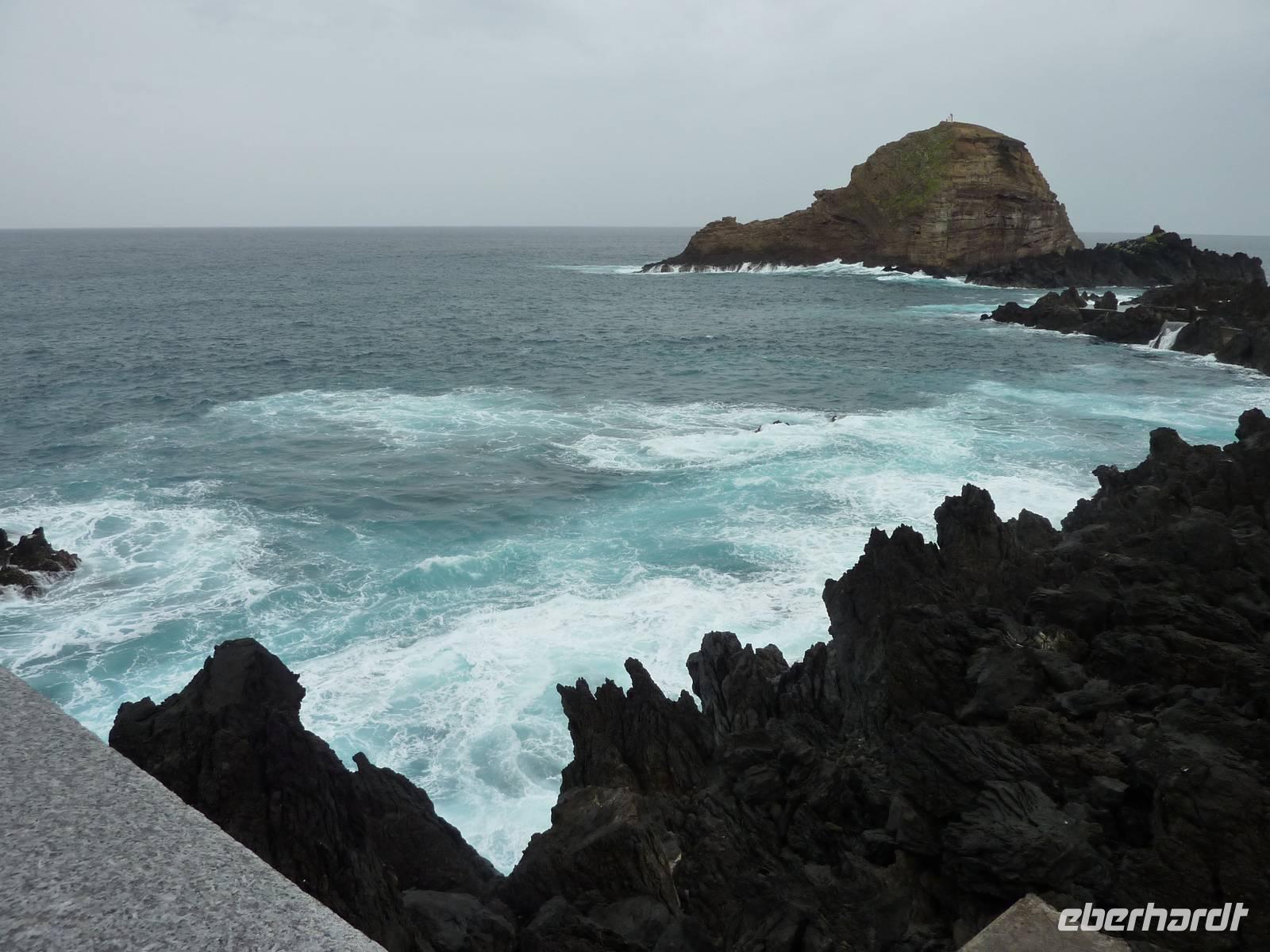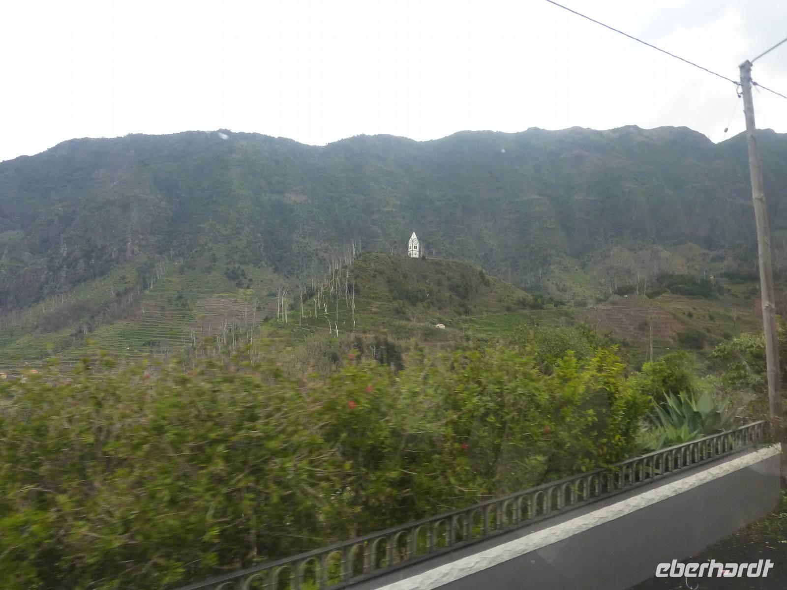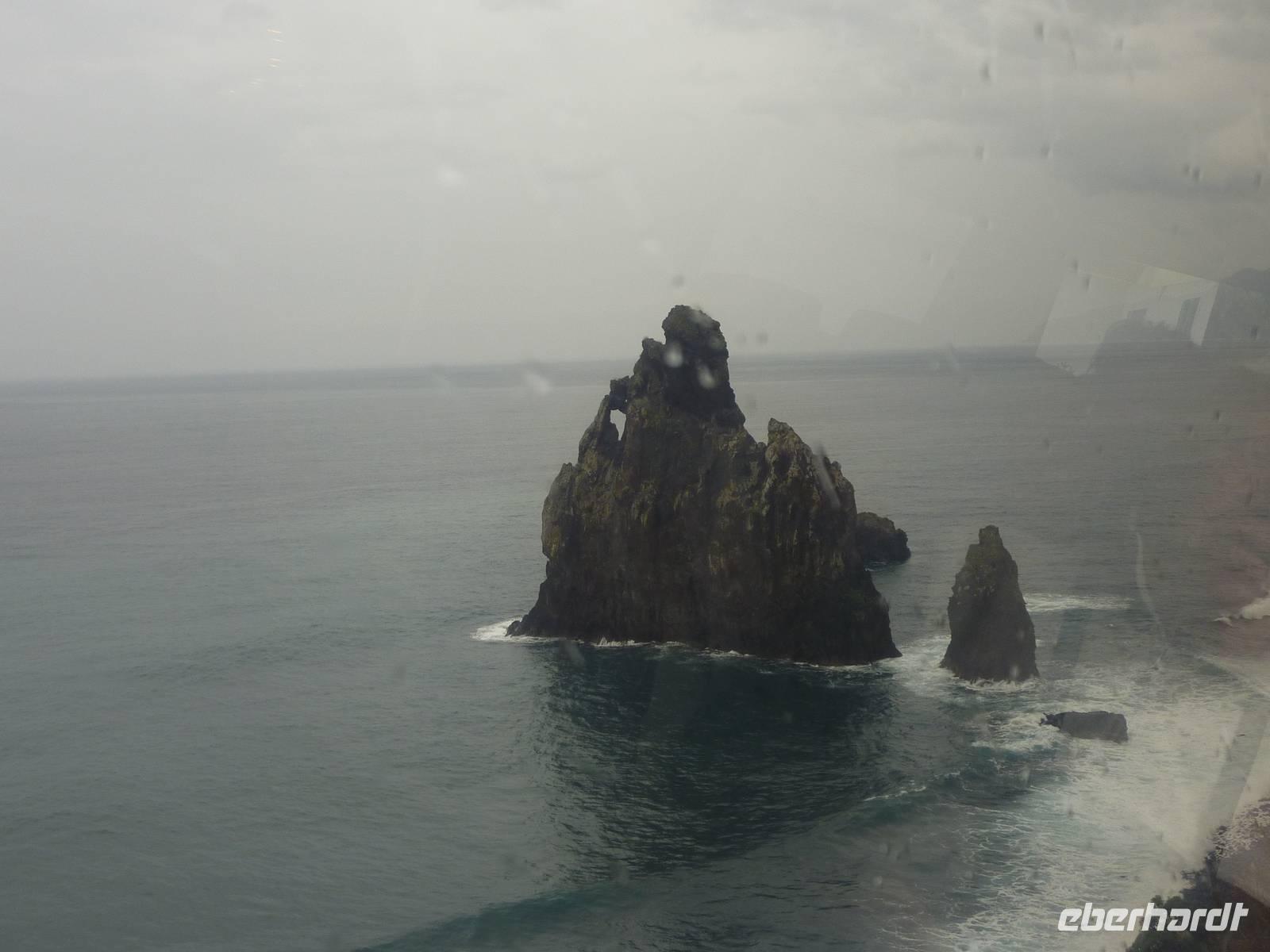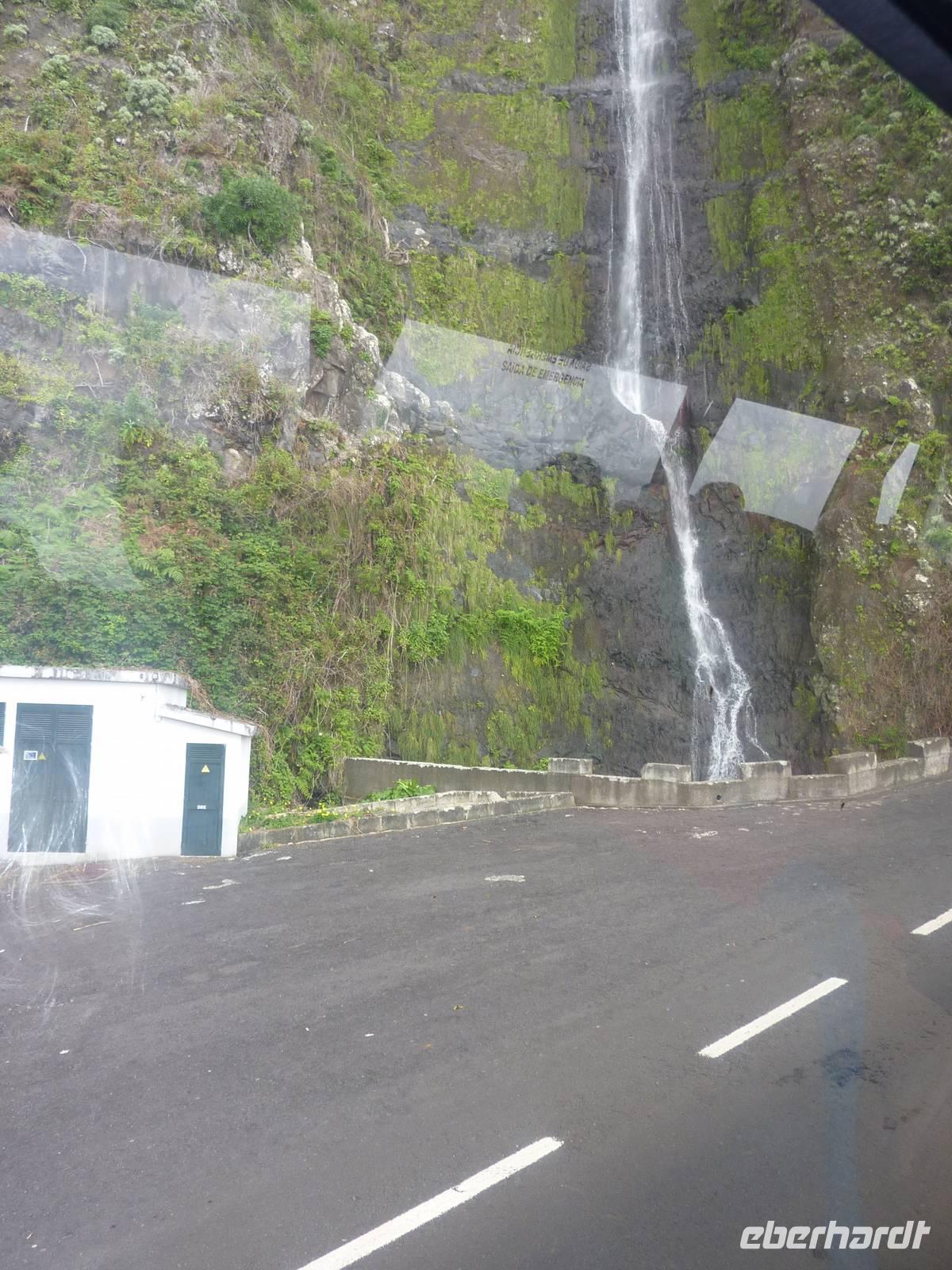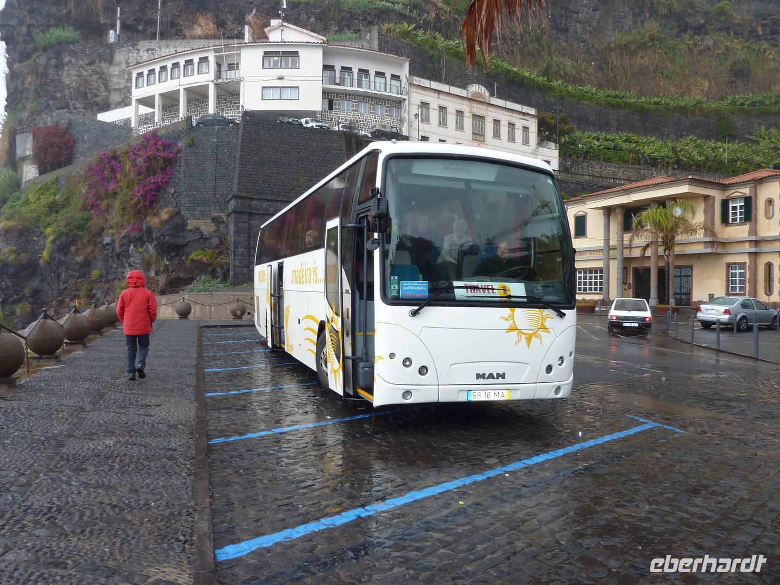 Der letzte Ausflugstag begann bei Sonnenschein. Unsere heutige Tour ging in den Nordwesten der Insel. Als erstes fuhren wir nach Ribeira Brava, dem kleinen Ort mit Strandpromenade und der hübschen Kirche São Bento. Ziel der sich anschließenden Fahrt hoch in die Berge über zahlreiche Serpentinen war der Encumeadapass auf 1004 Meter. Hier oben erhielten wir gerade noch so einen Blick auf die Südküste und konnten auch auf den Norden der Insel schauen, denn just bei unserem Aufenthalt kamen die tiefen Regenwolken an. Sao Vicente, das preisgekrönte Städtchen, konnten wir bei einem kleinen Spaziergang genießen, hier es war warm und regenfrei. Der nächste Fotostopp war in Seixal, dem Aussichtspunkt auf den Wasserfall Brautschleier, der sich bei unserem Aufenthalt recht dünn und brav über einer ehemaligen Straße an eine steile Küste ergießt. Aber wir wollten ja auch noch mehr von der Region kennenlernen und so ging unsere Fahrt weiter nach Porto Moniz ganz im Norden. Hier ließen wir bei leichtem Regen die Brandung und das Meer auf uns wirken. Natürlich bestaunten wir auch die wunderbaren Naturschwimmbecken, aber baden wollte doch keiner... Jetzt wollten wir zur Hochebene Paul de Serra fahren, aber der Regen wurde immer stärker und die Sicht bestand nur aus Wolken. Ricardo, unser „inselbeste Busfahrer", fuhr bewundernswert umsichtig; wie wir erlebten, kann jederzeit ein Rind oder Ziegen auf der Strasse stehen. Und so bogen wir bei starkem Regen ab zur West-Süd-Küstenstrasse. Plötzlich stoppte der Bus und wir sahen einen kräftigen Wasserfall, der direkt vor uns auf die Strasse niederfiel. Nach Staunen und Fotoaufnahmen fuhren wir unter den Wasserfall hindurch! Dieses Erlebnis empfanden wir als Ausgleich zum bislang recht schönen Frühlingssonnenwetter, was wir die ganze Zeit genossen durften. In Ponta de Sol machten wir nun nur einen kleinen Stopp, witterungsbedingt. Da es unser letzter gemeinsamer Halt war, bedankten wir uns hier bei Marbelia für die charmante und kompetente Reiseleitung und bei Ricardo für das Fahren mit hohem Sicherheitsgefühl. Der Abend versprach etwas Besonderes: wir hatten uns in ein Panoramarestaurant in Funchal zum Probieren des Fleischspießes „Espetata" fahren lassen. Aufgrund des Wetters war schon die Anreise etwas abenteuerlich, denn der Regen hatte in der Intensität nicht nachgelassen. Also fuhren wir durch Wasser und auch im Restaurant sahen wir nur Wolken. Erst viel später rissen die Wolken auf und wir konnten den Blick auf Funchals Lichter erhaschen.