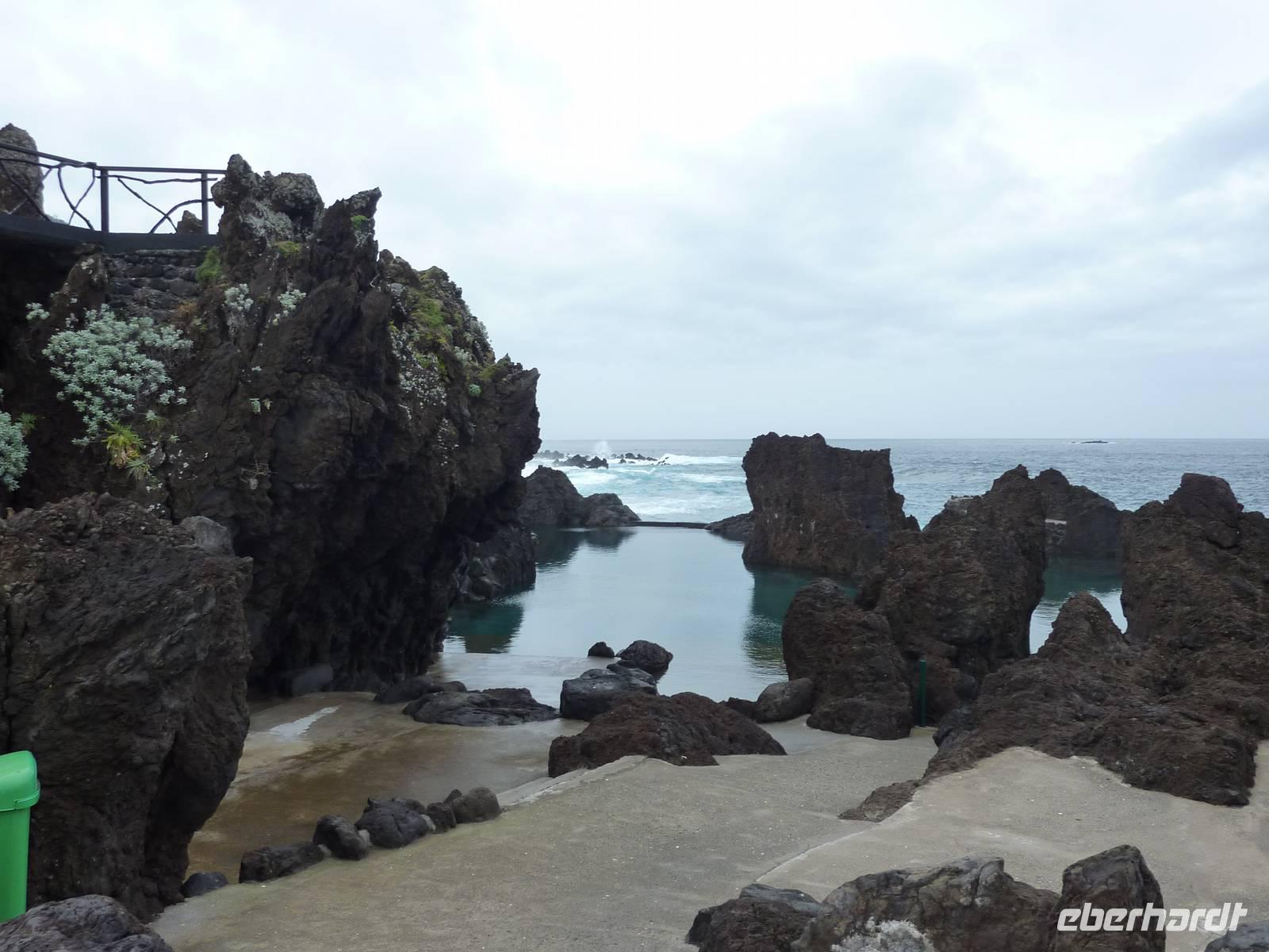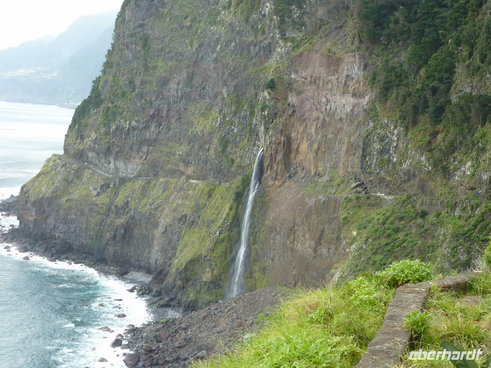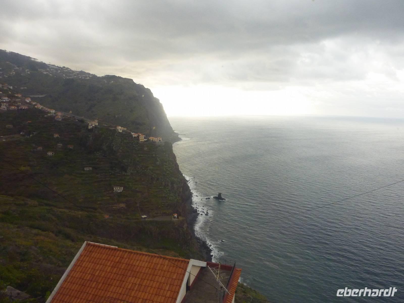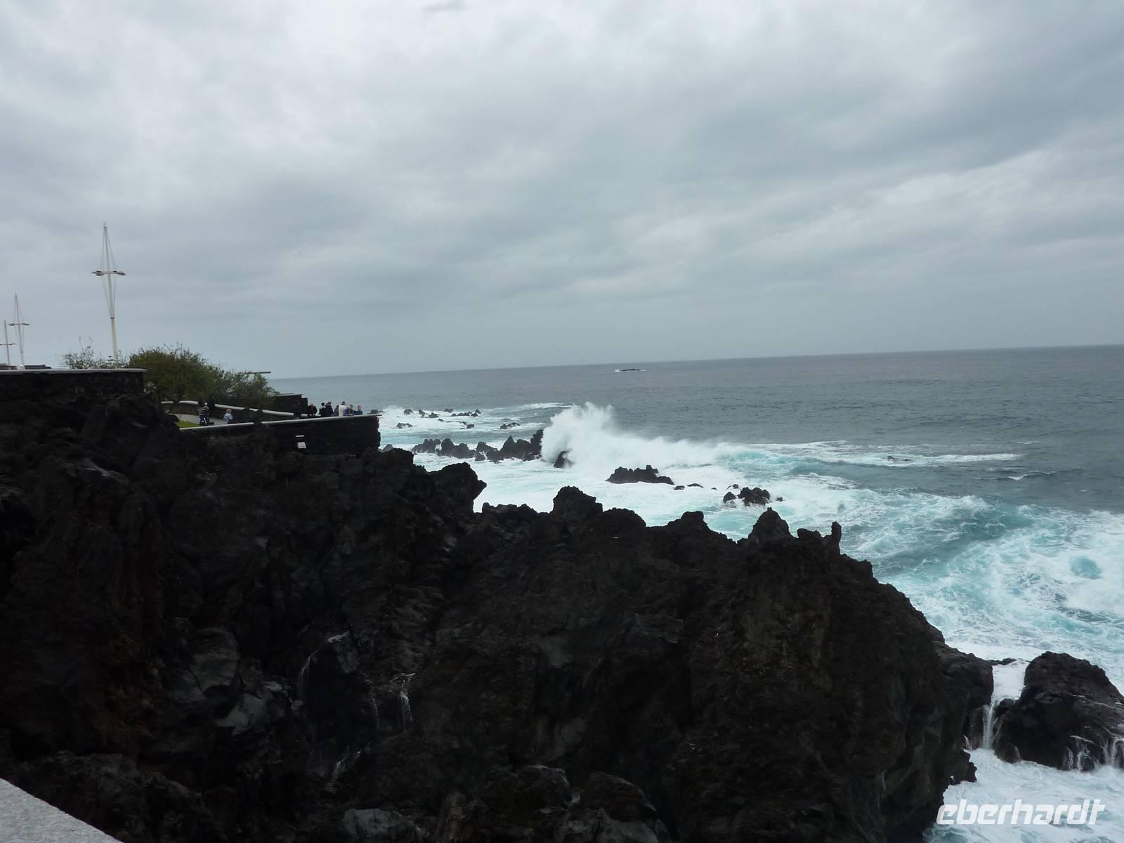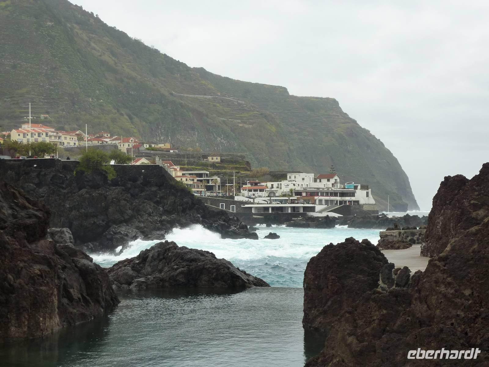 Der letzte Ausflugstag begann bei Sonnenschein. Unsere heutige Tour ging in den Nordwesten der Insel. Als erstes fuhren wir nach Ribeira Brava, dem kleinen Ort mit Strandpromenade und der hübschen Kirche São Bento. Ziel der sich anschließenden Fahrt hoch in die Berge über zahlreiche Serpentinen war der Encumeadapass auf 1004 Meter. Hier oben erhielten wir gerade noch so einen Blick auf die Südküste und konnten auch auf den Norden der Insel schauen, denn just bei unserem Aufenthalt kamen die tiefen Regenwolken an. Sao Vicente, das preisgekrönte Städtchen, konnten wir bei einem kleinen Spaziergang genießen, hier es war warm und regenfrei. Der nächste Fotostopp war in Seixal, dem Aussichtspunkt auf den Wasserfall Brautschleier, der sich bei unserem Aufenthalt recht dünn und brav über einer ehemaligen Straße an eine steile Küste ergießt. Aber wir wollten ja auch noch mehr von der Region kennenlernen und so ging unsere Fahrt weiter nach Porto Moniz ganz im Norden. Hier ließen wir bei leichtem Regen die Brandung und das Meer auf uns wirken. Natürlich bestaunten wir auch die wunderbaren Naturschwimmbecken, aber baden wollte doch keiner... Jetzt wollten wir zur Hochebene Paul de Serra fahren, aber der Regen wurde immer stärker und die Sicht bestand nur aus Wolken. Ricardo, unser „inselbeste Busfahrer", fuhr bewundernswert umsichtig; wie wir erlebten, kann jederzeit ein Rind oder Ziegen auf der Strasse stehen. Und so bogen wir bei starkem Regen ab zur West-Süd-Küstenstrasse. Plötzlich stoppte der Bus und wir sahen einen kräftigen Wasserfall, der direkt vor uns auf die Strasse niederfiel. Nach Staunen und Fotoaufnahmen fuhren wir unter den Wasserfall hindurch! Dieses Erlebnis empfanden wir als Ausgleich zum bislang recht schönen Frühlingssonnenwetter, was wir die ganze Zeit genossen durften. In Ponta de Sol machten wir nun nur einen kleinen Stopp, witterungsbedingt. Da es unser letzter gemeinsamer Halt war, bedankten wir uns hier bei Marbelia für die charmante und kompetente Reiseleitung und bei Ricardo für das Fahren mit hohem Sicherheitsgefühl. Der Abend versprach etwas Besonderes: wir hatten uns in ein Panoramarestaurant in Funchal zum Probieren des Fleischspießes „Espetata" fahren lassen. Aufgrund des Wetters war schon die Anreise etwas abenteuerlich, denn der Regen hatte in der Intensität nicht nachgelassen. Also fuhren wir durch Wasser und auch im Restaurant sahen wir nur Wolken. Erst viel später rissen die Wolken auf und wir konnten den Blick auf Funchals Lichter erhaschen.