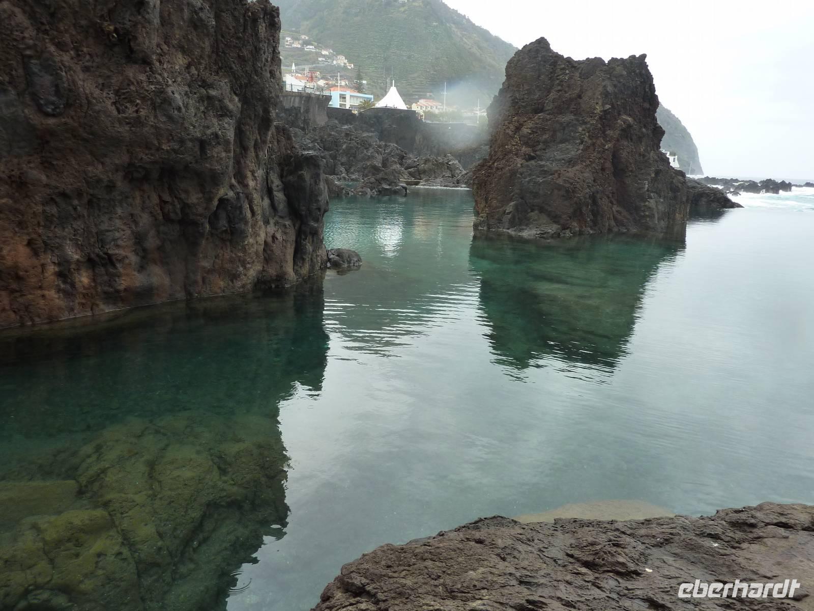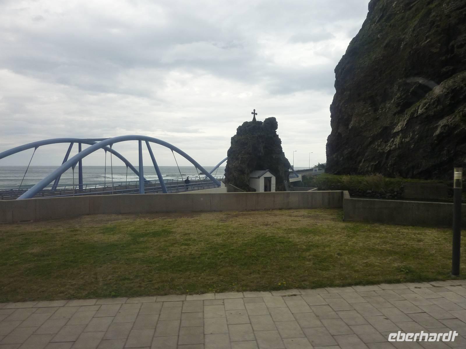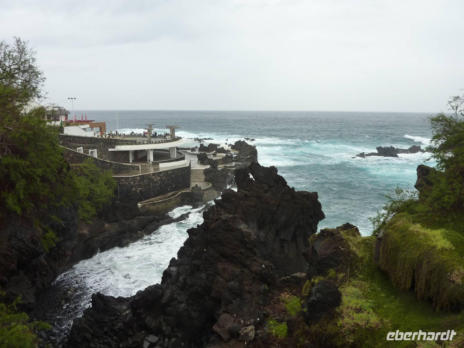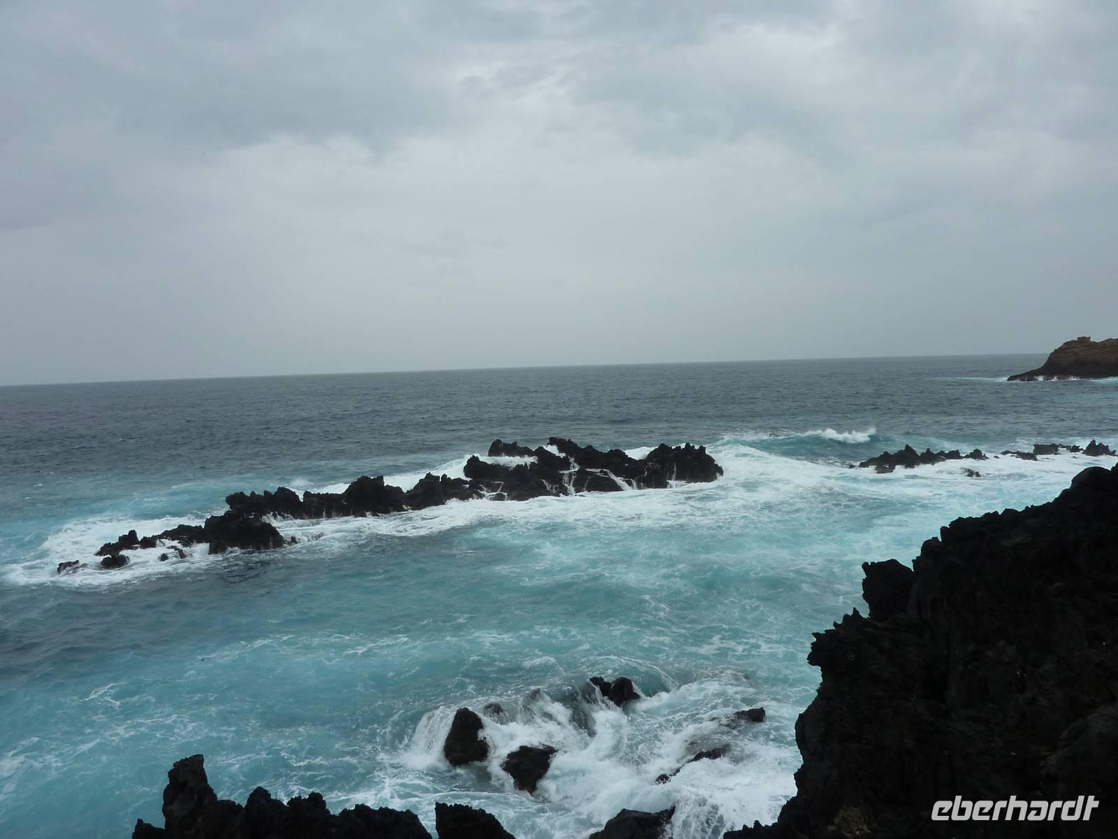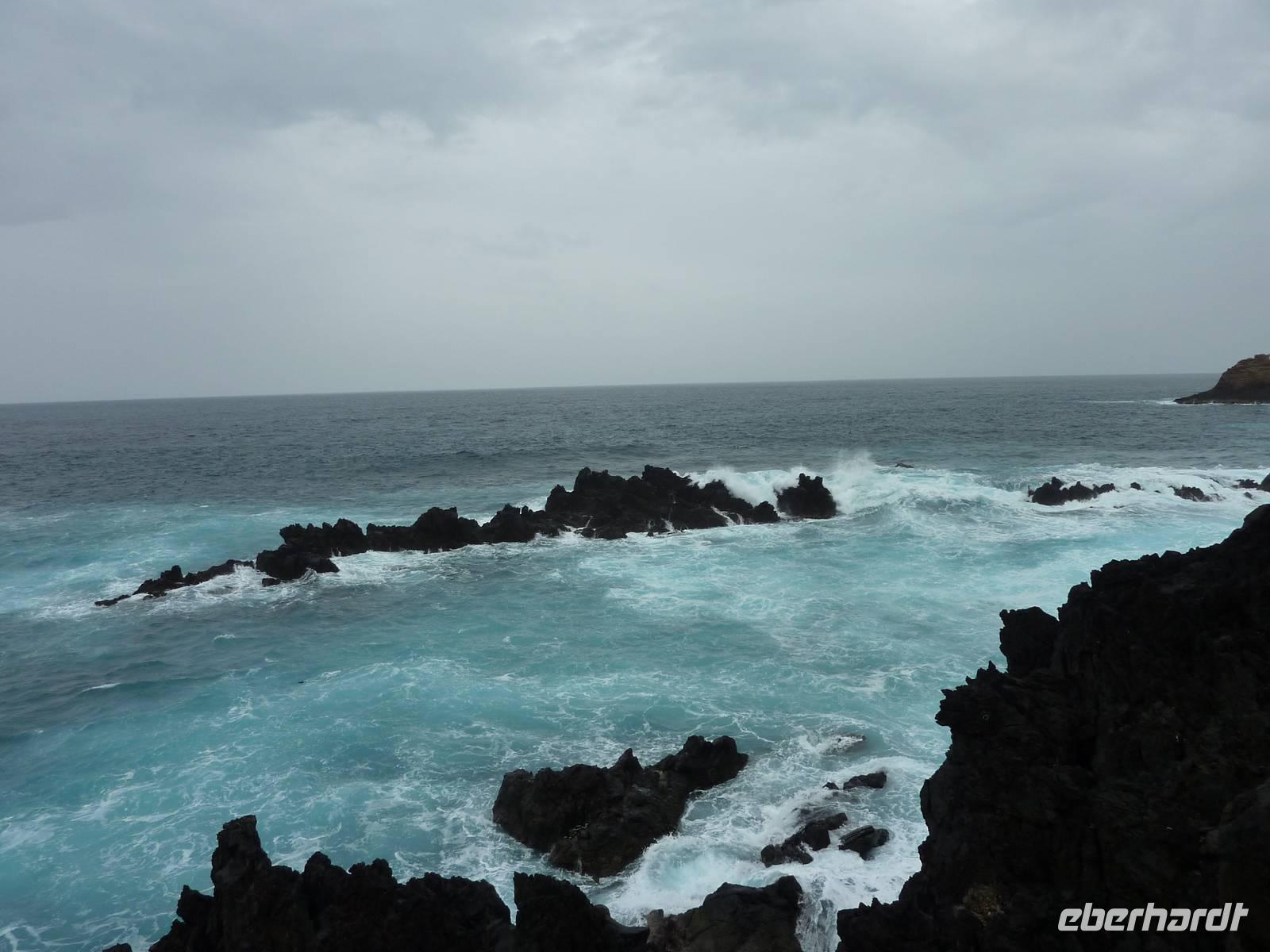 Der letzte Ausflugstag begann bei Sonnenschein. Unsere heutige Tour ging in den Nordwesten der Insel. Als erstes fuhren wir nach Ribeira Brava, dem kleinen Ort mit Strandpromenade und der hübschen Kirche São Bento. Ziel der sich anschließenden Fahrt hoch in die Berge über zahlreiche Serpentinen war der Encumeadapass auf 1004 Meter. Hier oben erhielten wir gerade noch so einen Blick auf die Südküste und konnten auch auf den Norden der Insel schauen, denn just bei unserem Aufenthalt kamen die tiefen Regenwolken an. Sao Vicente, das preisgekrönte Städtchen, konnten wir bei einem kleinen Spaziergang genießen, hier es war warm und regenfrei. Der nächste Fotostopp war in Seixal, dem Aussichtspunkt auf den Wasserfall Brautschleier, der sich bei unserem Aufenthalt recht dünn und brav über einer ehemaligen Straße an eine steile Küste ergießt. Aber wir wollten ja auch noch mehr von der Region kennenlernen und so ging unsere Fahrt weiter nach Porto Moniz ganz im Norden. Hier ließen wir bei leichtem Regen die Brandung und das Meer auf uns wirken. Natürlich bestaunten wir auch die wunderbaren Naturschwimmbecken, aber baden wollte doch keiner... Jetzt wollten wir zur Hochebene Paul de Serra fahren, aber der Regen wurde immer stärker und die Sicht bestand nur aus Wolken. Ricardo, unser „inselbeste Busfahrer", fuhr bewundernswert umsichtig; wie wir erlebten, kann jederzeit ein Rind oder Ziegen auf der Strasse stehen. Und so bogen wir bei starkem Regen ab zur West-Süd-Küstenstrasse. Plötzlich stoppte der Bus und wir sahen einen kräftigen Wasserfall, der direkt vor uns auf die Strasse niederfiel. Nach Staunen und Fotoaufnahmen fuhren wir unter den Wasserfall hindurch! Dieses Erlebnis empfanden wir als Ausgleich zum bislang recht schönen Frühlingssonnenwetter, was wir die ganze Zeit genossen durften. In Ponta de Sol machten wir nun nur einen kleinen Stopp, witterungsbedingt. Da es unser letzter gemeinsamer Halt war, bedankten wir uns hier bei Marbelia für die charmante und kompetente Reiseleitung und bei Ricardo für das Fahren mit hohem Sicherheitsgefühl. Der Abend versprach etwas Besonderes: wir hatten uns in ein Panoramarestaurant in Funchal zum Probieren des Fleischspießes „Espetata" fahren lassen. Aufgrund des Wetters war schon die Anreise etwas abenteuerlich, denn der Regen hatte in der Intensität nicht nachgelassen. Also fuhren wir durch Wasser und auch im Restaurant sahen wir nur Wolken. Erst viel später rissen die Wolken auf und wir konnten den Blick auf Funchals Lichter erhaschen.
