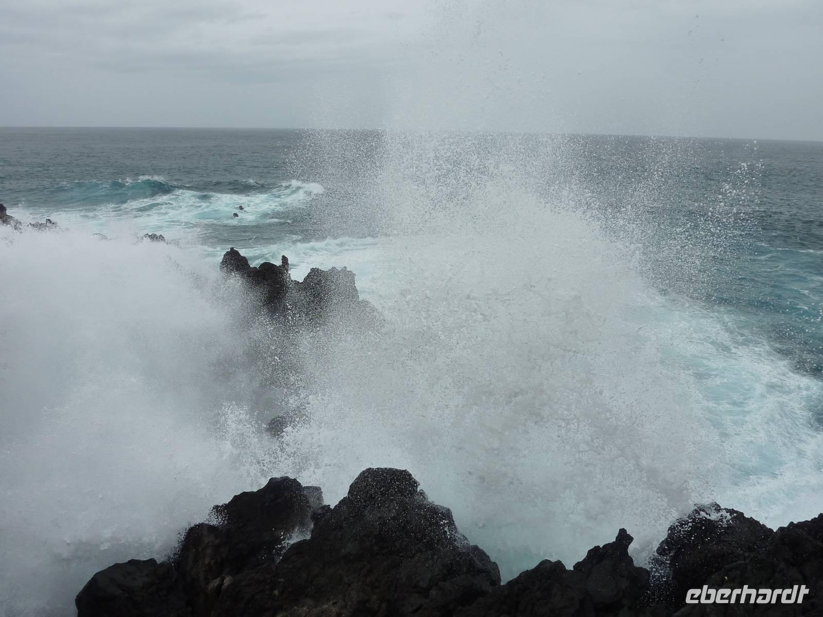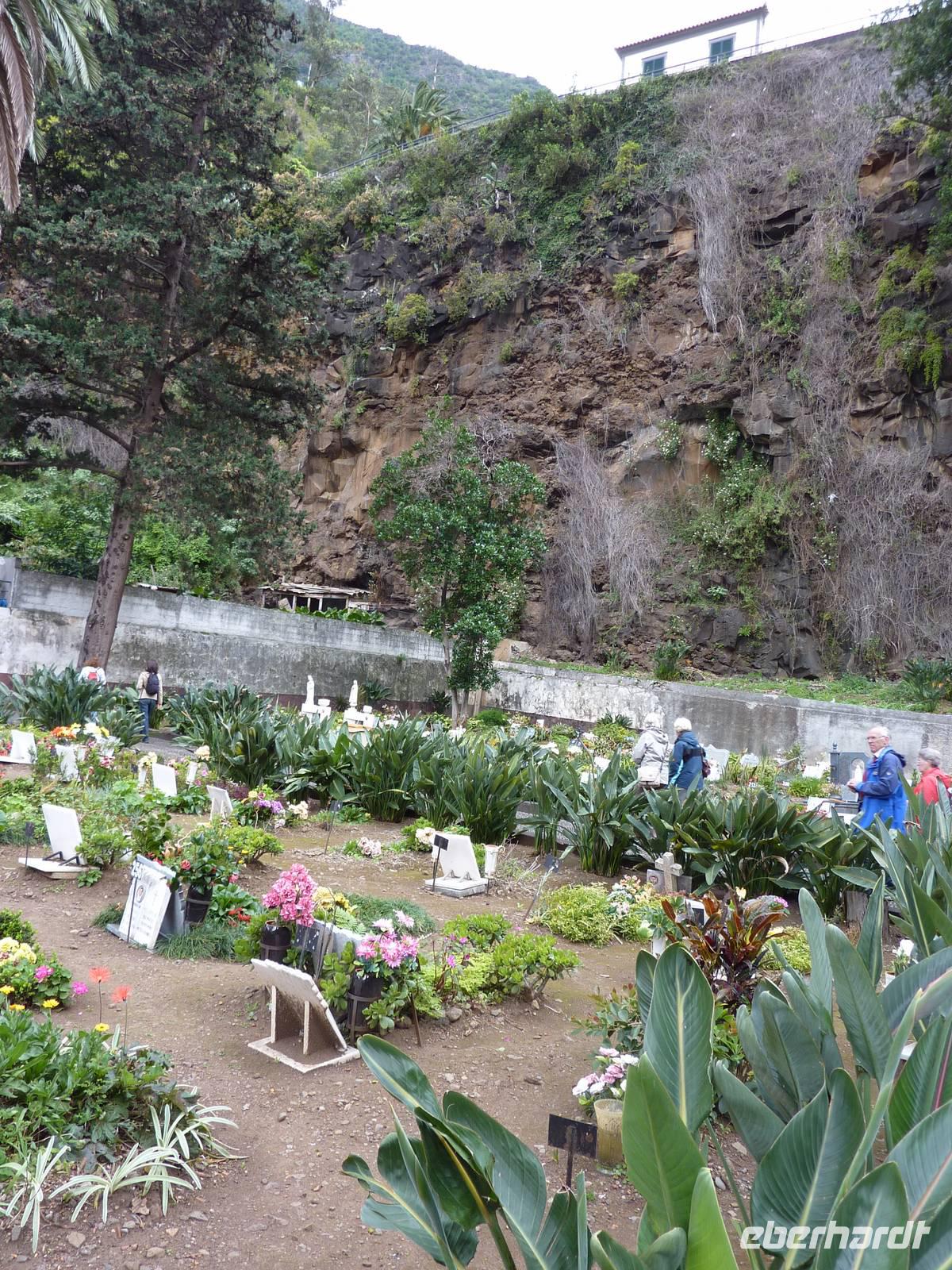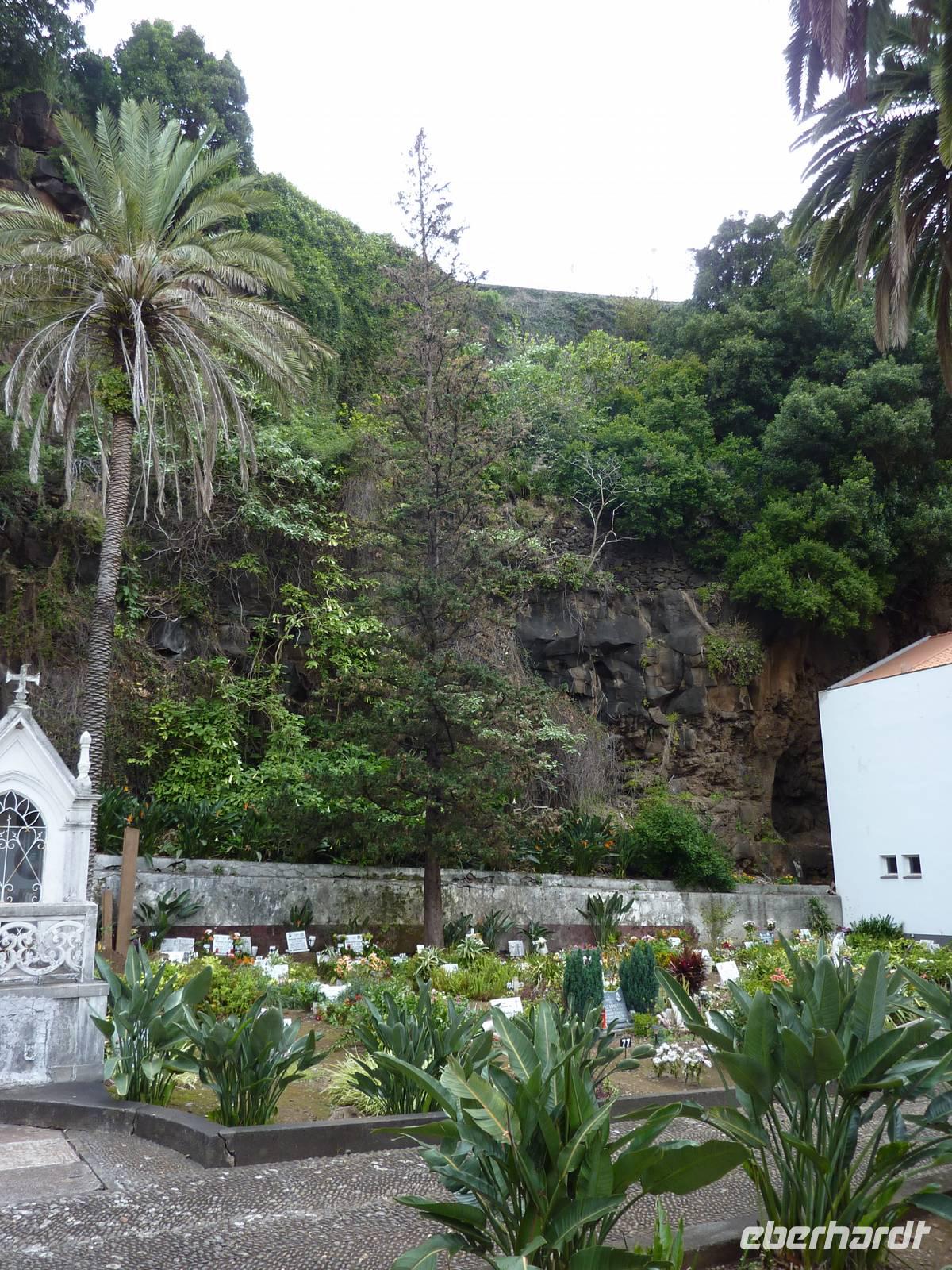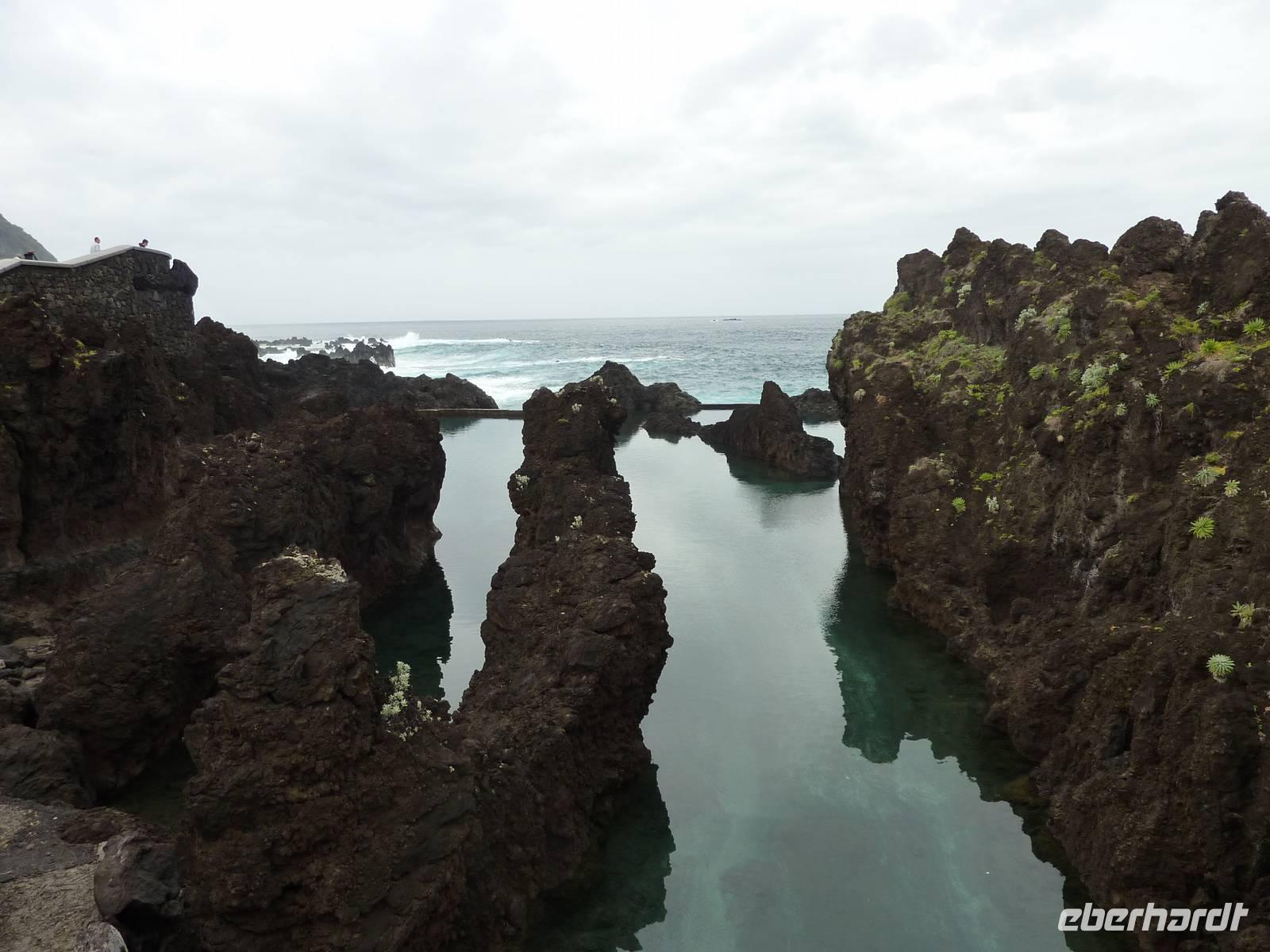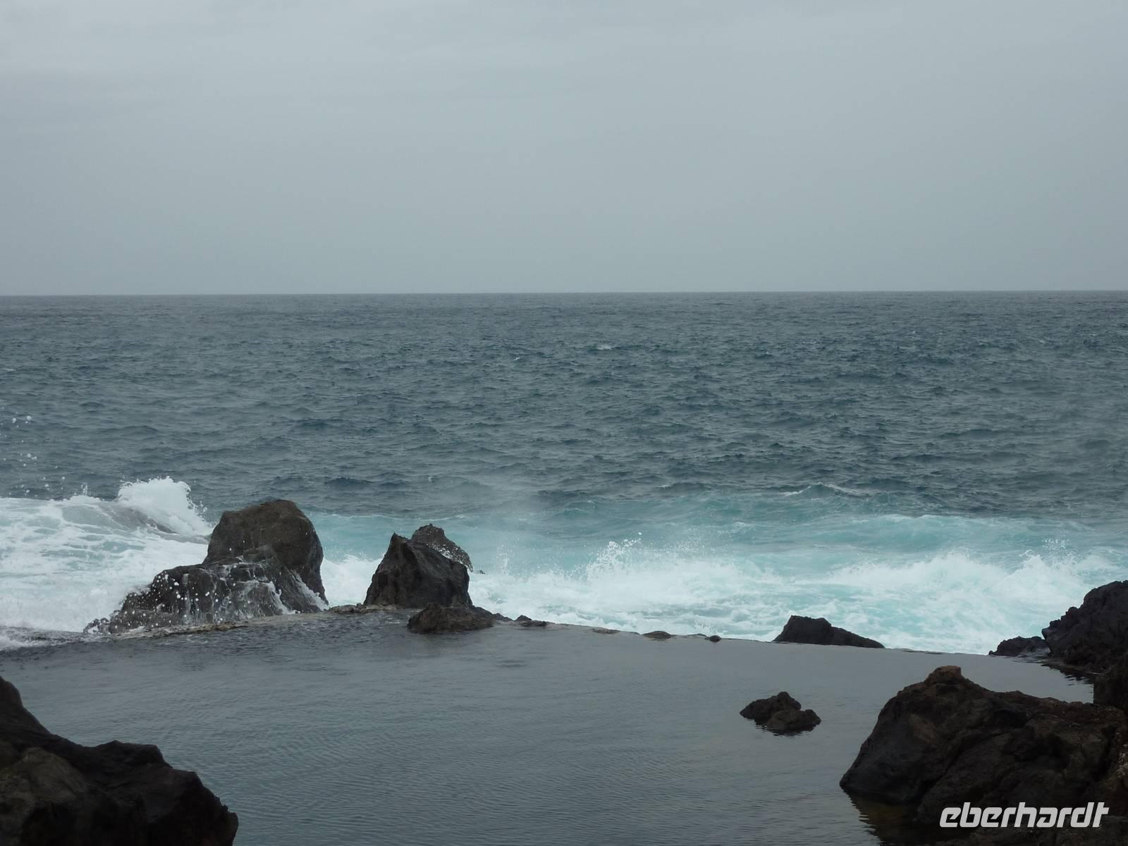 Der letzte Ausflugstag begann bei Sonnenschein. Unsere heutige Tour ging in den Nordwesten der Insel. Als erstes fuhren wir nach Ribeira Brava, dem kleinen Ort mit Strandpromenade und der hübschen Kirche São Bento. Ziel der sich anschließenden Fahrt hoch in die Berge über zahlreiche Serpentinen war der Encumeadapass auf 1004 Meter. Hier oben erhielten wir gerade noch so einen Blick auf die Südküste und konnten auch auf den Norden der Insel schauen, denn just bei unserem Aufenthalt kamen die tiefen Regenwolken an. Sao Vicente, das preisgekrönte Städtchen, konnten wir bei einem kleinen Spaziergang genießen, hier es war warm und regenfrei. Der nächste Fotostopp war in Seixal, dem Aussichtspunkt auf den Wasserfall Brautschleier, der sich bei unserem Aufenthalt recht dünn und brav über einer ehemaligen Straße an eine steile Küste ergießt. Aber wir wollten ja auch noch mehr von der Region kennenlernen und so ging unsere Fahrt weiter nach Porto Moniz ganz im Norden. Hier ließen wir bei leichtem Regen die Brandung und das Meer auf uns wirken. Natürlich bestaunten wir auch die wunderbaren Naturschwimmbecken, aber baden wollte doch keiner... Jetzt wollten wir zur Hochebene Paul de Serra fahren, aber der Regen wurde immer stärker und die Sicht bestand nur aus Wolken. Ricardo, unser „inselbeste Busfahrer", fuhr bewundernswert umsichtig; wie wir erlebten, kann jederzeit ein Rind oder Ziegen auf der Strasse stehen. Und so bogen wir bei starkem Regen ab zur West-Süd-Küstenstrasse. Plötzlich stoppte der Bus und wir sahen einen kräftigen Wasserfall, der direkt vor uns auf die Strasse niederfiel. Nach Staunen und Fotoaufnahmen fuhren wir unter den Wasserfall hindurch! Dieses Erlebnis empfanden wir als Ausgleich zum bislang recht schönen Frühlingssonnenwetter, was wir die ganze Zeit genossen durften. In Ponta de Sol machten wir nun nur einen kleinen Stopp, witterungsbedingt. Da es unser letzter gemeinsamer Halt war, bedankten wir uns hier bei Marbelia für die charmante und kompetente Reiseleitung und bei Ricardo für das Fahren mit hohem Sicherheitsgefühl. Der Abend versprach etwas Besonderes: wir hatten uns in ein Panoramarestaurant in Funchal zum Probieren des Fleischspießes „Espetata" fahren lassen. Aufgrund des Wetters war schon die Anreise etwas abenteuerlich, denn der Regen hatte in der Intensität nicht nachgelassen. Also fuhren wir durch Wasser und auch im Restaurant sahen wir nur Wolken. Erst viel später rissen die Wolken auf und wir konnten den Blick auf Funchals Lichter erhaschen.