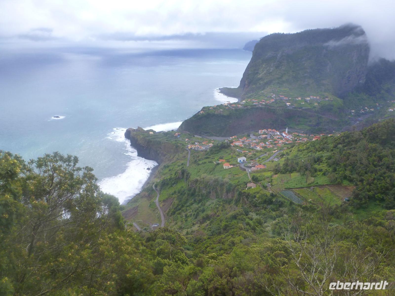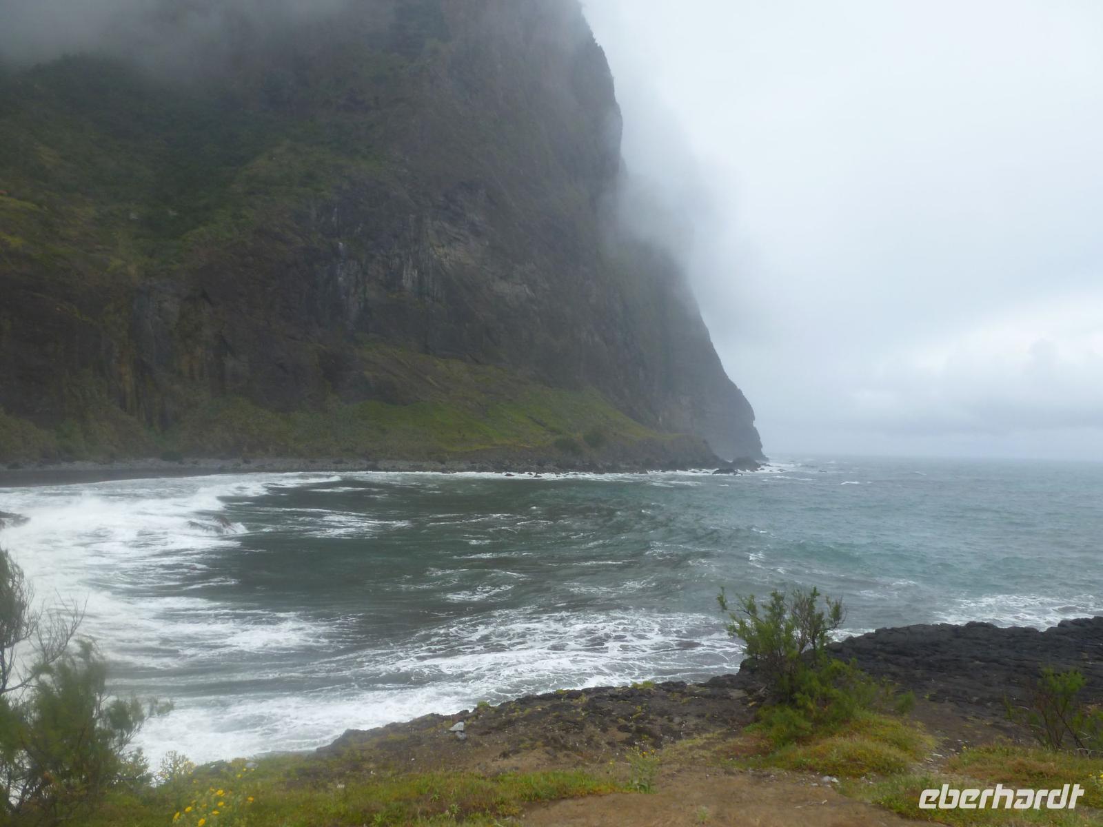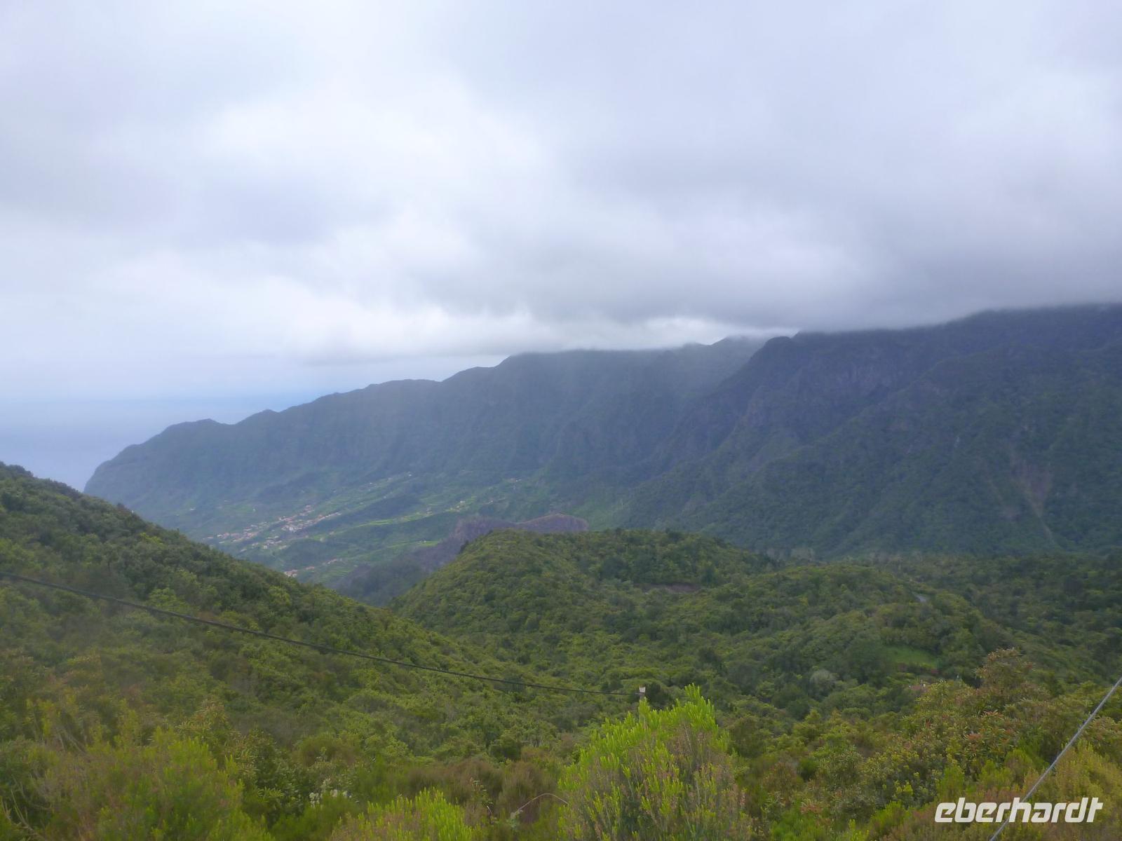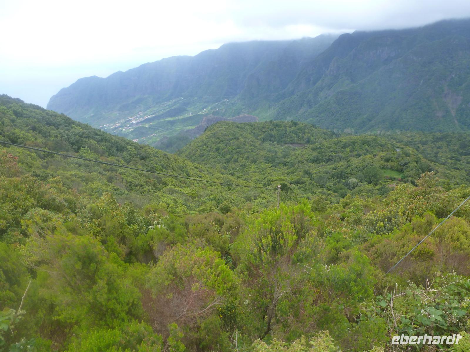 Weiter ging es zu Hoch Ebene „Paul da Serra" auf 1.400 Meter. Überraschend gäbe es keine Serpentinen, sondern es ging gerade bergauf so dass wir in kurze Zeit die Höhe erreichen. Leider konnte sich hier die Sonne gegenüber dem Nebel nicht durchsetzen. Deshalb verlegten wir den Foto-Stopp 400 Meter niedriger und hatten so ein ersten herrlichen Blick auf „Porto de Moniz".