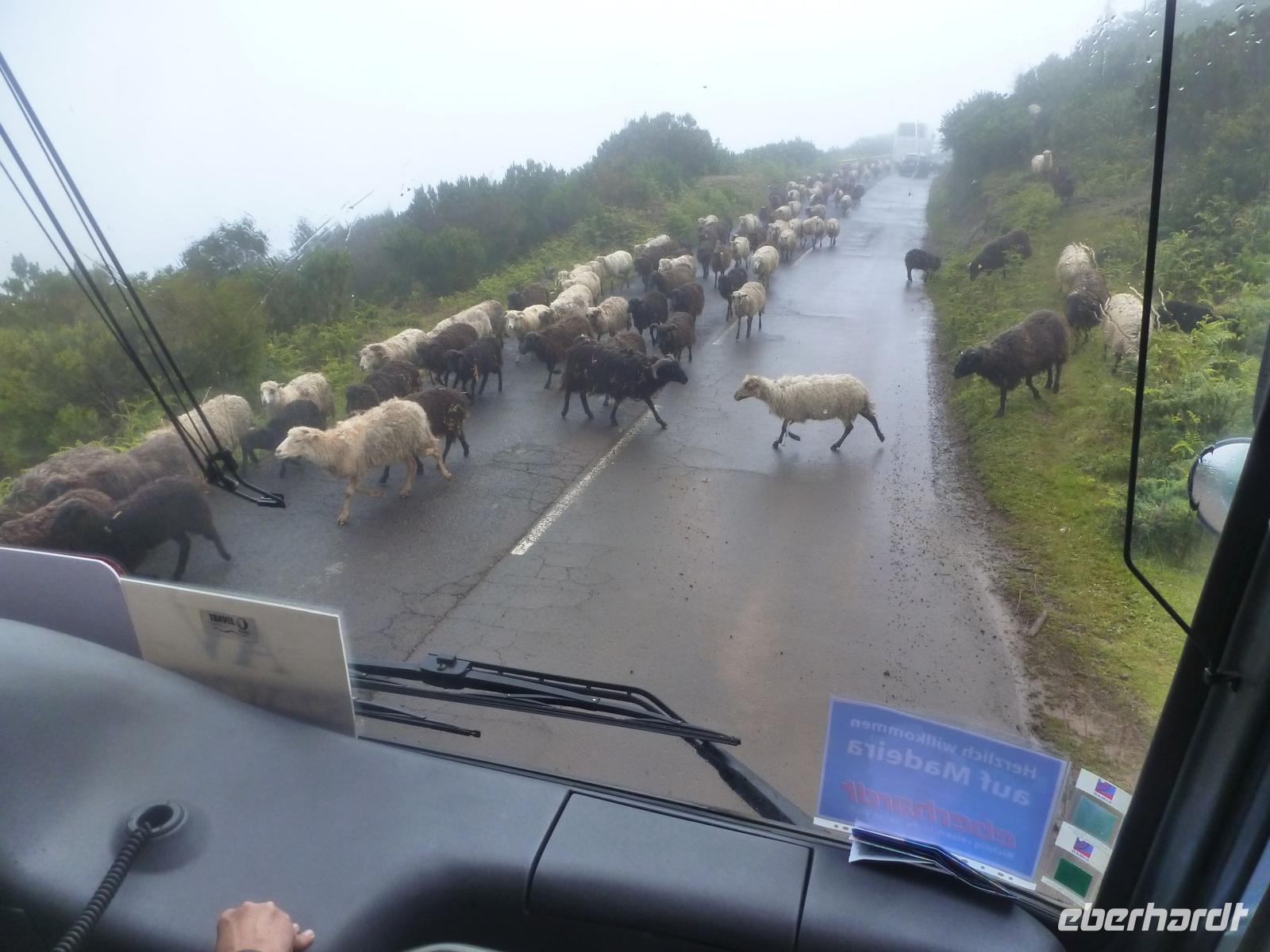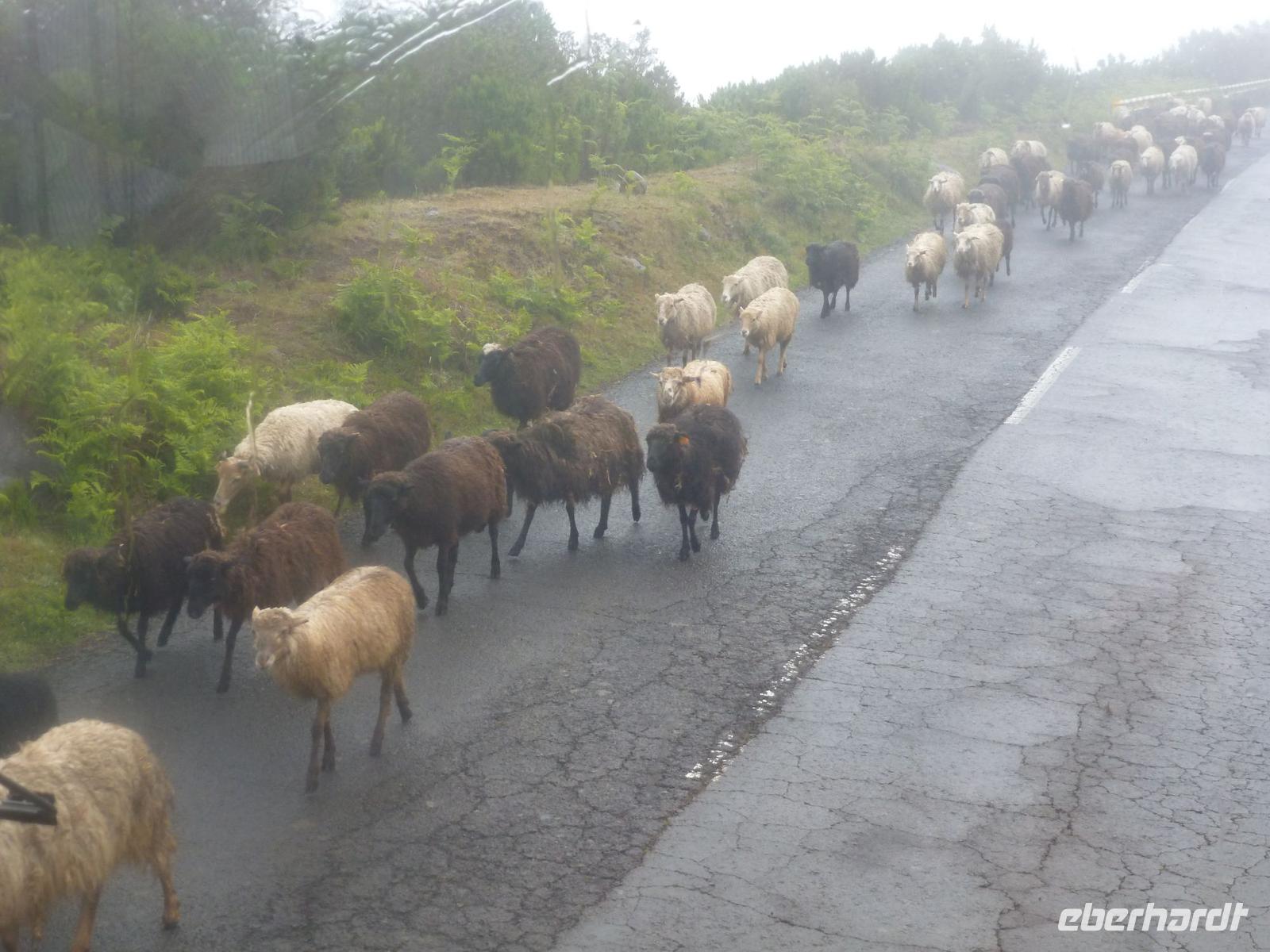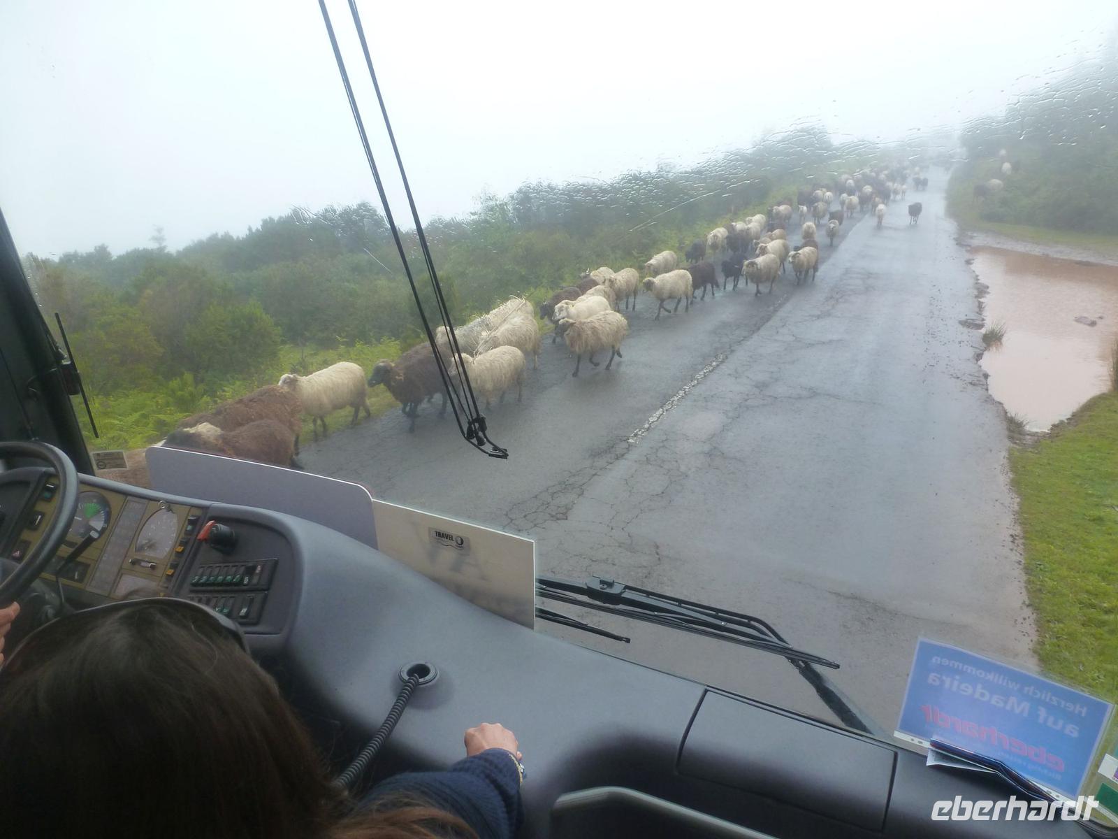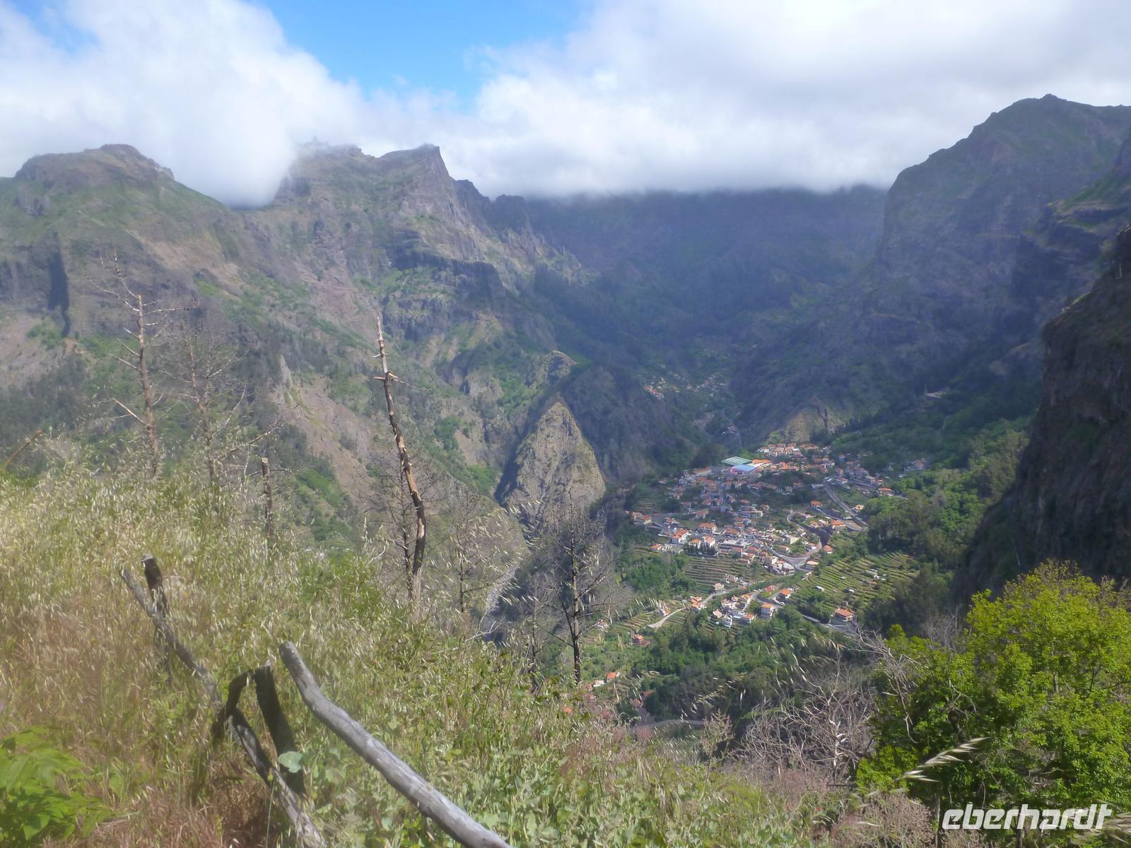 Weiter ging es zu Hoch Ebene „Paul da Serra" auf 1.400 Meter. Überraschend gäbe es keine Serpentinen, sondern es ging gerade bergauf so dass wir in kurze Zeit die Höhe erreichen. Leider konnte sich hier die Sonne gegenüber dem Nebel nicht durchsetzen. Deshalb verlegten wir den Foto-Stopp 400 Meter niedriger und hatten so ein ersten herrlichen Blick auf „Porto de Moniz".
