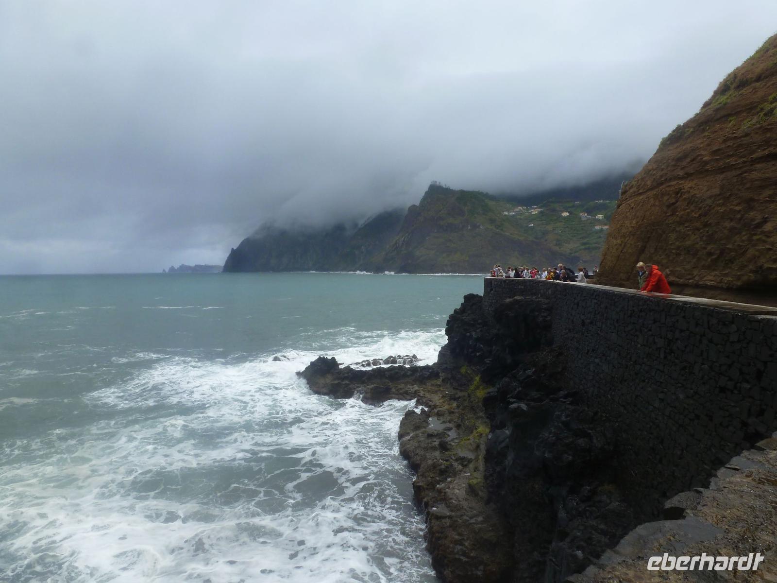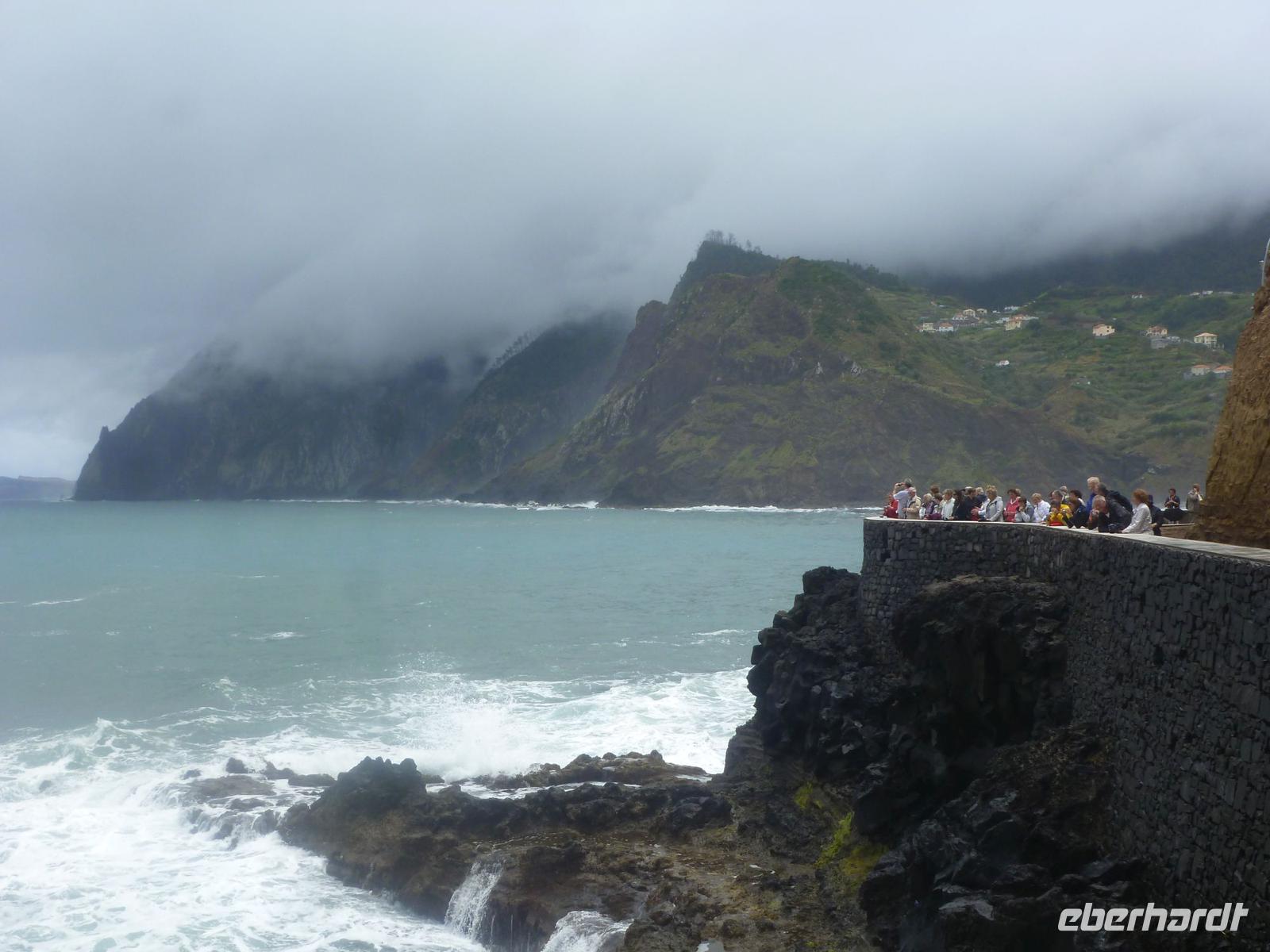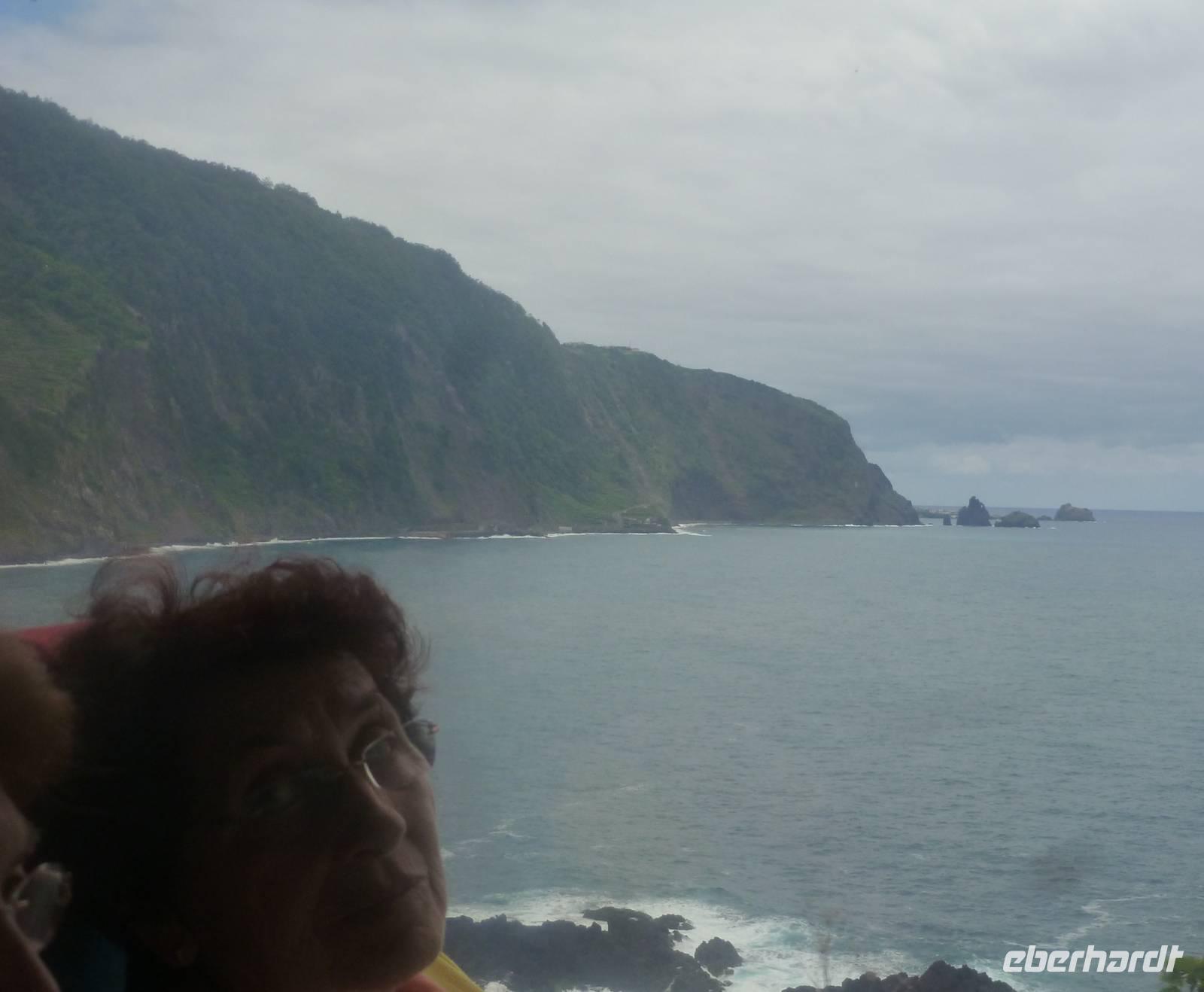 Gestärkt ging es dann weiter nach „Puerto da Cruz" wo wir einen Spaziergang am Meer entlang machte. Beeindruckt sahen wir hier als erste Gruppe „Geysire aus dem Meer" auf Madeira. Wer zu neugierig war, wurde von dem Wasser überrascht. Letzter Höhepunkt war östlichste Spitze Madeira, welche unser Busfahrer, Ricardo, extra für uns anfuhr. Es war windig und wir konnten vor Ort noch einmal die schroffe Küste betrachten.
