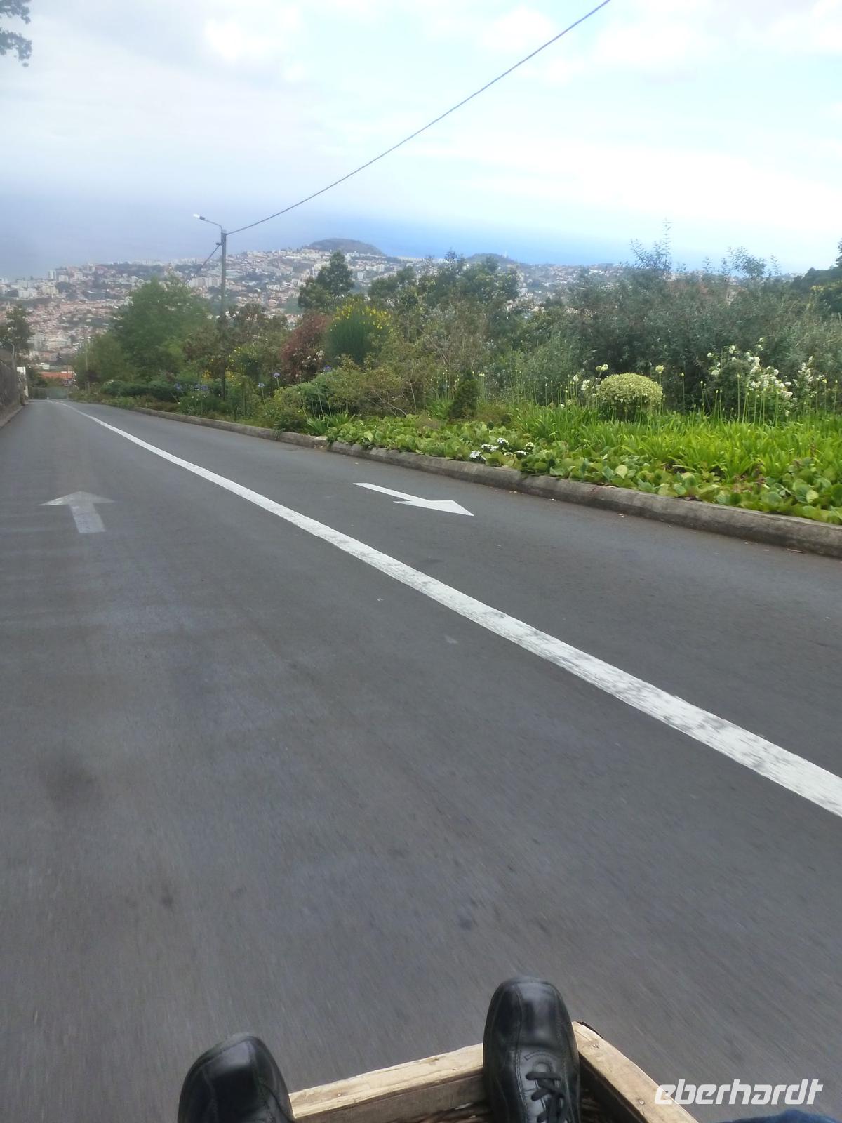 Auf ging es zum nächsten Highlight- die Fahrt mit den Korbschlitten. 6 Kilometer ging es von Monte hinab nach Funchal. Ohne Bremsen und nur mit den kräftigen „Korbschlittenlenkern". 26 mutige Gäste wagten diese rasante Fahrt ins Tal.