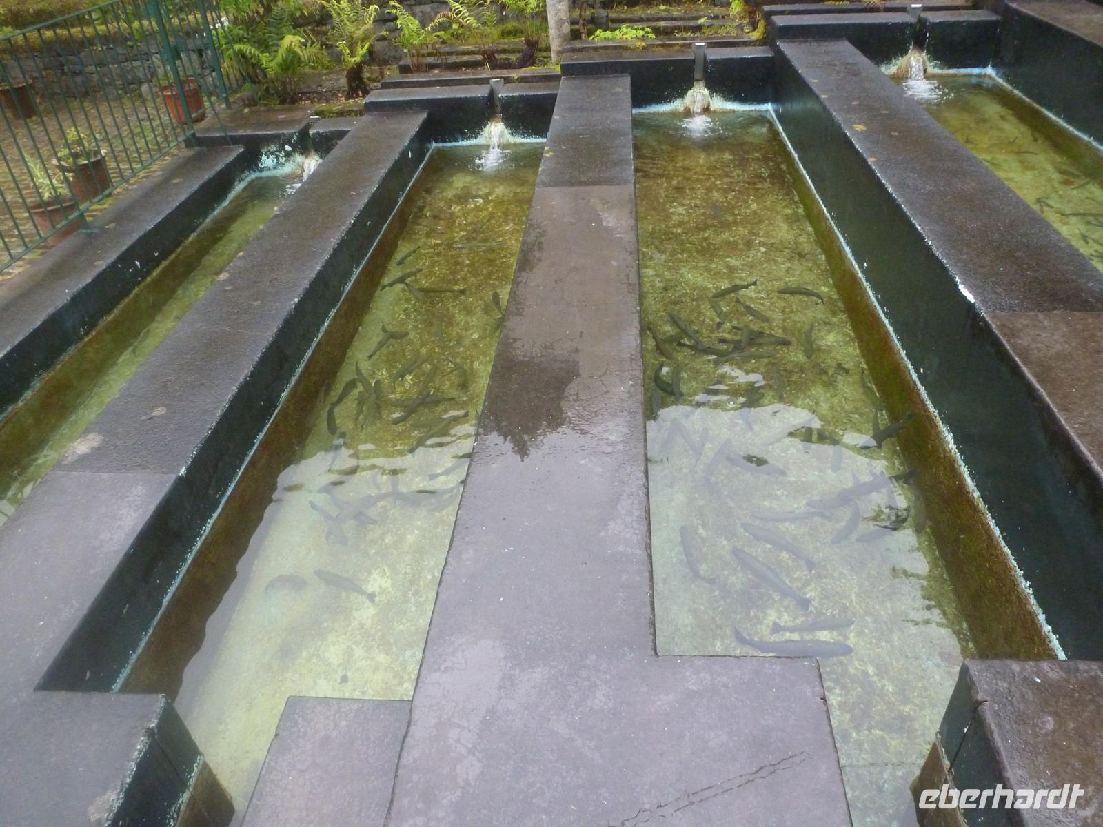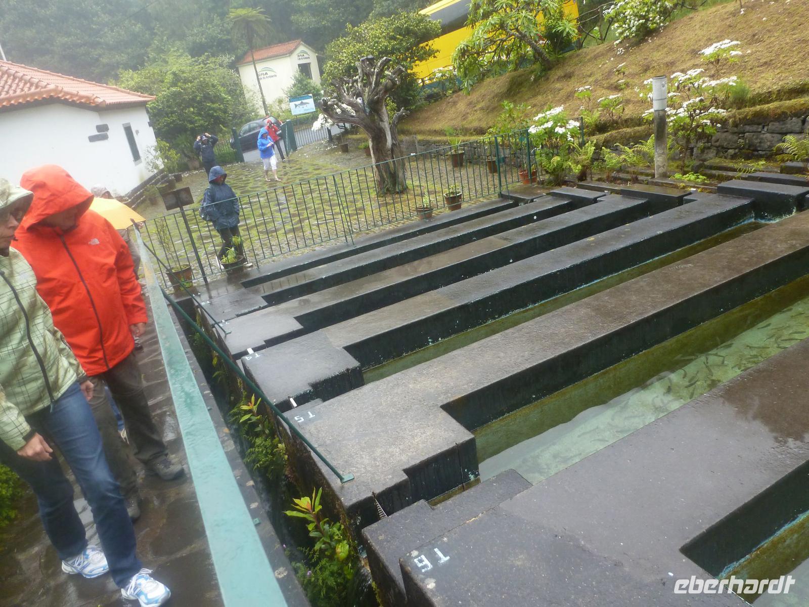 Heute war bereits 8.30 Uhr Start, denn ein Ganztageausflug in den Osten Madeiras stand auf dem Programm. Zunächst ging es nach Camacha zur Besichtigung einer Korbflechterwerkstatt. Wir bewunderten die flinken Hände der Arbeiter und bestaunten was man alles aus Korb flechten kann. Weiter ging es 1.818 Meter hinauf zum „Pico Arieiro" wo wir leider durch Nebel und Nieselregel kein Fotostopp machen konnten. Deshalb versuchten wir es etwas tiefer in „Ribeiro Frio", eine Station für Forellenzucht. Hier wollten wir auch eine kleine Levada Wanderung machen, doch der Wettergott spielte nicht mit. Unsere Reiseleiterin Helena schlug vor die Wanderung später am Meer in „Puerto da Cruz" durchzuführen.