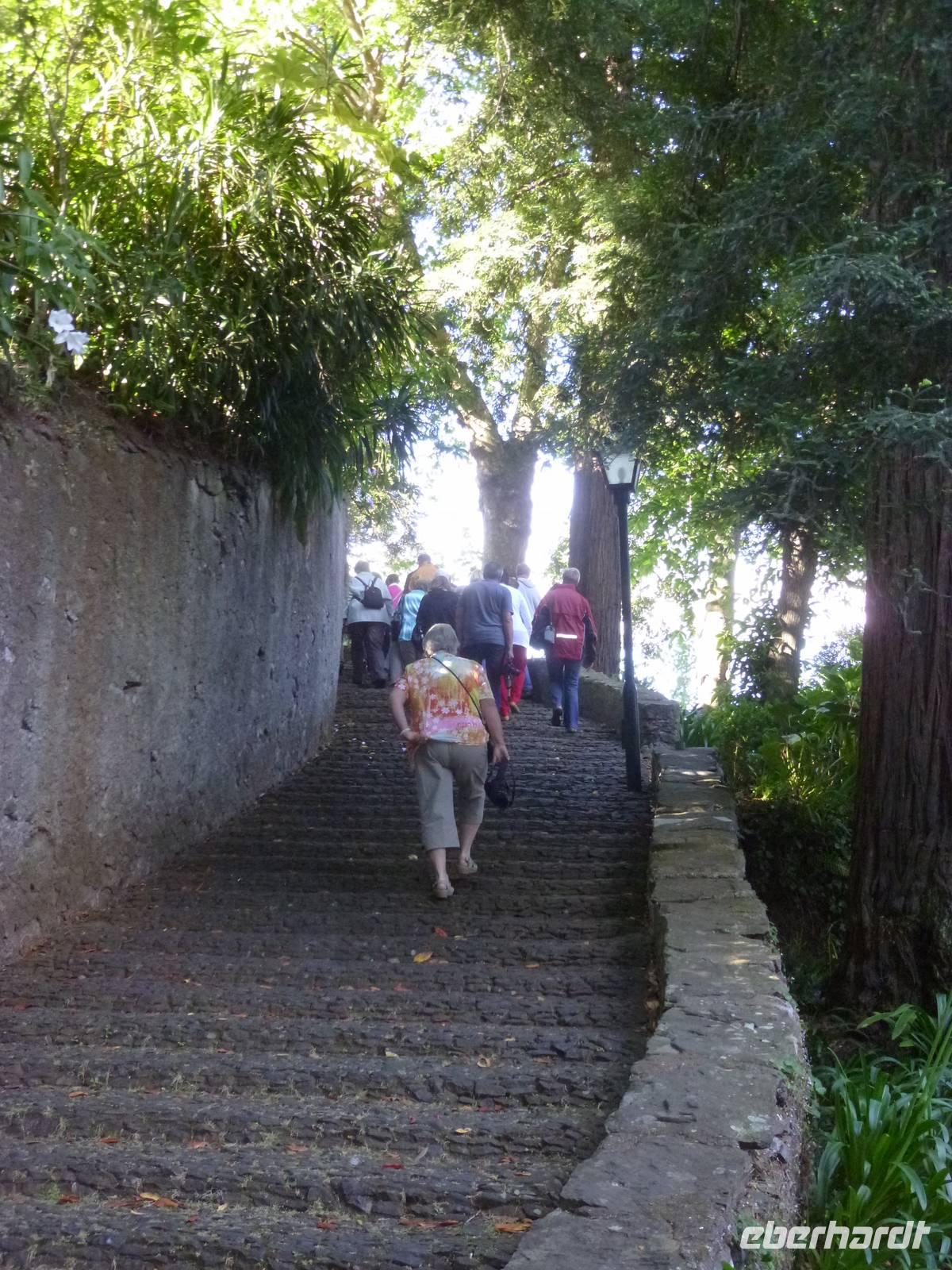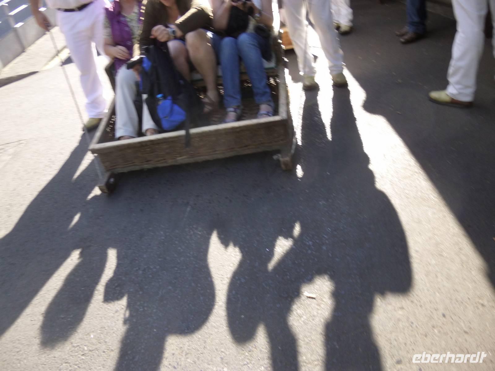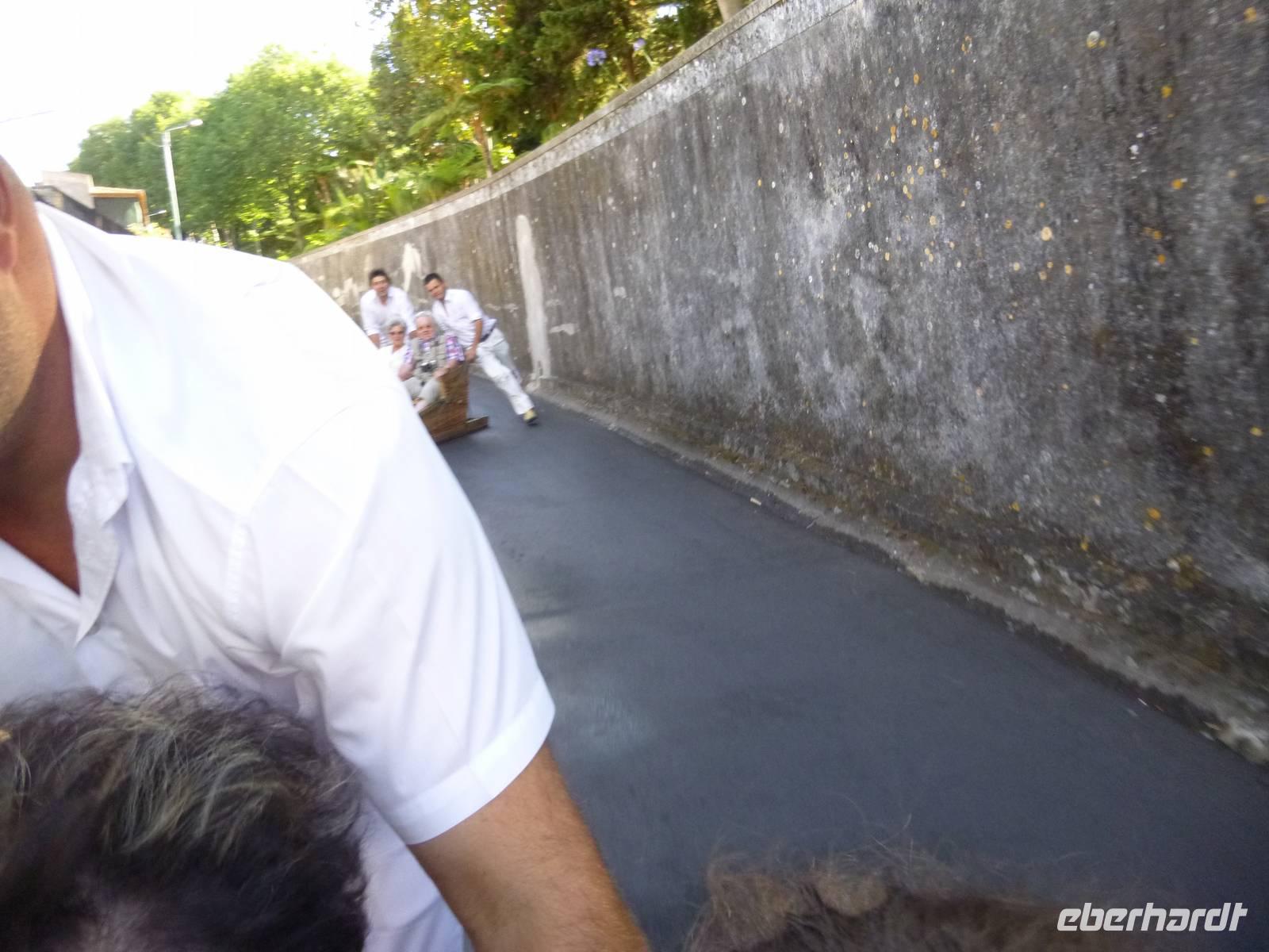 Die Klimaanlage unseres Busses ist wieder gebaut und so machen wir uns gut gekühlt auf unsere heutige Etappe. Gleich früh erklimmen wir die Treppen zum Monte und besichtigen die hübsche Wallfahrtskirche. Einige Gäste lassen es sich nicht nehmen und steigen die enge Treppe bis hinauf zum Aussichtsbalkon - lohnenswert! Anschließend lässt sich die Hälfte der Gruppe mit den legendären Korbschlitten zu Tale "Chauffieren", ohne Bremsen, nur durch die Korbschlittenmänner gelenkt. Der Rest er Gäste kehrt zurück zum Bus. Wir haben eine Menge Spaß, leider ist die Fahrt nach ca. 7 Minuten schon wieder vorbei.