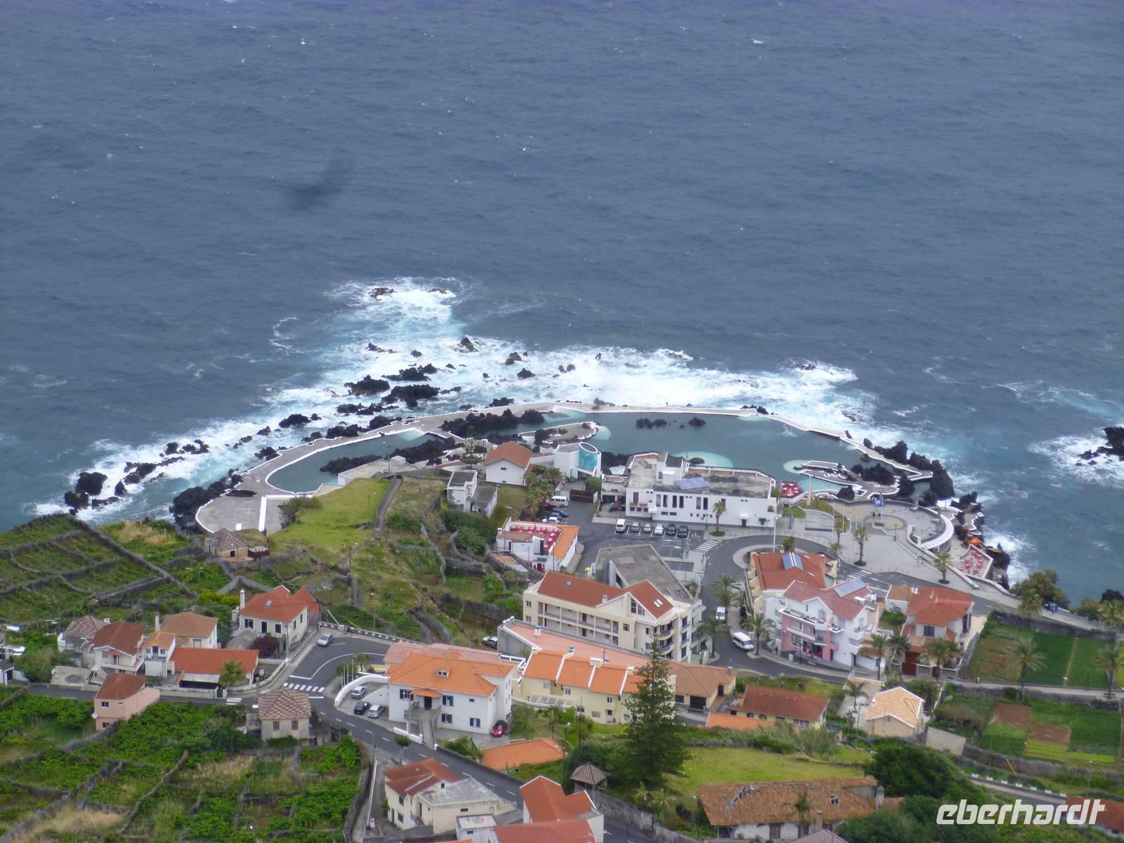 Heute steht unsere längste Etappe auf dem Programm und so starten wir bereits 8.30 Uhr auf unsere große Tour in den Westen Madeiras. Bei unserem ersten Stop in Ribeiro Frio haben wir Zeit, die Kirche zu besichtigen und einen kleinen Bummel durch die Gassen zu unternehmen. Danach fahren wir über die Hochebene Paul da Serra nach Puerto Moniz. Leider ist es grau und ungemütlich, heute meint es das Wetter nicht so gut mit uns, dabei wollten die meisten Gäste doch in den schönen Felsenpools ein Bad nehmen. Erst nach unserer Mittagspause, als wir wieder in den Bus einsteigen, reist der Himmel auf - nun könnten wir Baden gehen, doch jetzt ist leider keine Zeit mehr. Das müssen wir uns also auch für das nächste Mal aufheben. Wir fahren zurück entlang der Nordwesküste und machen noch einen kurzen Stop in Sao Vicente, einem kleinem beschaulichen Ort, der zum Verweilen einläd. Ein Tagespunkt haben wir aber noch: Der Encumeada Pass: Bei schönem Wetter sieht man hier gleichzeitig die Nord-und die Südküste. Wir aber sehen kaum die Hand vor Augen und naß ist es auch. So flüchten alle in die Bar - ein Poncha oder die alkoholfreie Alternative Nikita schmeckt auch bei Regen.