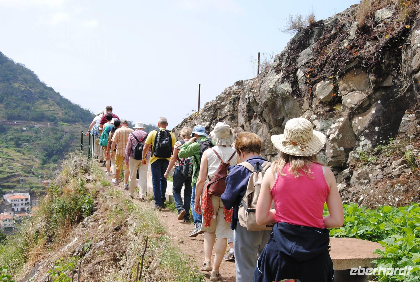 Man merkt, dass Madeira westlicher liegt und so ging die Sonne erst gegen 7 Uhr auf. Der Himmel war mit Wolken verhangen - keine gute Voraussetzung für den Besuch des dritt größten Berg Madeiras den Pico Arieiro. Aber als Optimisten gingen wir zunächst gemütlich zum Frühstück. Das reichhaltige Buffet ließ keine Wünsche offen. Und so gestärkt traf sich die Gruppe um 9 Uhr an der Rezeption. Da war die Sonne schon zu sehen und unsere erste Station war Camacha das Zentrum der Korbflechter. Bei einem Rundgang erzählte Helena alles über das Handwerk und die Herstellung der Produkte aus Weidenholz. Danach konnte man sich die Werkstatt und das Ladengeschäft individuell ansehen. Einige der Gäste hatten schon die ersten Tüten mit Souvenirs in der Hand und nach kurzem Zählappell ging die Fahrt durch eine herrliche Landschaft zum dritthöchsten Berg von Madeira dem Pico Arieiro. Mit seinen 1818 Metern hat man einen herrlichen Blick ins Tal. Dabei konnte man sowohl ins Nonnental als auch auf die höchste Erhebung der Insel sehen. Als man die Wanderer in der Ferne sah, erahnte man, wie anstrengend eine solche Wanderung dort hin sein kann. Uns blieb dies erspart und wir setzte unsere Fahrt in Richtung Naturschutzgebiet des Ribeiro Frio fort. An der staatlichen Forellenzucht hielten wir an und es ging zu Fuß entlang einer Levada zum Aussichtspunkt Balcoes. Immer wieder waren wir von der Landschaft fasziniert und über so manche Pflanze konnte Helena fachkundig Auskunft geben. Aber nicht nur über die Botanik, sonder auch zu den am Weg angebotenen Kunsthandwerksprodukten konnte sie so manches erzählen. So auch zu den Pudelmützen , die ausschließlich von Männern getragen werden. Sie geben über den Familienstand Auskunft - hochgeklappte Ohren bedeutet ich bin noch zu haben und wenn sie nach unten geklappt sind erkennen alle, dass diese Person erledigt ist, was so viel bedeutet wie ich bin leider schon verheiratet. Wir hatten Glück und am Aussichtspunkt angekommen war die Sicht frei und wir wurden mit beeindruckenden Bildern entschädigt. Nach der Wanderung hatten wir alle eine Belohnung verdient und so machten wir zum ersten Mal mit dem Nationalgetränk auf Madeira Bekanntschaft. Es ist der sog. Poncho - ein Mix aus Zuckerrohrrum, Honig und Limettensaft. Kühl serviert war es für alle ein Hochgenuss. In Santana, dass durch die Stroh gedeckten Häuschen bekannt ist, machten wir Mittagspause. Fisch, Omelette oder Suppe für jeden war etwas dabei. Zum Abschluss noch eine geniale Nachspeise aus Maracujasaft und Sahne und nach einem kurzen Rundgang verließen wir den Ort in Richtung Machico. Er gilt als der Ursprung der Besiedelung Madeiras. Der Weg dorthin führte über den Portela-Pass. Am Aussichtspunkt Pico de Facho hatten wir dann zum Abschluss des Tages noch einen herrlichen Ausblick auf die Ostspitze Madeiras. Einst gaben dort die Feuer den Insulanern Nachricht über Eindringlinge und Piraten - heute dient das Leuchtfeuer dem nahe liegenden Flughafen. Beeindruckend ist auch die Landebahn, die durch seine zwei Erweiterungsbauten regelrecht auf Stelzen ins Meer gebaut wurde. Das Warten hat sich auch noch ausgezahlt, denn wir konnten einen Start einer Maschine beobachten. Am Hotel angekommen waren wir von den vielen Eindrücken des heutigen Tages richtig geplättet. So kam die Pause vor dem Abendessen gerade recht. Mit einem guten Abendessen beendeten wir den heutigen Tag. Wir freuten uns auf den morgigen Tag, denn dieser stand mit einer größeren Lavada-Wanderung ganz im Zeichen von Land und Leuten.
