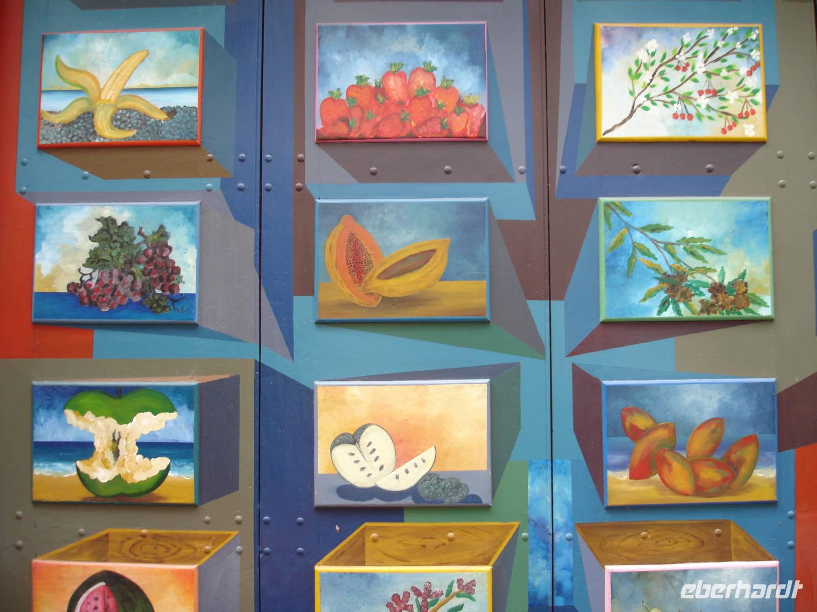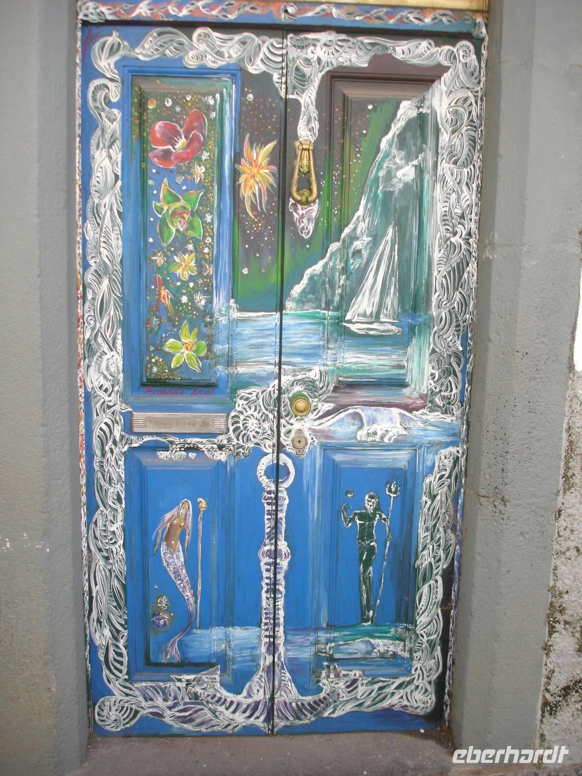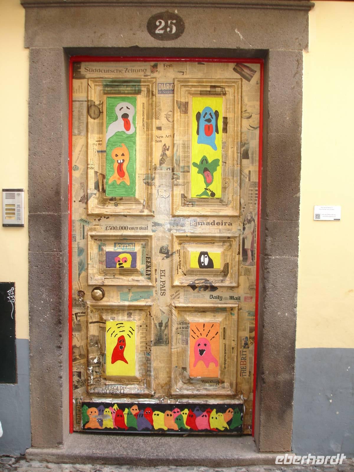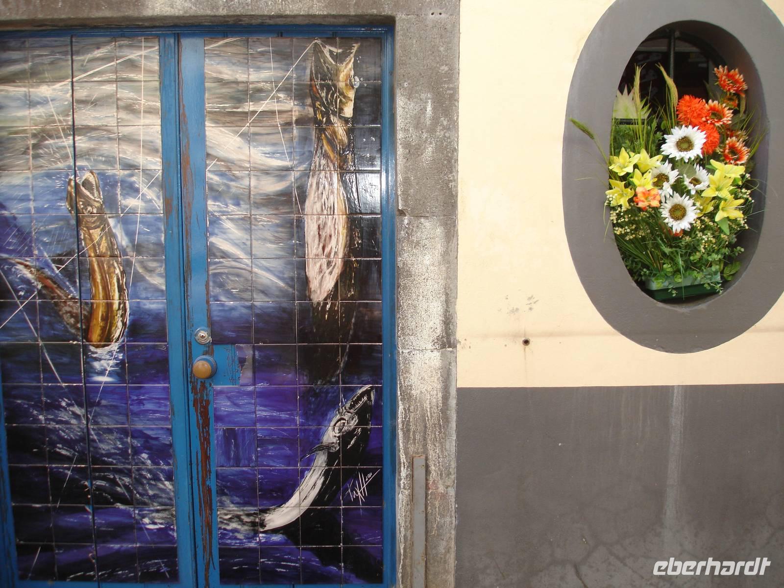 Die Zeit verging so schnell und schon standen wir vor der großen Markthalle. Jetzt sahen wir den berühmten schwarzen Degenfisch in Natur, welcher nur Nachts gefangen und hier von den Fischern an "nur männliche Käufer" angeboten wird. Wir kosteten von den vielen Früchten Madeiras wie Papaya, Maracuja, süßen Bananen oder Anoa. Im Anschluß führte uns ein kleiner Stadtrundgang durch die älteste Straße von Funchal - die "Rua da Santa Maria" mit den originellen Türen.