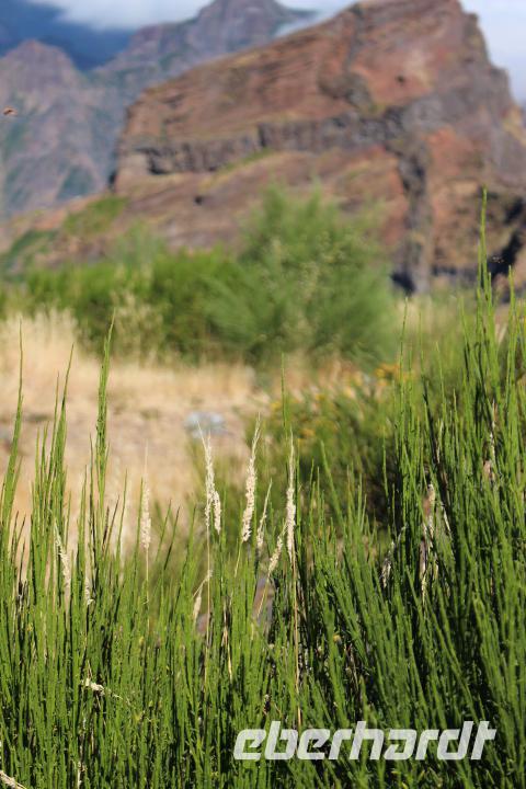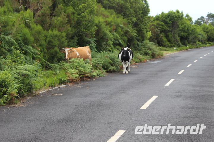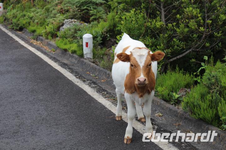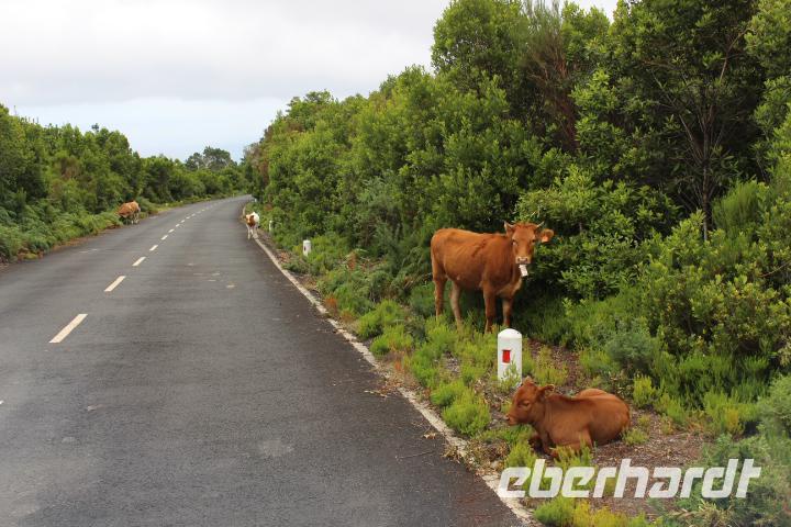 Anschließend fuhren wir nach Ponta de Sol, wo wir einen wunderschönen Blick auf die Steilküste und den Atlantik hatten. Nachdem wir den „Sonnenpunkt" auf verschiedensten Fotos festgehalten hatten, verließen wir die Südküste und fuhren ins Landesinnere. Über den Encumeada-Pass gelangten wir auf die Hochebene Paúl da Serra. Bei einem Fotostopp merkten wir gleich, dass es hier in einer Höhe von 1.400 Metern etwas frischer war als kurz zuvor noch am Atlantik. Kurze Zeit später entdeckten wir einige Kühe am Straßenrand mit ihren Kälbern. Für besondere Belustigung sorgte eine Kuh mit einer leeren Zigarettenschachtel im Maul, welche sich damit zum begehrten Fotomotiv machte.