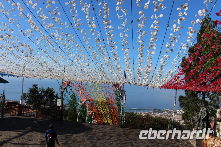 Nachdem wir auch heute wieder von den ersten Sonnenstrahlen geweckt worden waren, trafen wir uns wieder pünktlich um 9.00 Uhr, um zunächst gemeinsam nach Monte zu fahren. Da in wenigen Tagen Maria Himmelfahrt bevor stand und dieses Fest in Monte besonders groß zelebriert wird, war die Stadt schon festlich mit bunten Papierblumen geschmückt. Auch die Kapelle „Nossa Senhora do Monte", welche wir uns anschauten, wurde für dieses Fest gerade neu dekoriert, indem frische Blumen gebracht wurden. Einige genossen auch den traumhaften Panorama-Blick vom Turm der Kapelle.